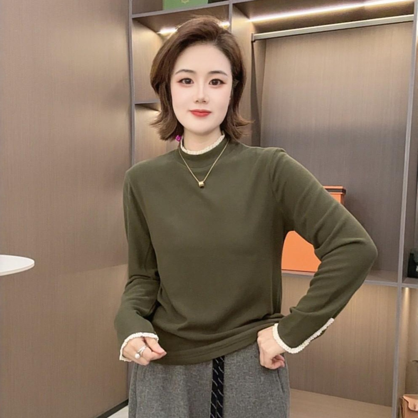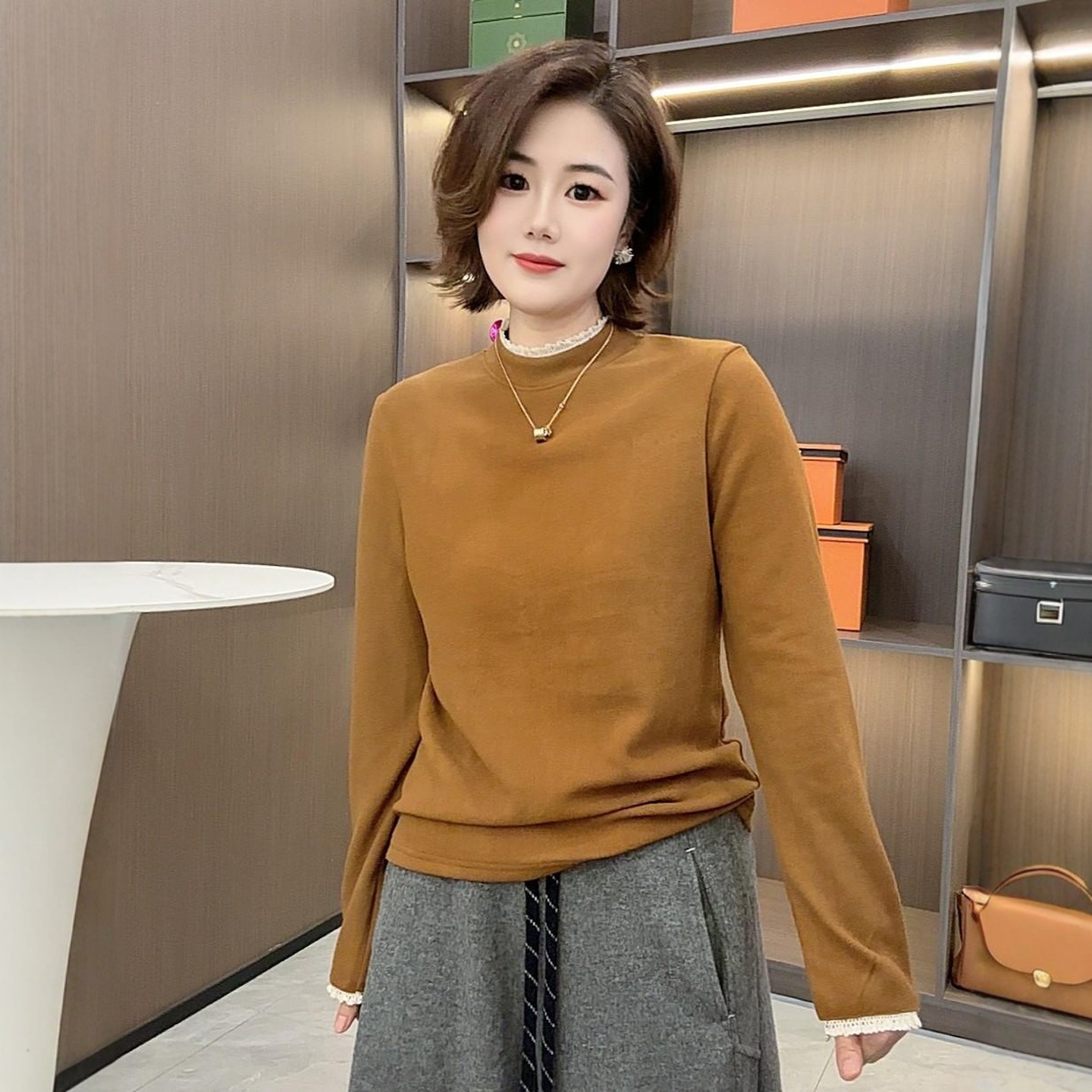 秋冬款花边圆领双面绒长袖小衫女是撒花时尚简约百搭保暖打底衫