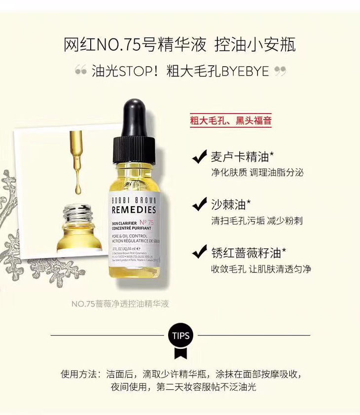 Bobbi Brown芭比布朗No.75控油精油14ml 🍒大火的一瓶~ 细致毛孔和控油的神器!🍓精油质地有一定的流动性,不会闷痘,效果简直惊艳!谁用谁知道!☘️☘1⃣️锈红蔷薇籽油:收敛毛孔2⃣️沙棘油:清除毛孔污垢,减少粉刺黑头3⃣️麦卢卡精油:精华肤质,调节油脂分泌✨特别适合痘痘肌和毛孔问题比较大的仙女。