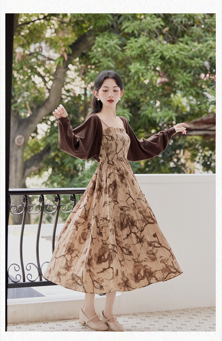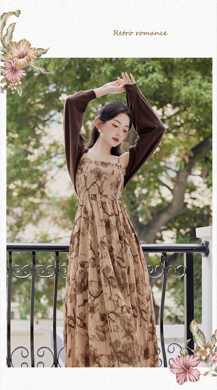 短款长袖机车皮衣外套褶皱碎花吊带连衣裙女秋季2025新款时尚套装