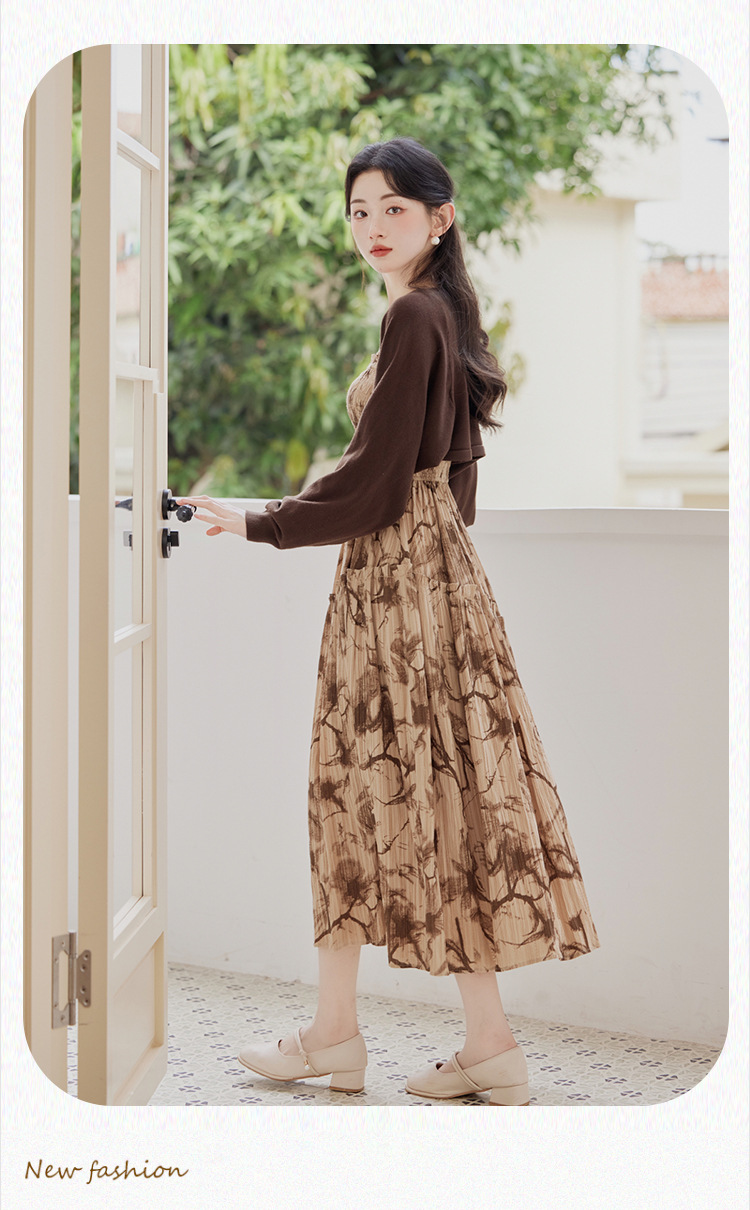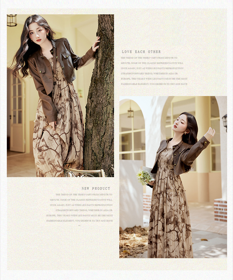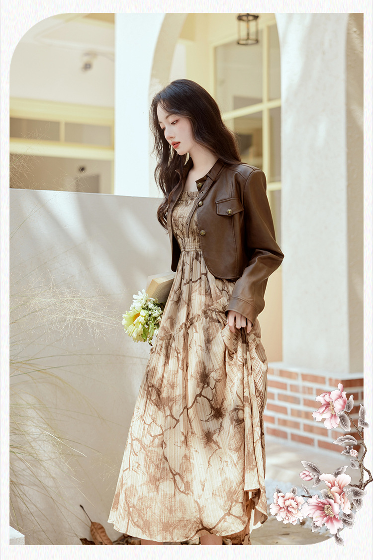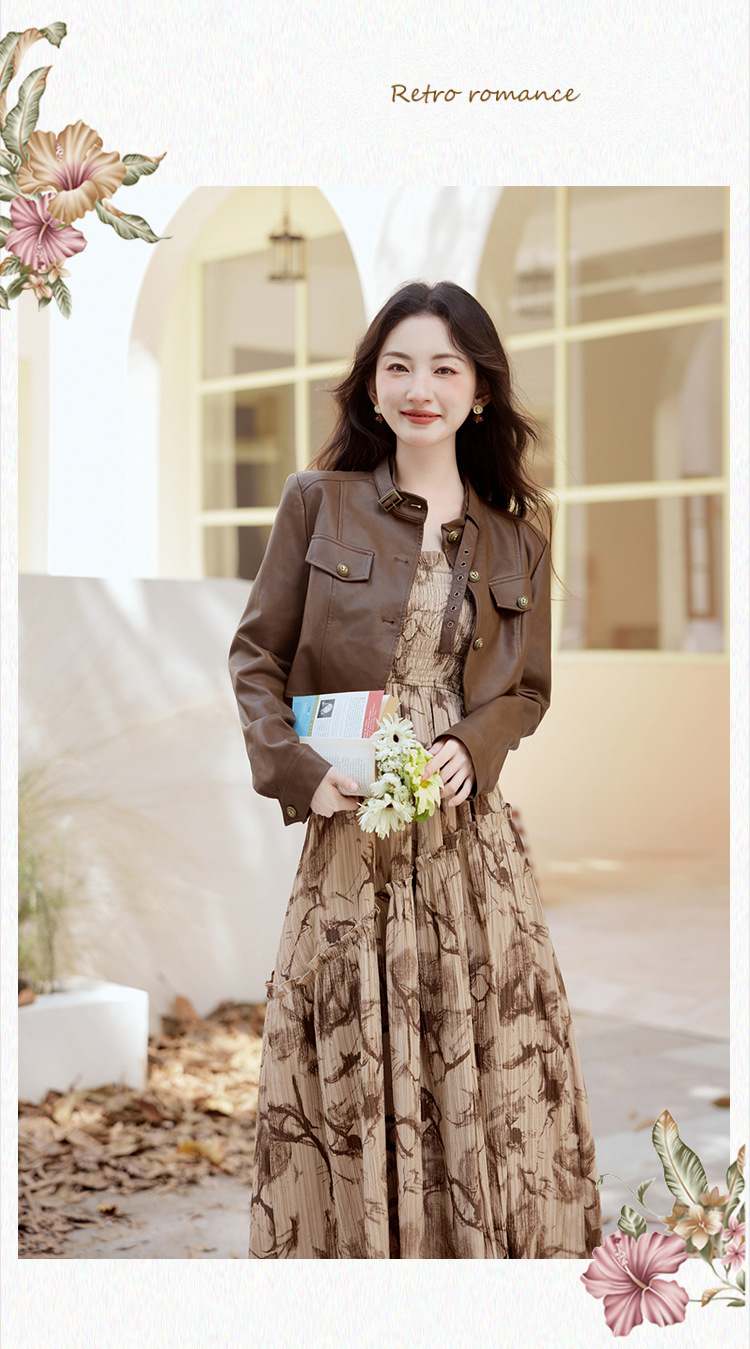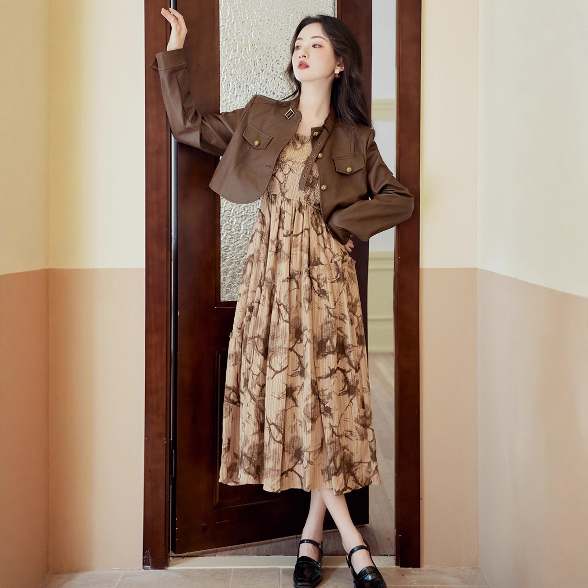 短款长袖机车皮衣外套褶皱碎花吊带连衣裙女秋季2025新款时尚套装 商品图0