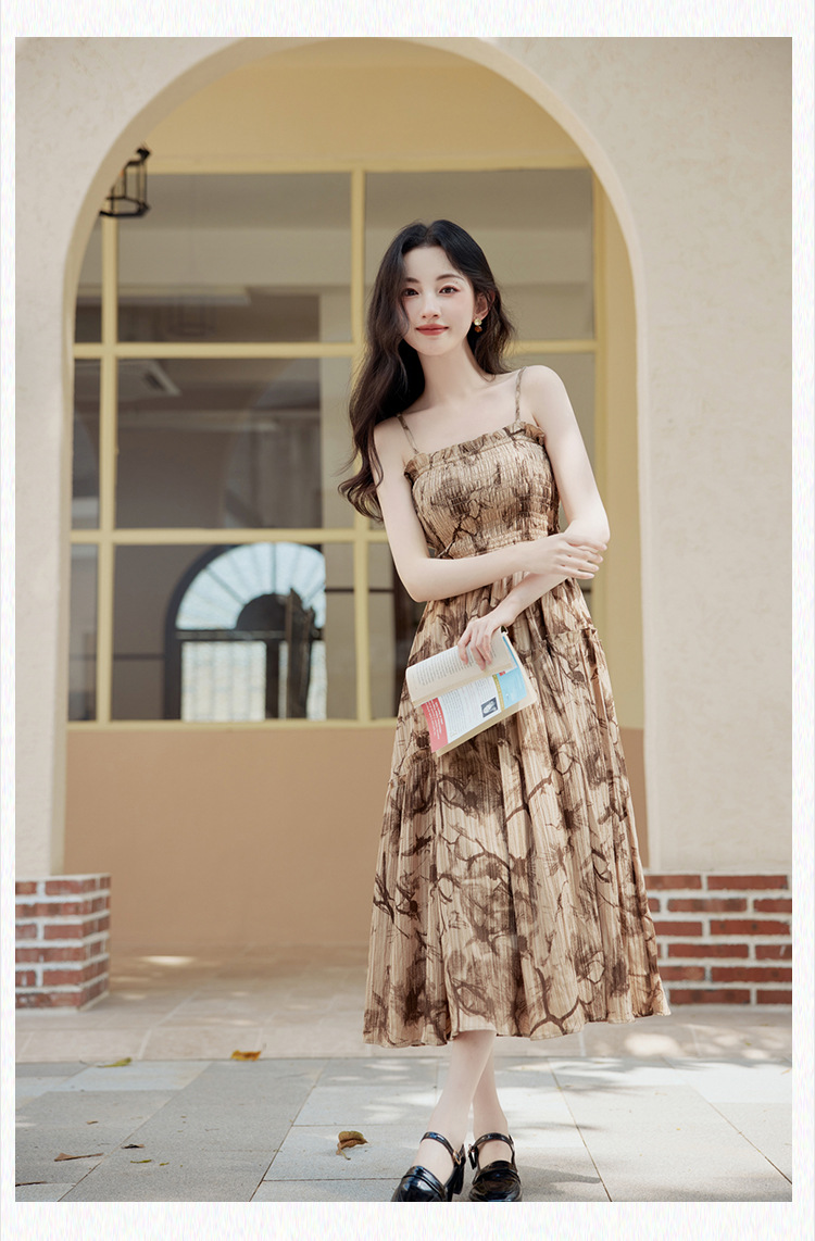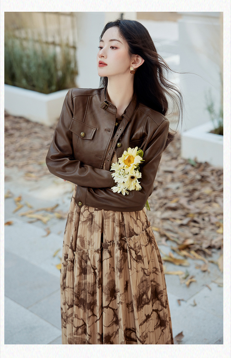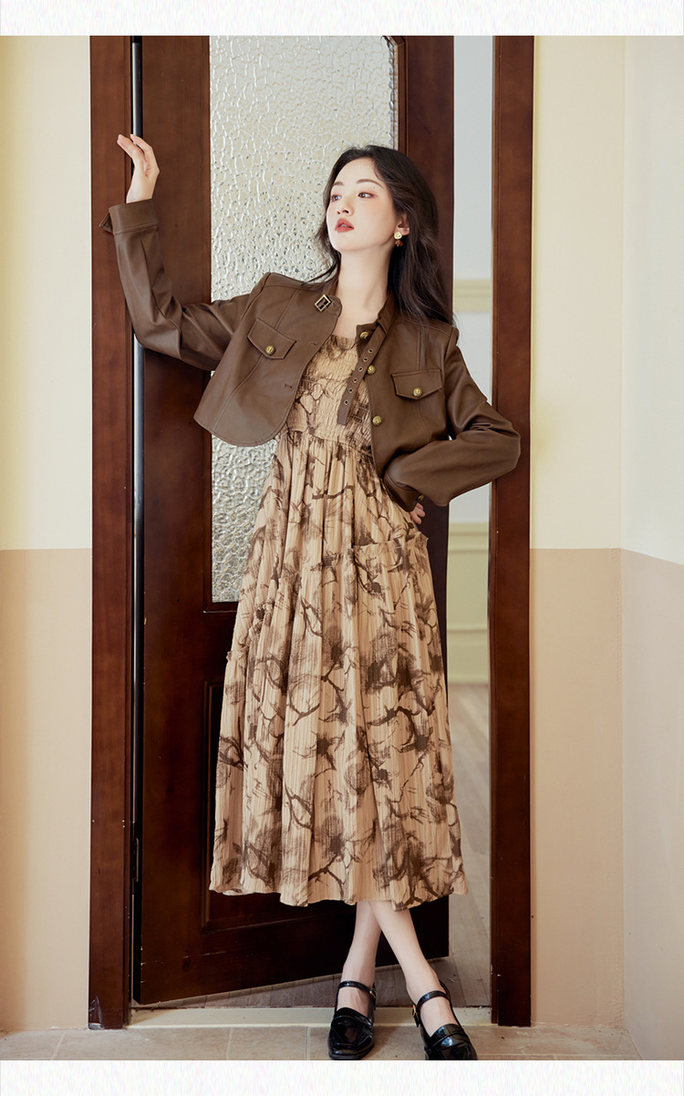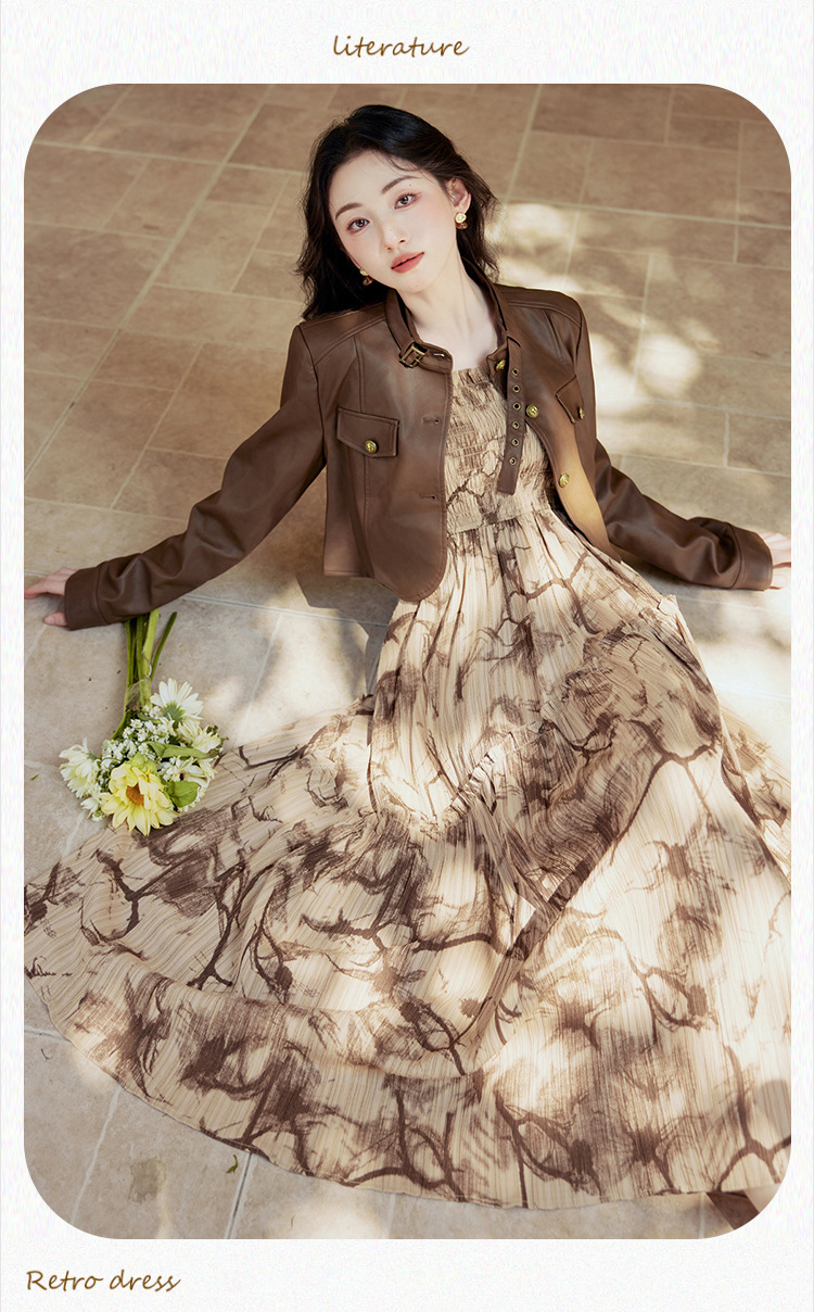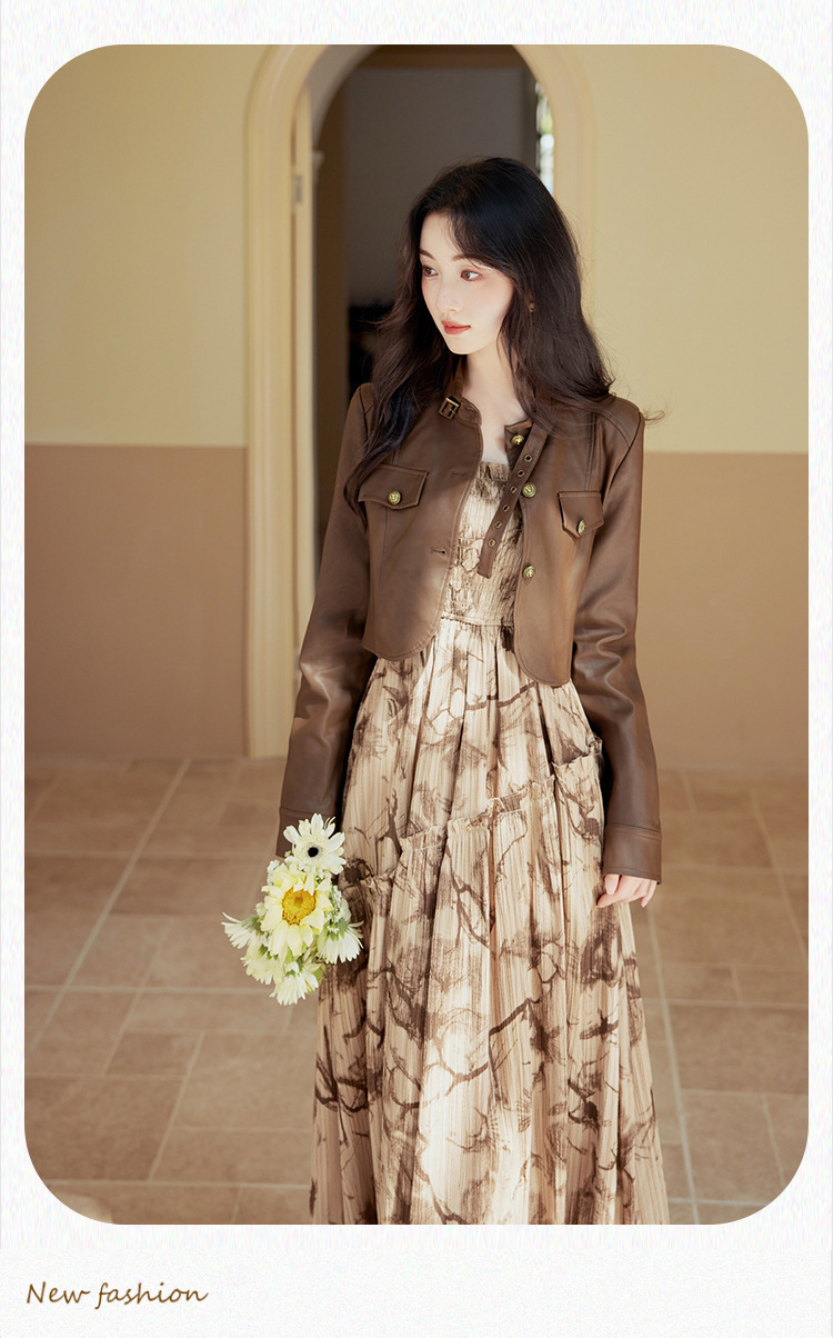 短款长袖机车皮衣外套褶皱碎花吊带连衣裙女秋季2025新款时尚套装 商品图3