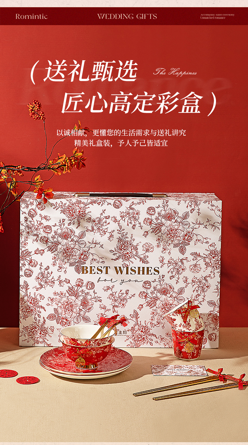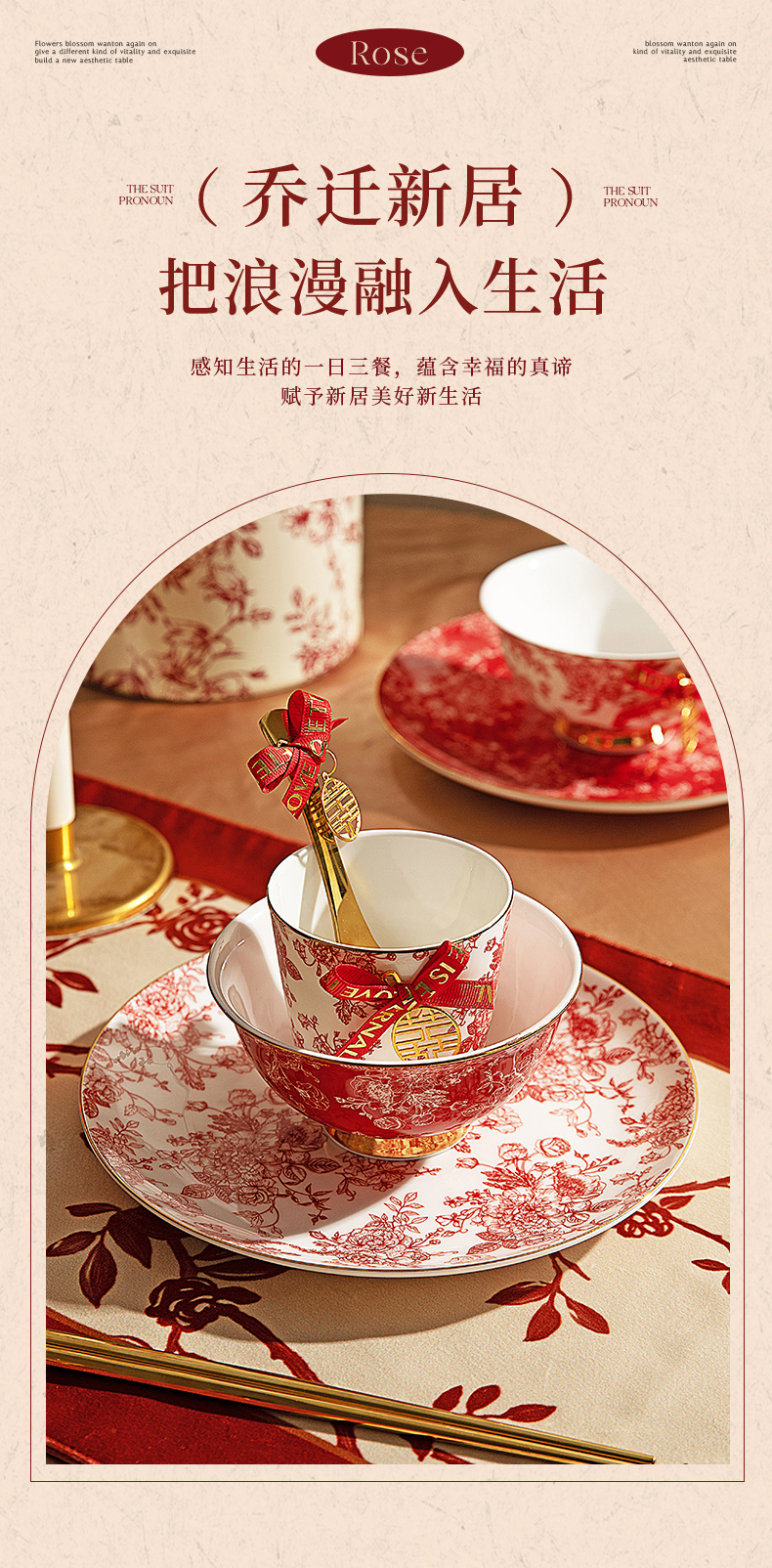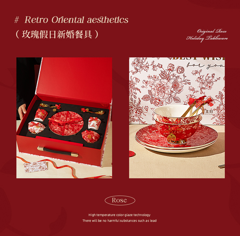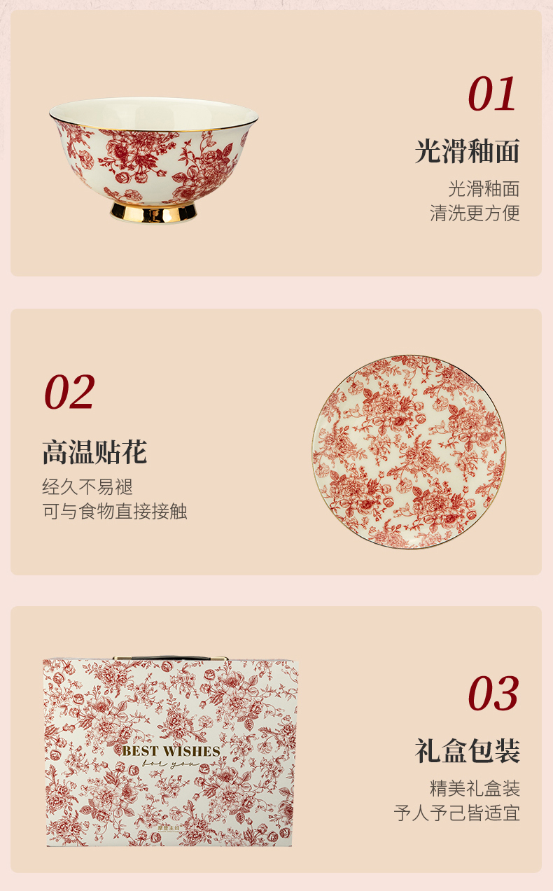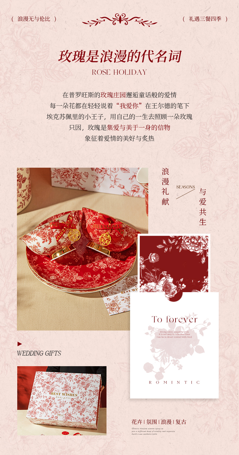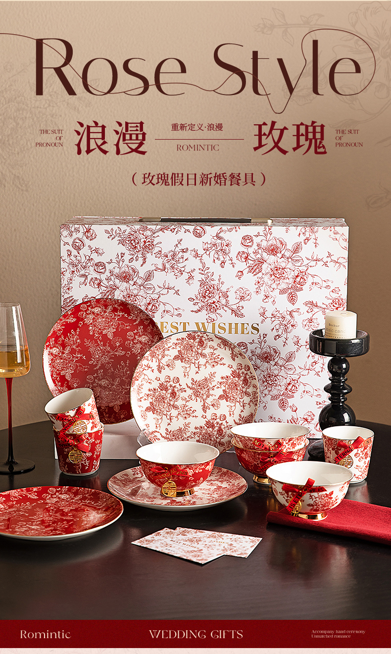 摩登主妇玫瑰假日订婚结婚新婚礼物新年乔迁新居骨瓷碗碟餐具套装