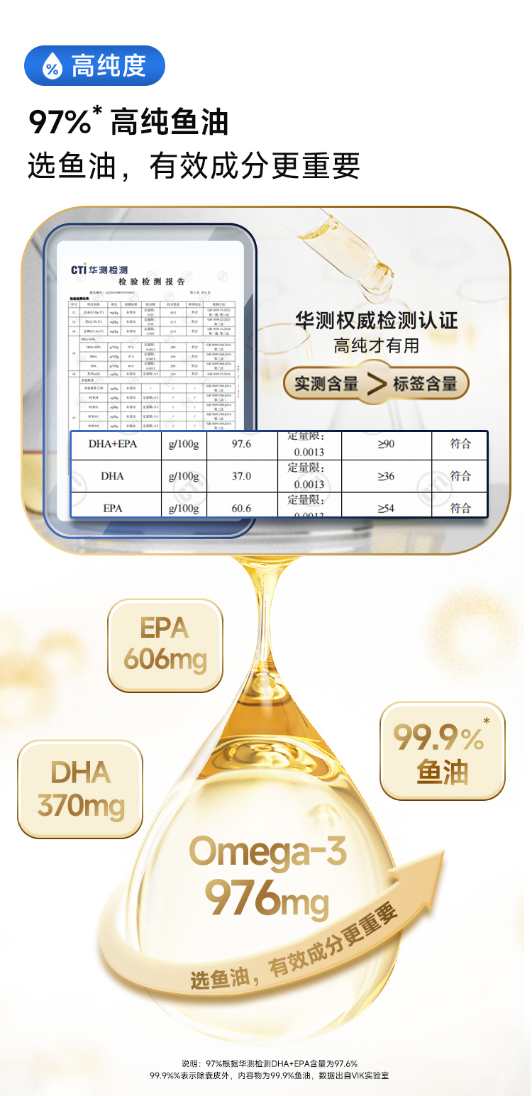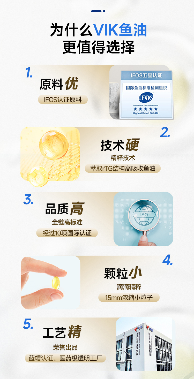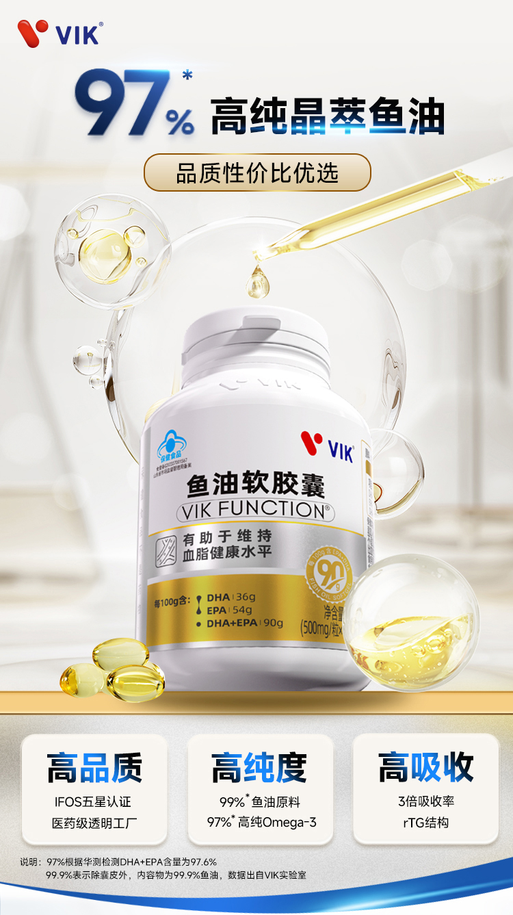 VIK深海鱼油软胶囊 120粒/瓶 97%高纯度omega3 IFOS+蓝帽认证 有助于维持血脂健康水平 DHA EPA