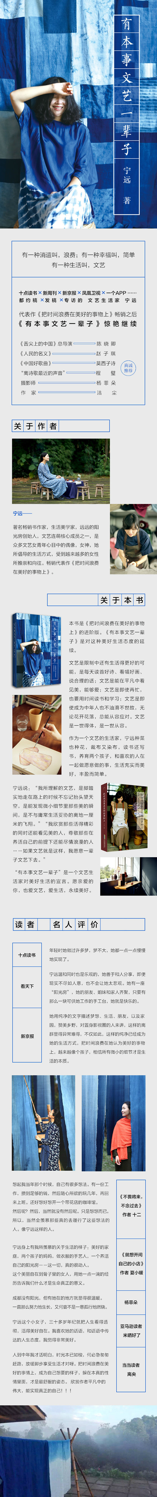 作为一个文艺的生活家,宁远种菜也种花,裁布又染布,读书还写书,养育两个孩子,和喜欢的人在一起做愿意做的事,生活充实而美好,丰盈而简单。