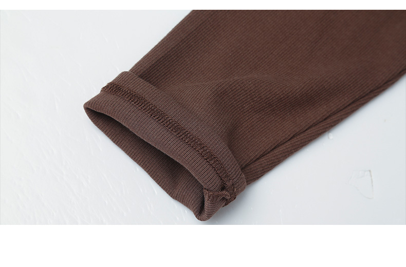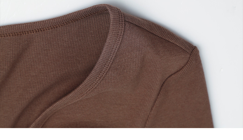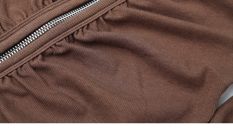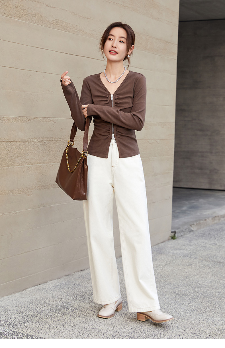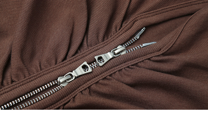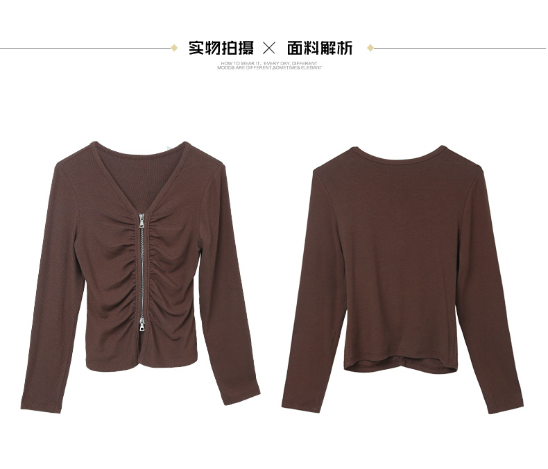 拉链 V 领褶皱修身显瘦棕色长袖上衣