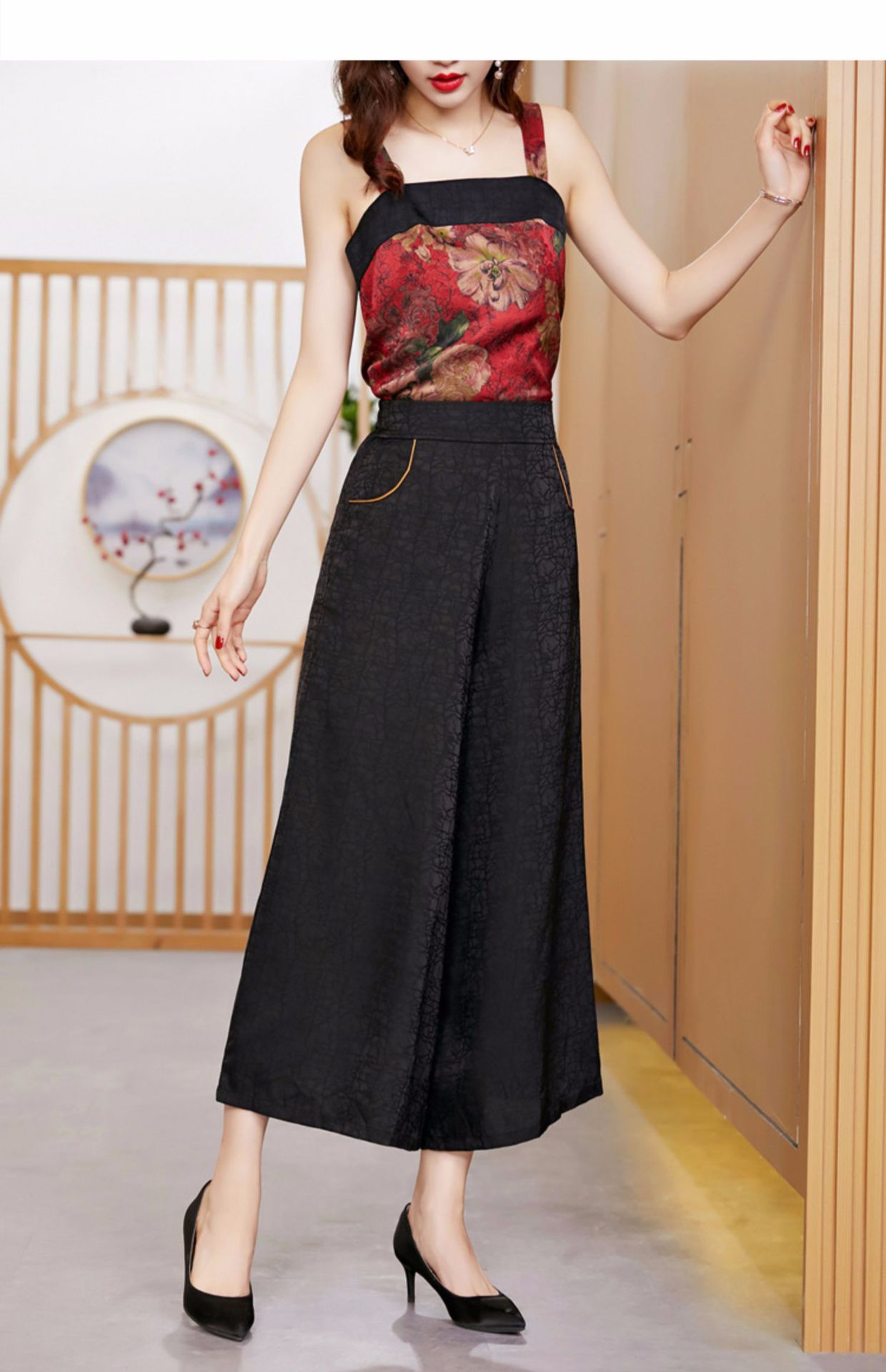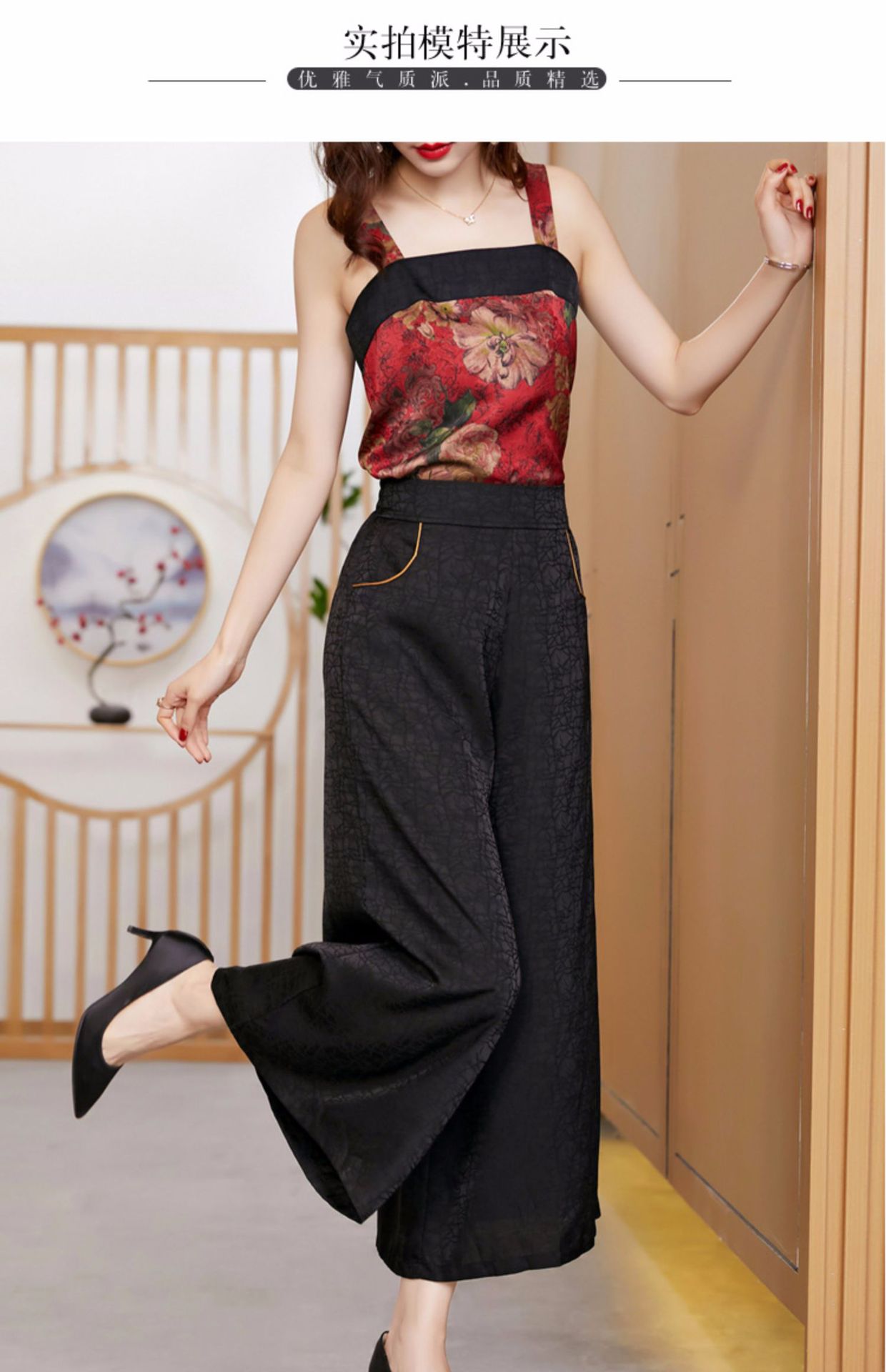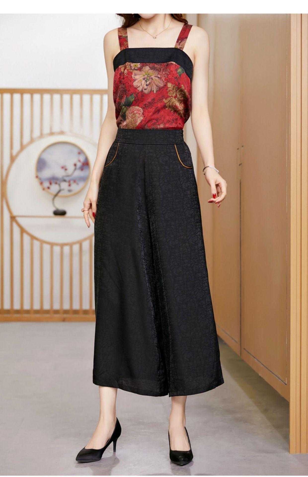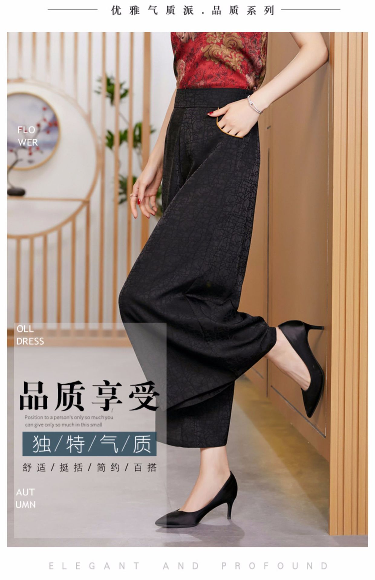 黑色松紧腰大码百搭龟裂纹缎面阔腿裤妈妈装K-E38M2239