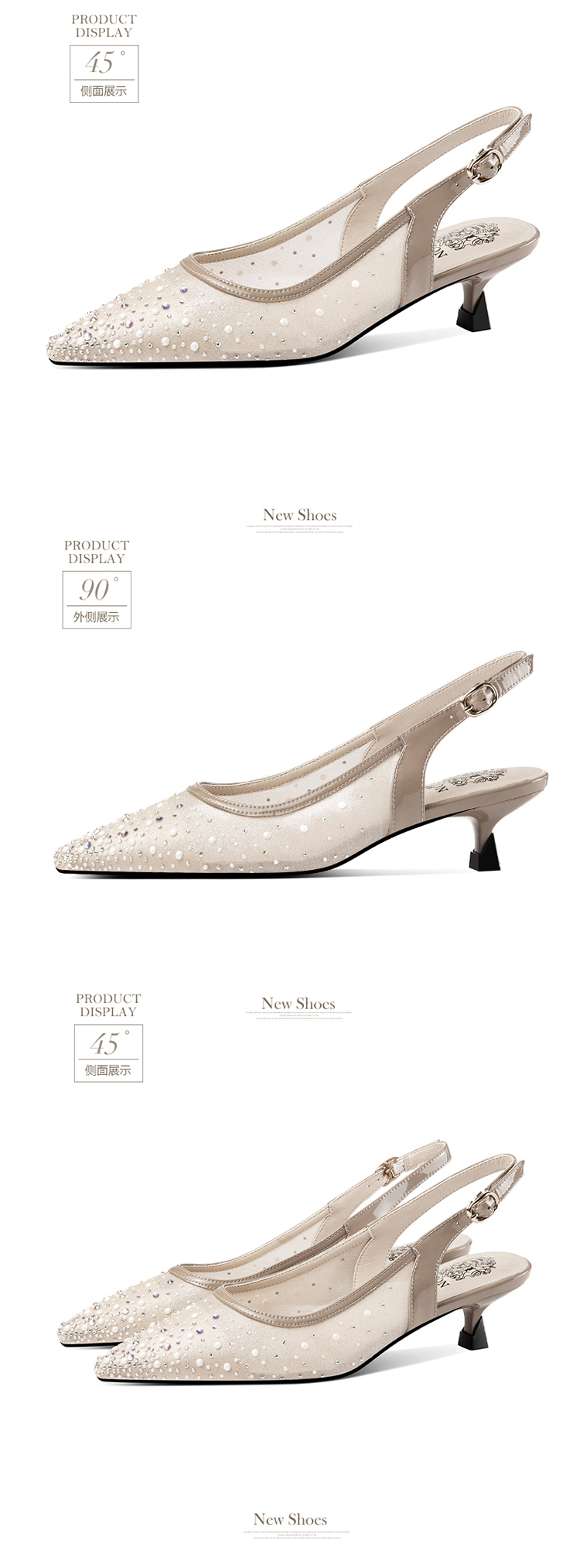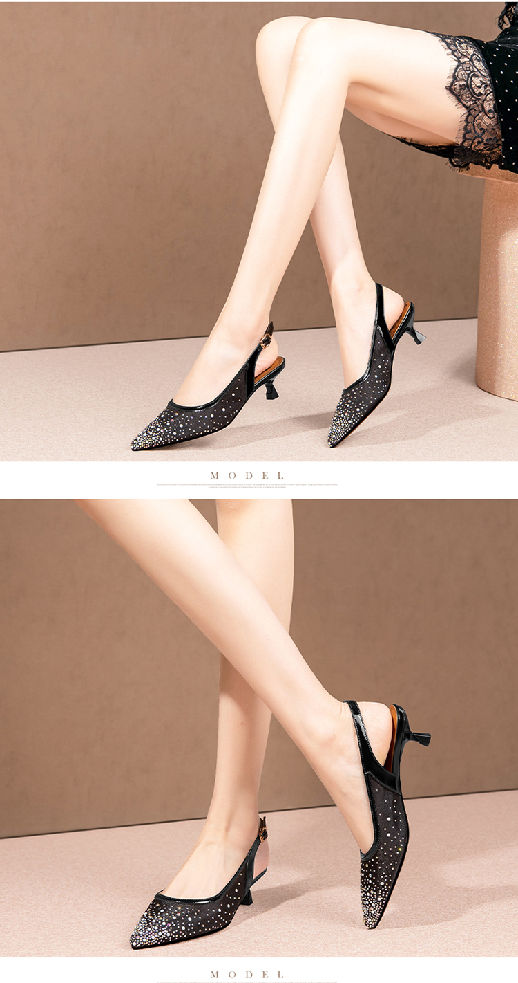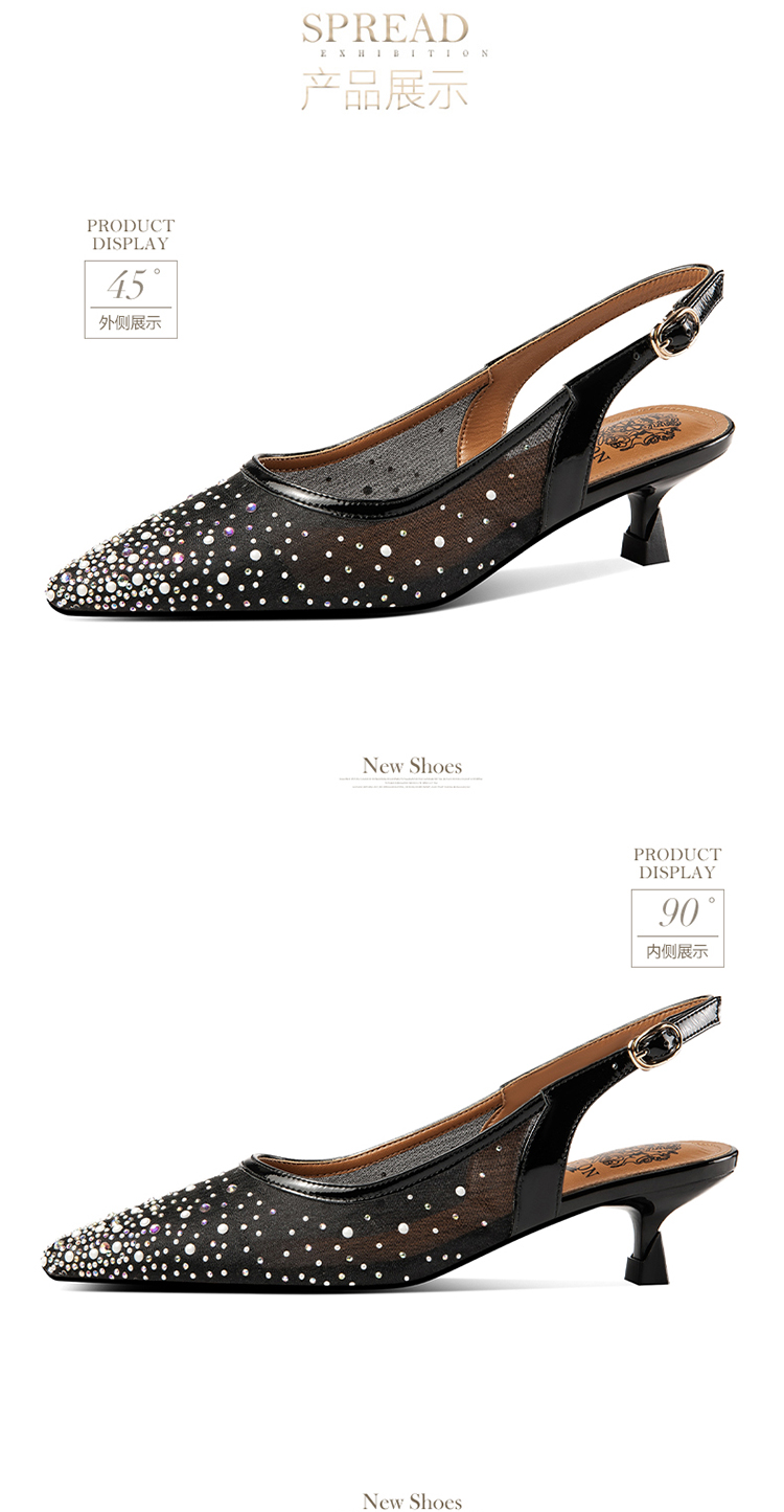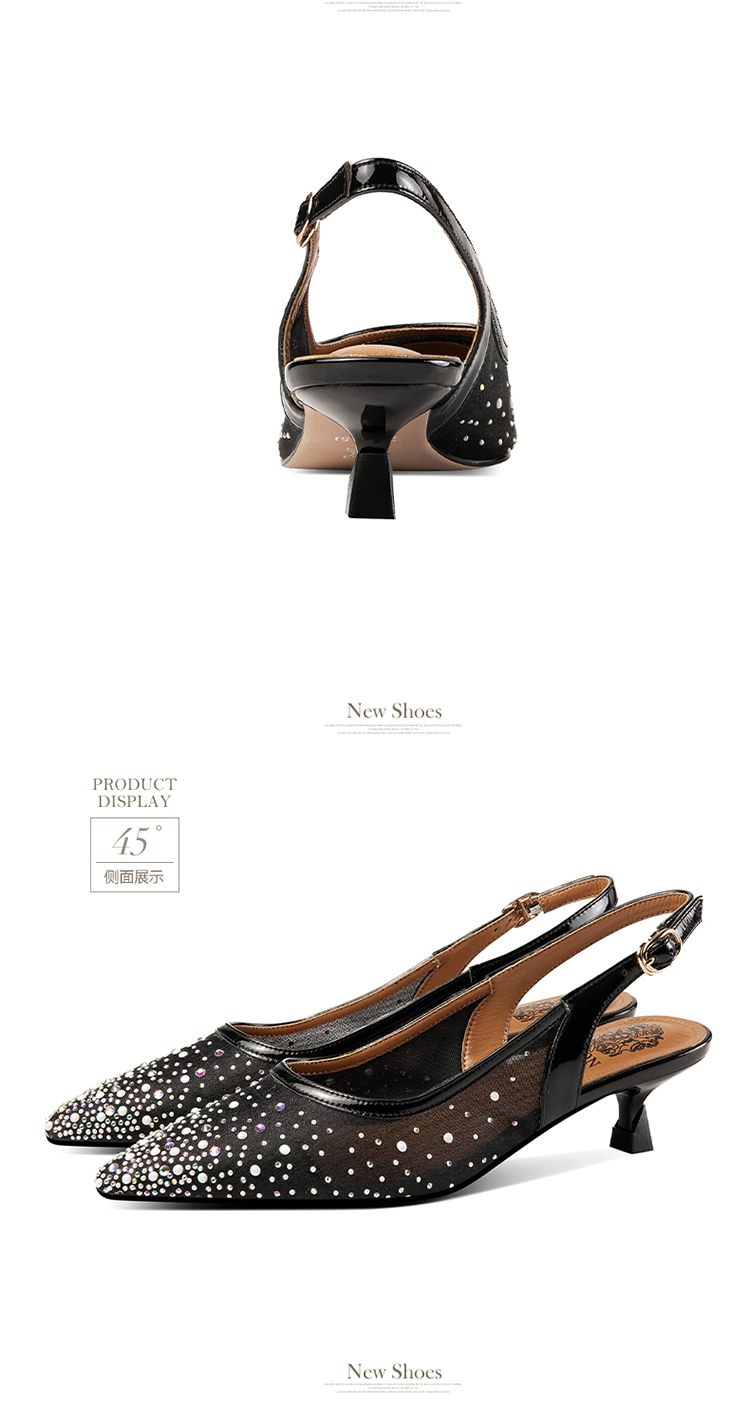 优雅百搭,牛漆皮+网纱尖头镶钻后空凉鞋HY-H3108