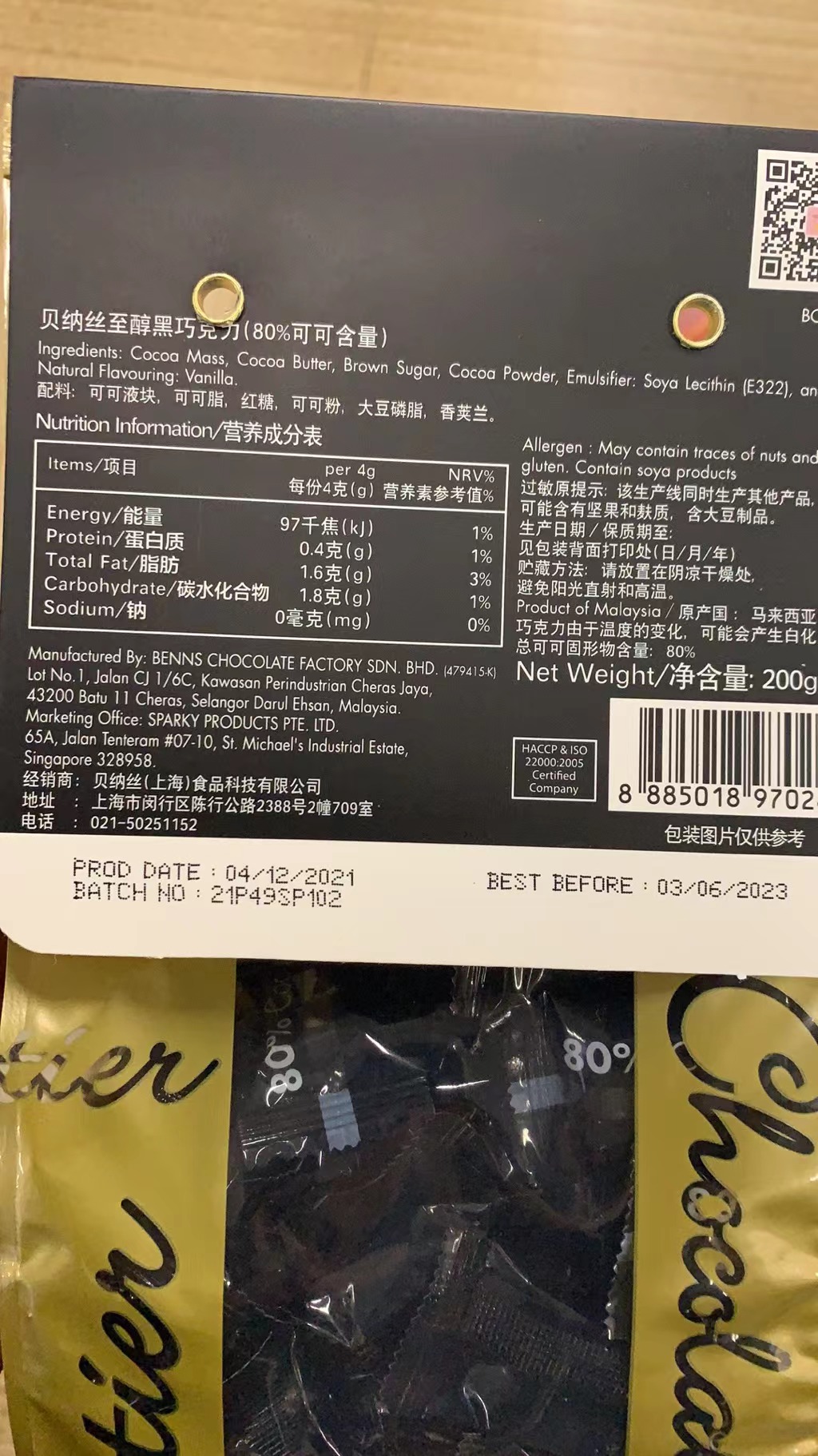 【2.11视频号】200g贝纳丝至醇黑巧克力(80%可可含量/99.9%可可含量)