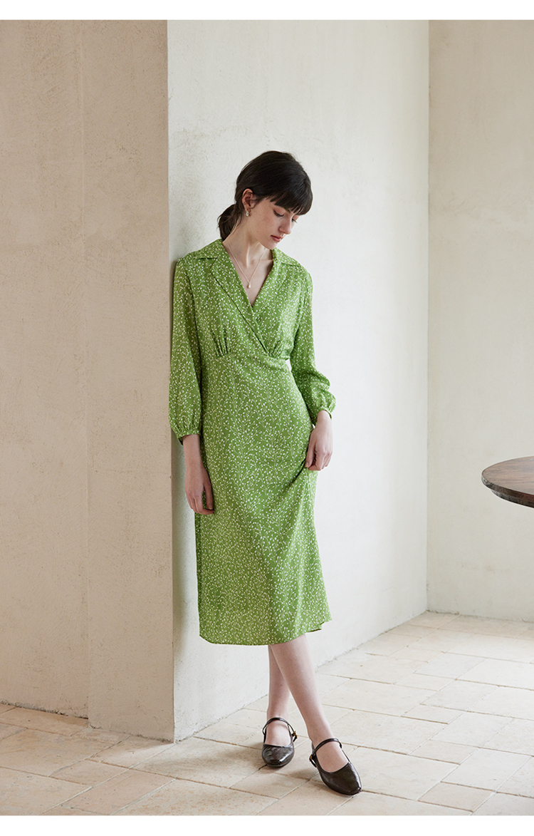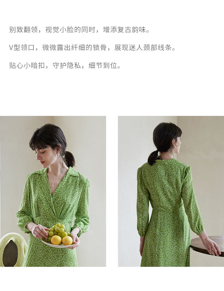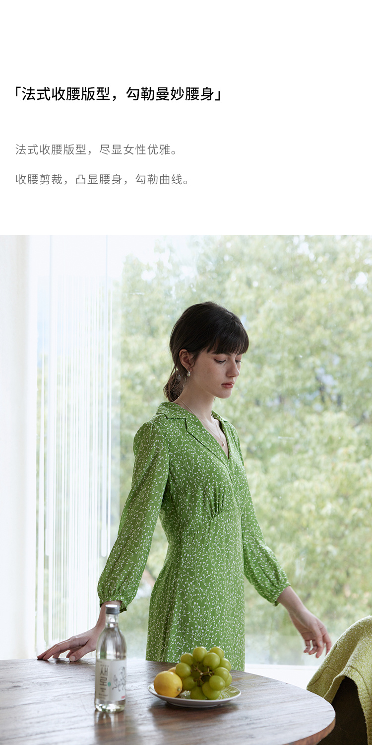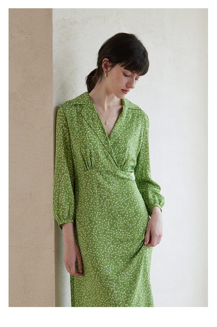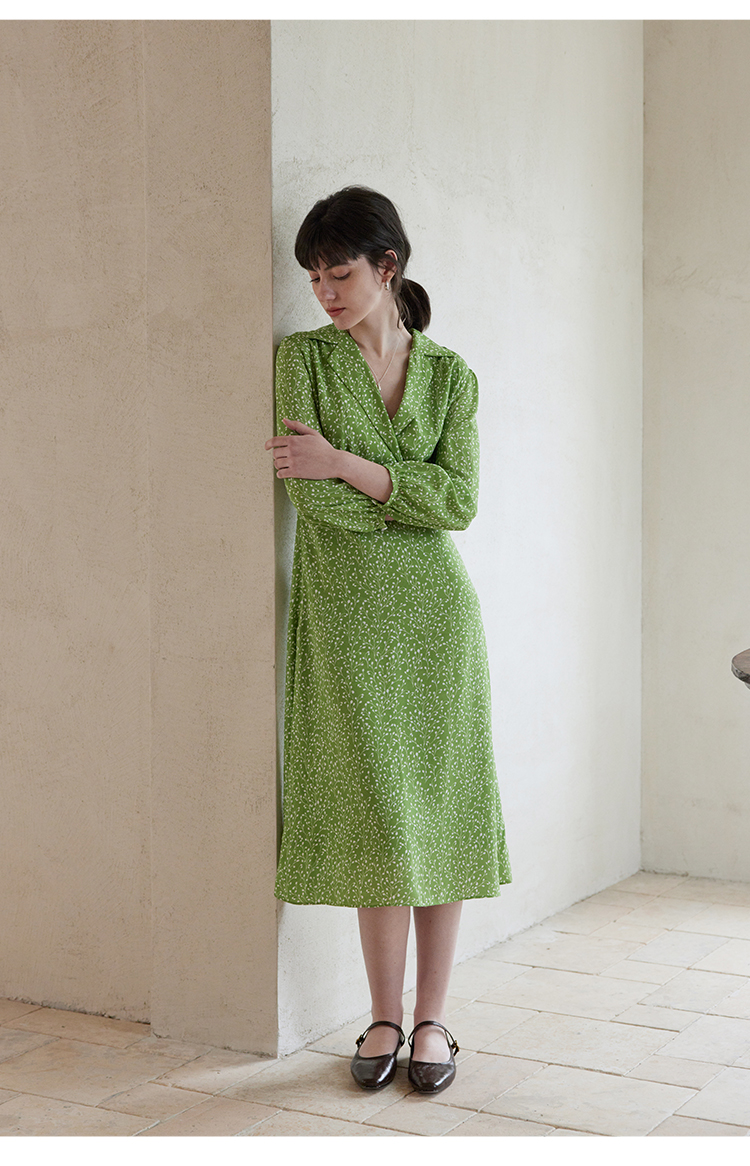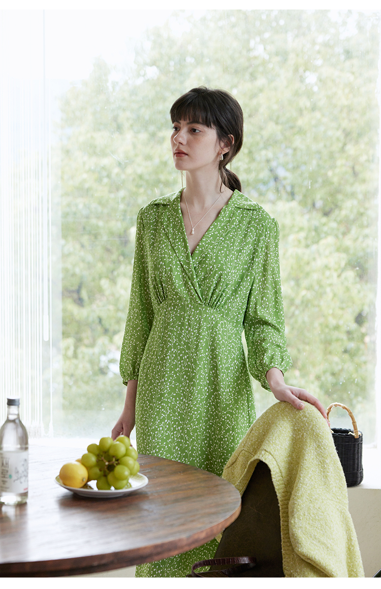 HeyDress绿色碎花连衣裙女春季法式复古翻领收腰设计浪漫印花裙子