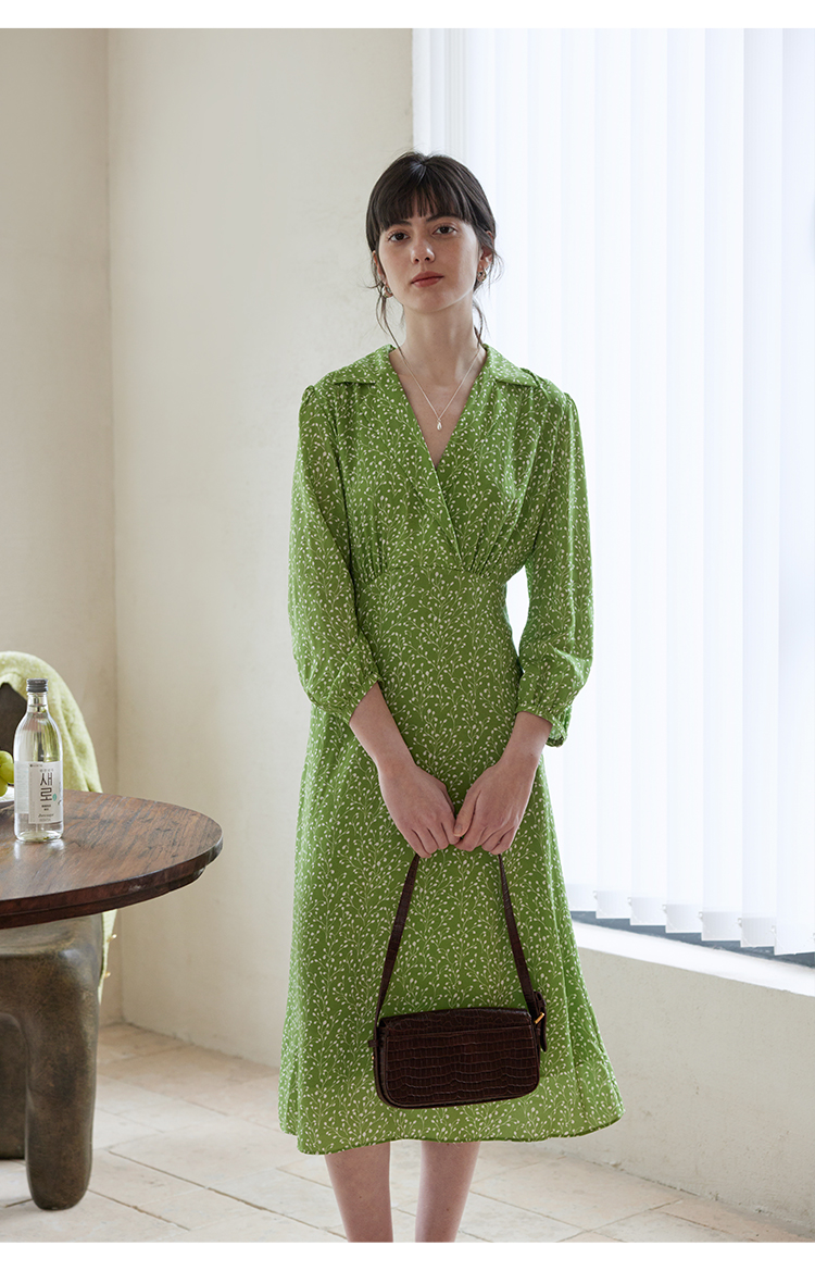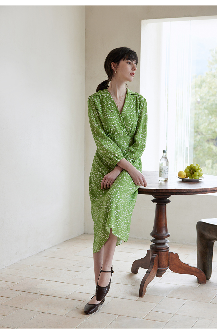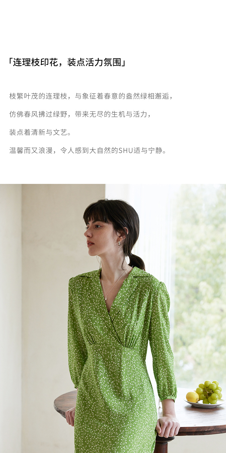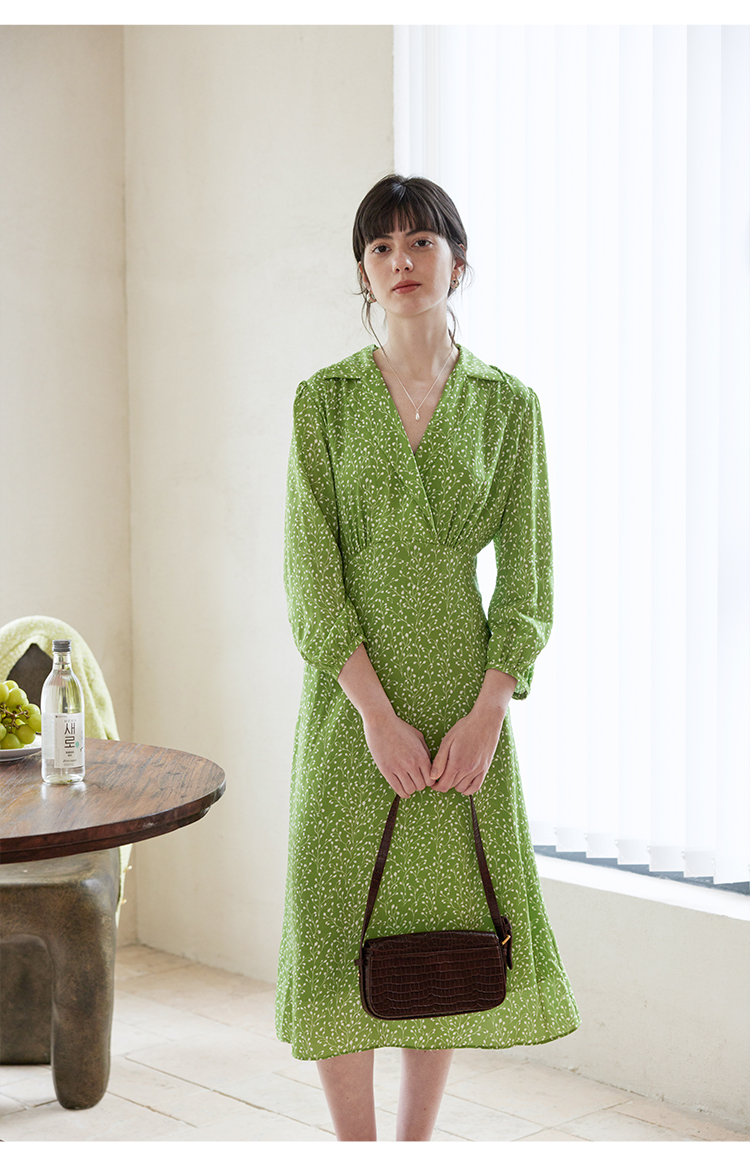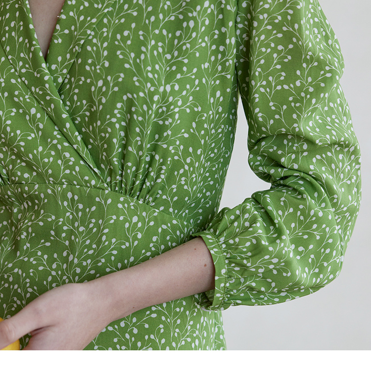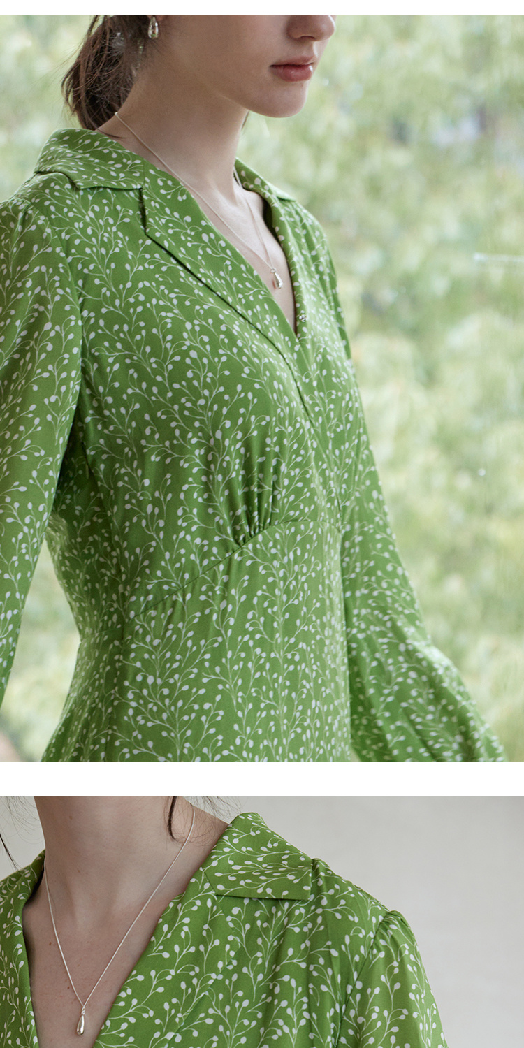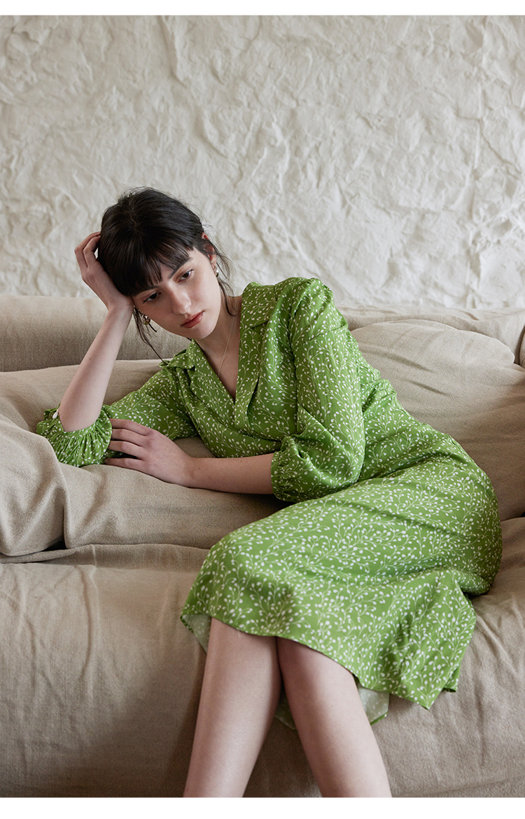 HeyDress绿色碎花连衣裙女春季法式复古翻领收腰设计浪漫印花裙子
