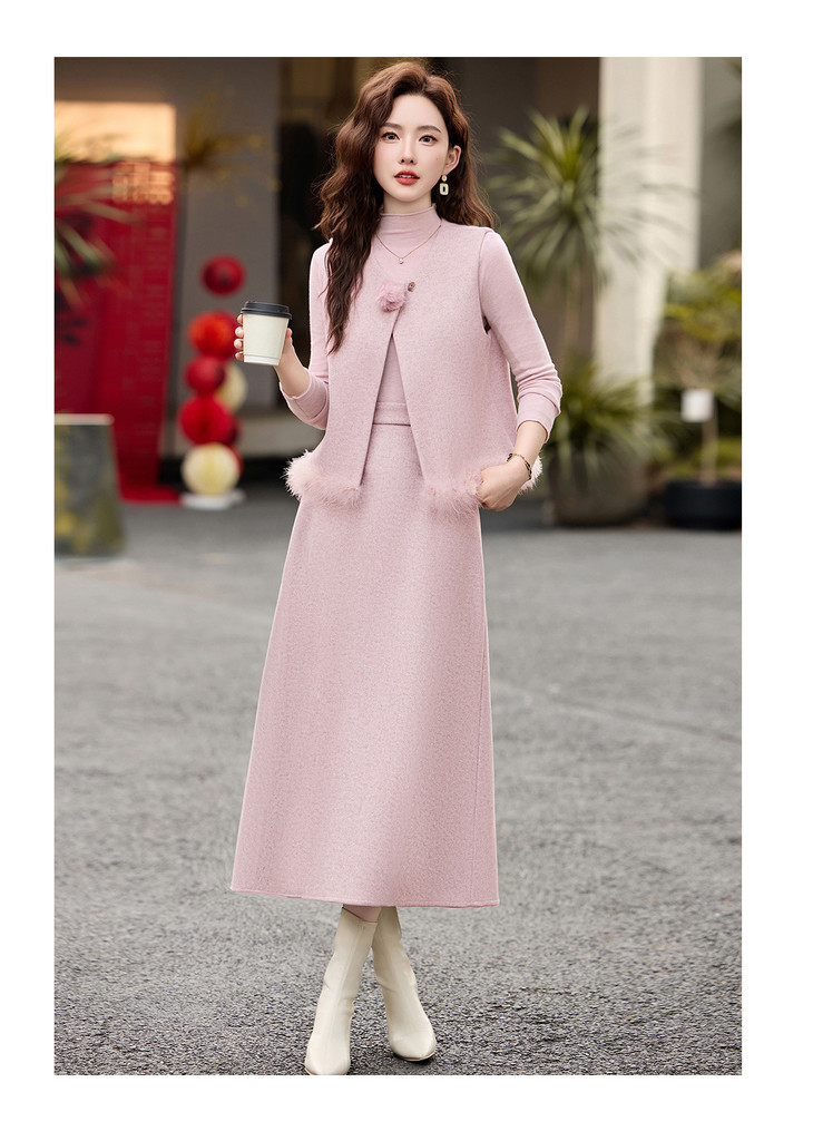 2026春新韩系粉色鸵鸟毛拼接马甲内搭半身裙三件套XXM113 商品图4