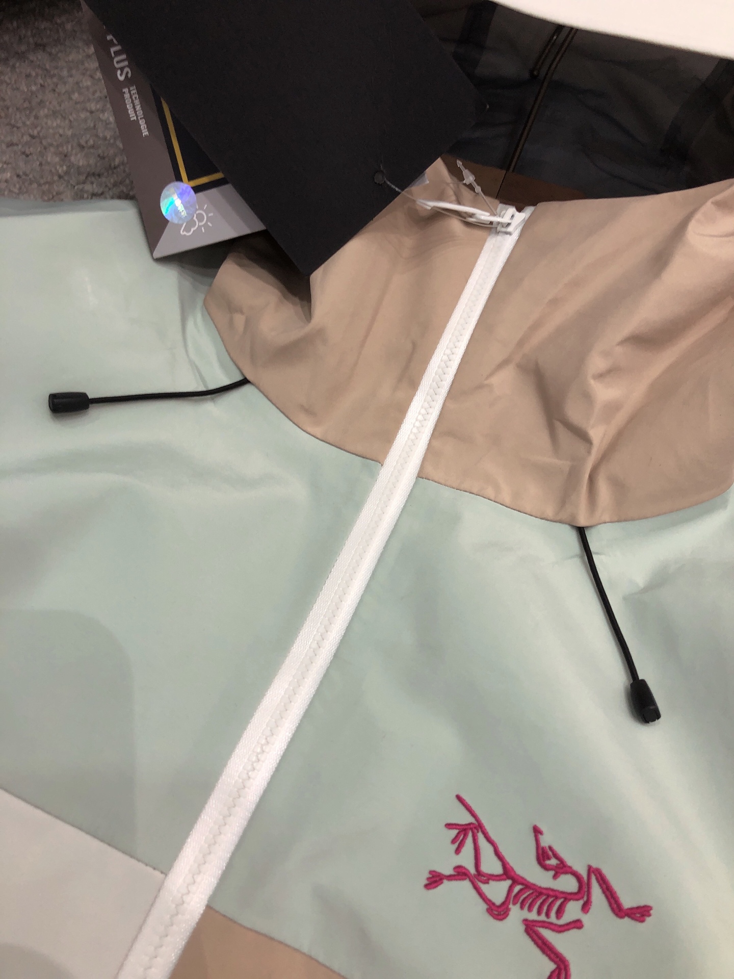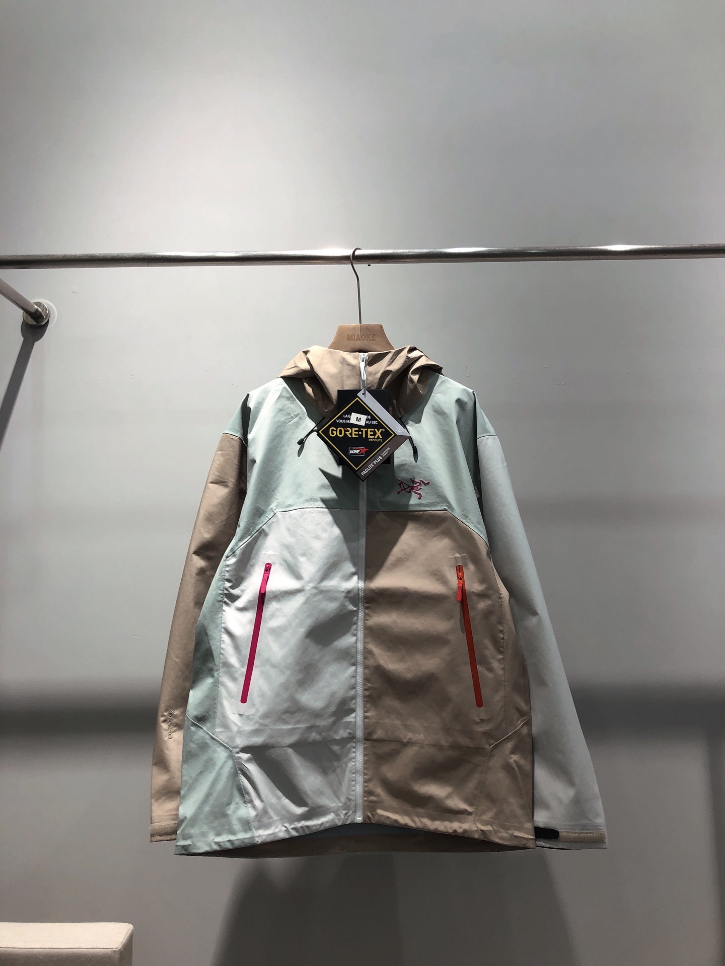-传统风琴交叉反向进入高山口袋设置在高位,VISLON中央正面拉链,可调节Velcro袖口魔术贴标签,兼容Zip-in,在胸前采用百达灵机器绣上了ARC TERYX徽标