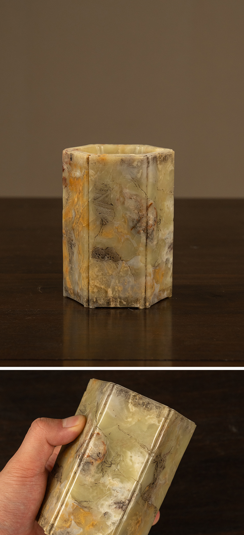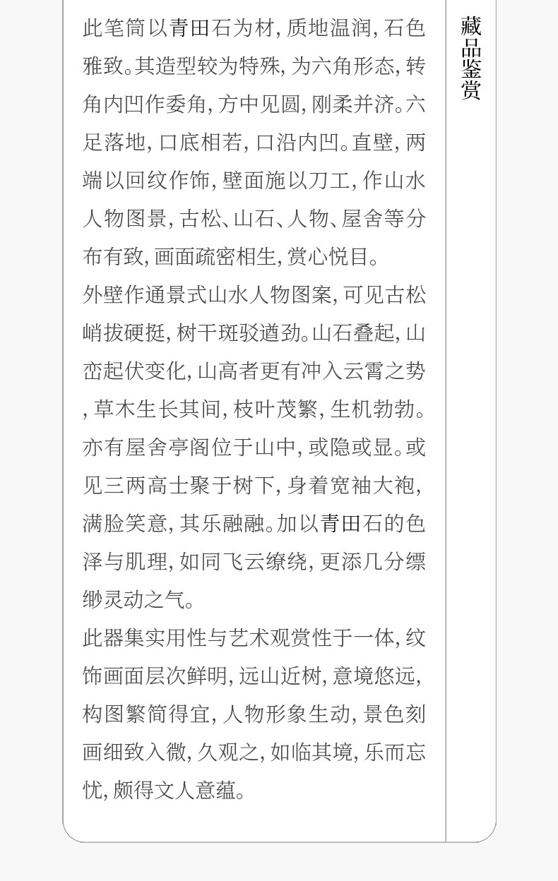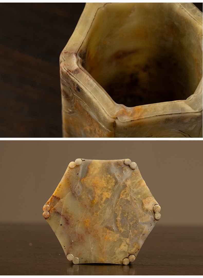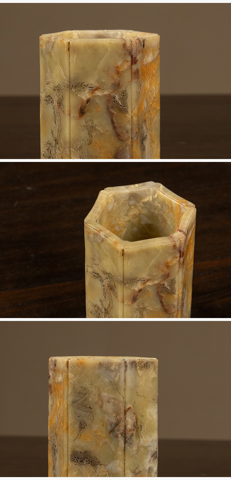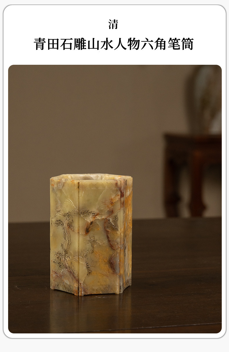 清 青田石雕山水人物六角笔筒