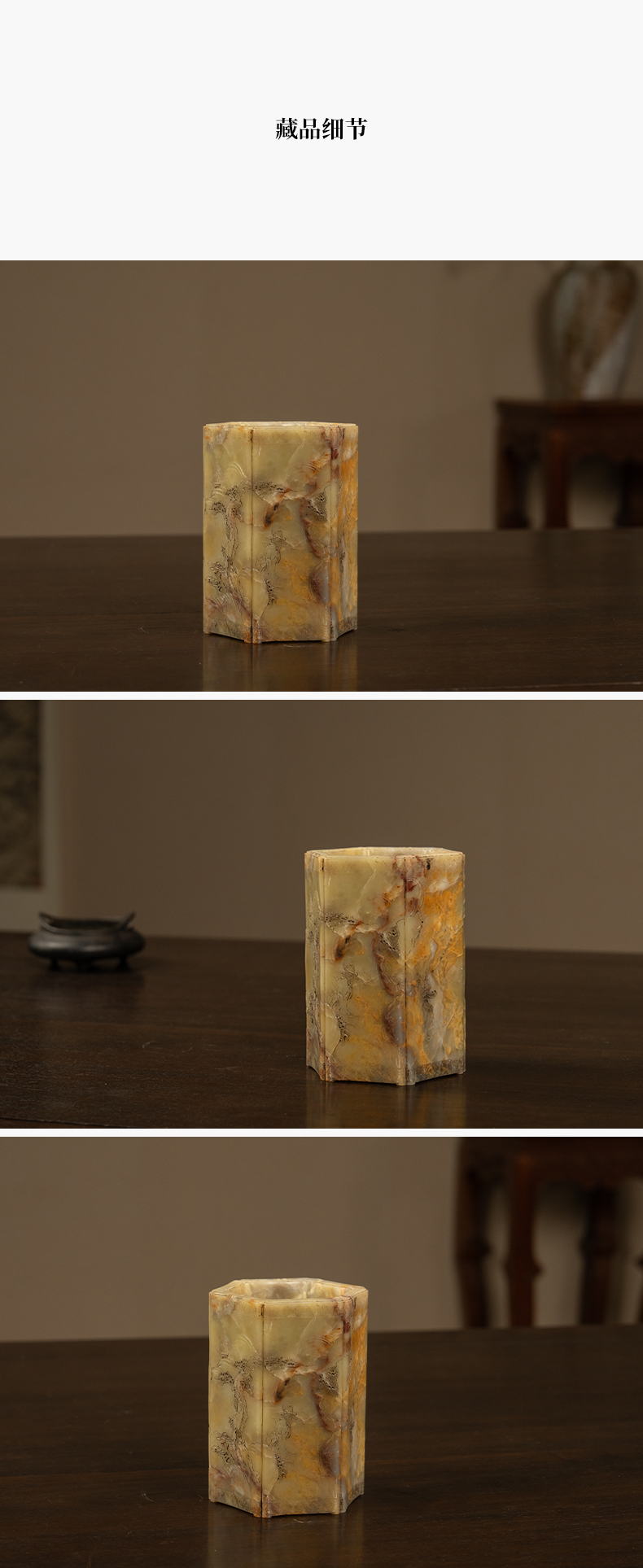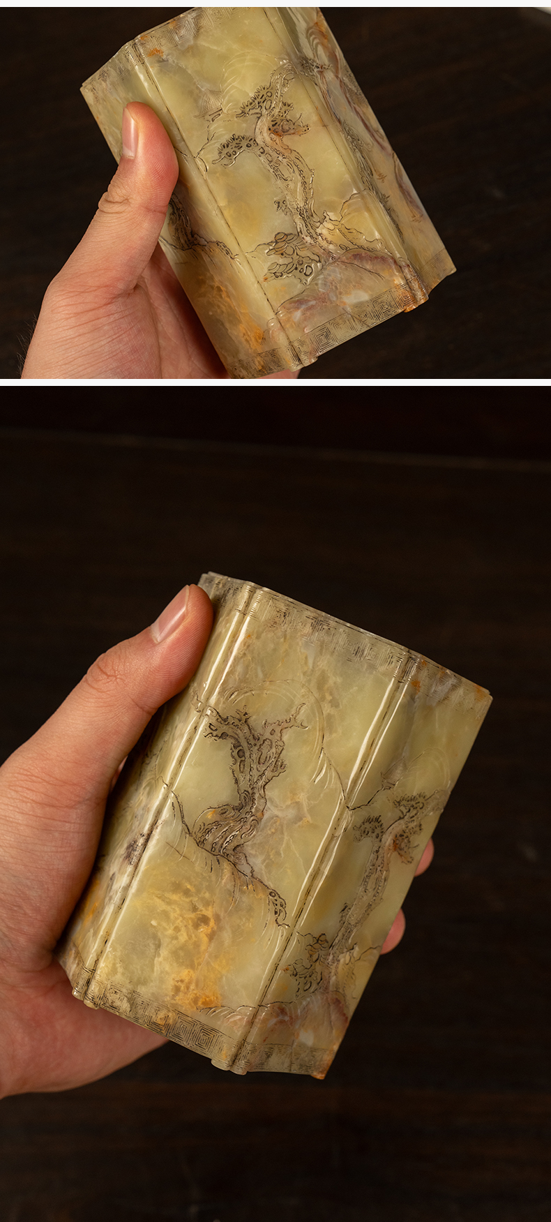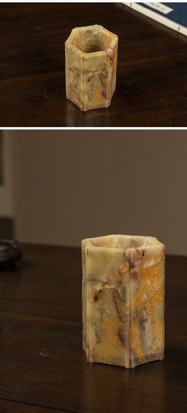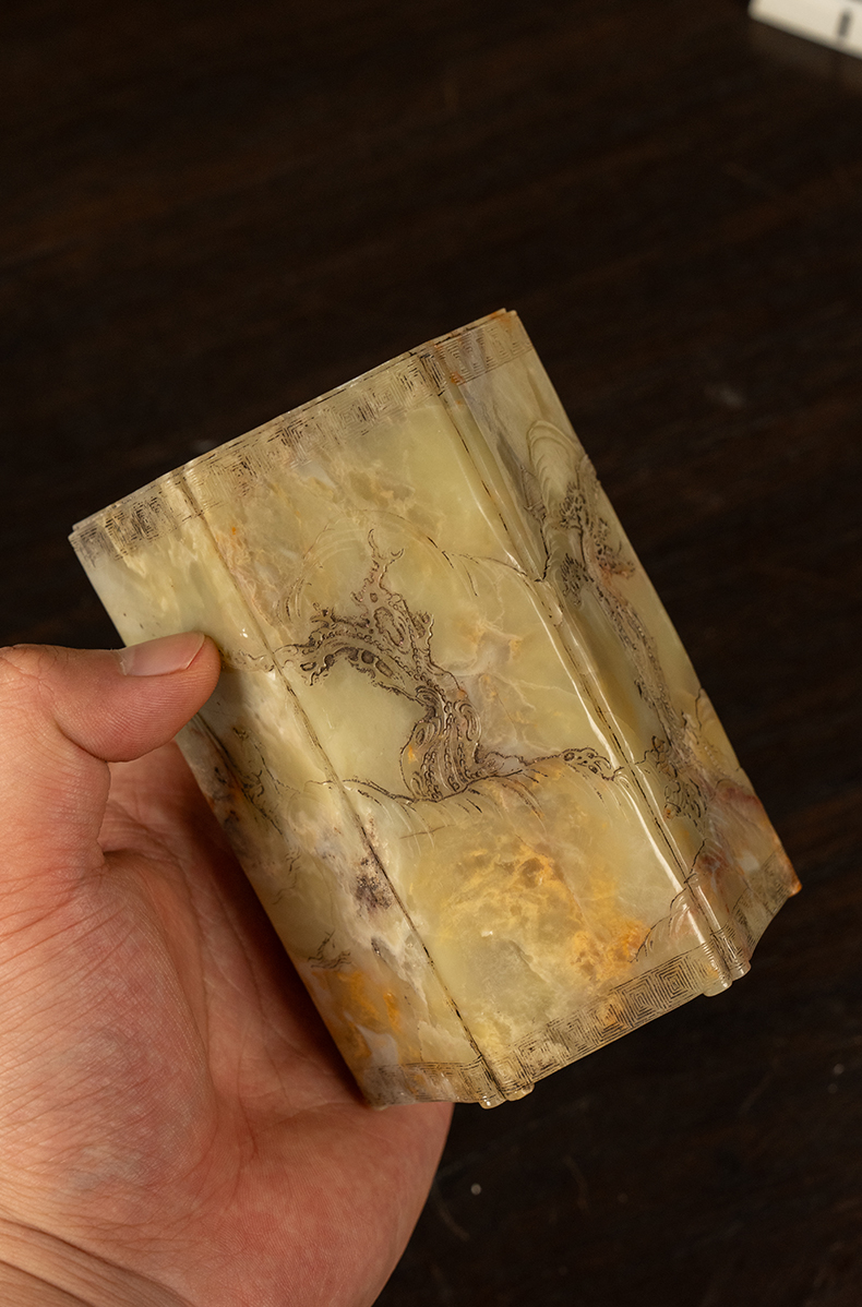 清 青田石雕山水人物六角笔筒