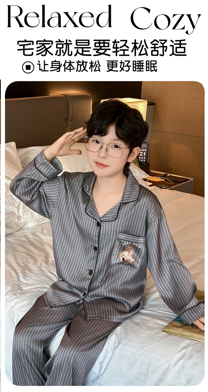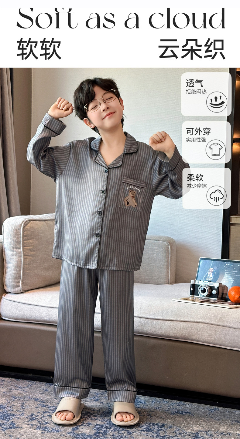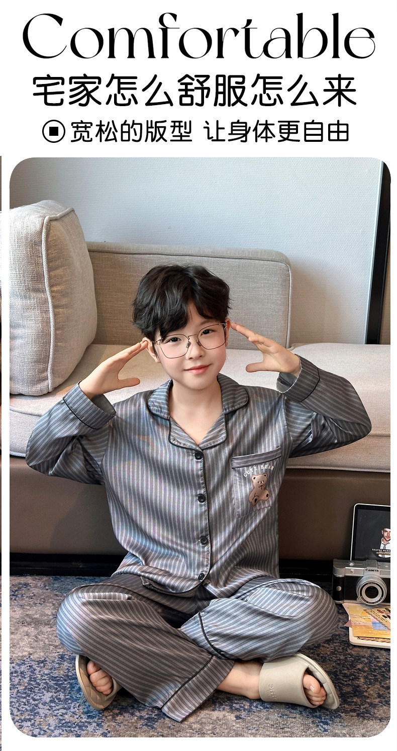 【丝滑凉感❗️柔光高级】儿童春夏季冰丝睡衣男童青少年初中生长袖仿真丝衬衫领家居服套装。jd