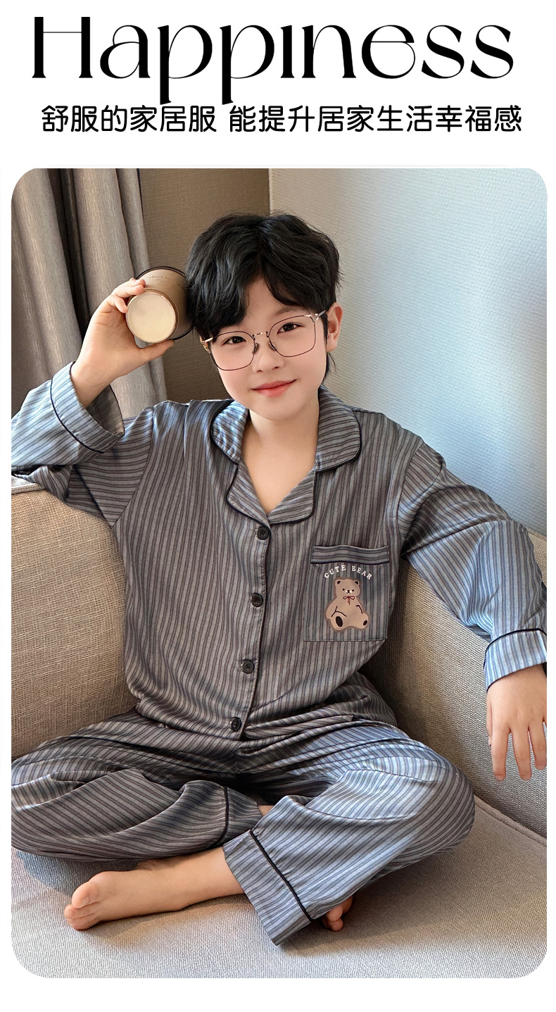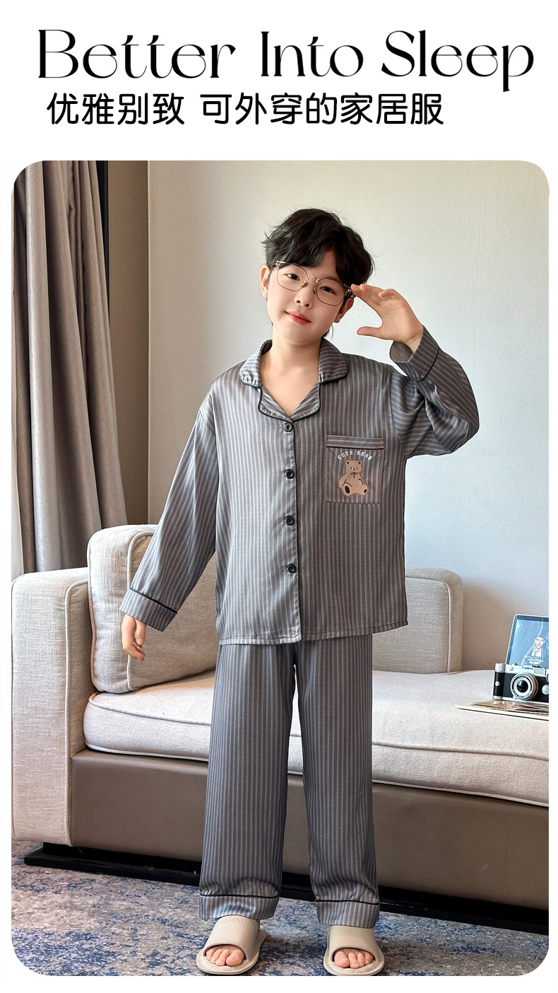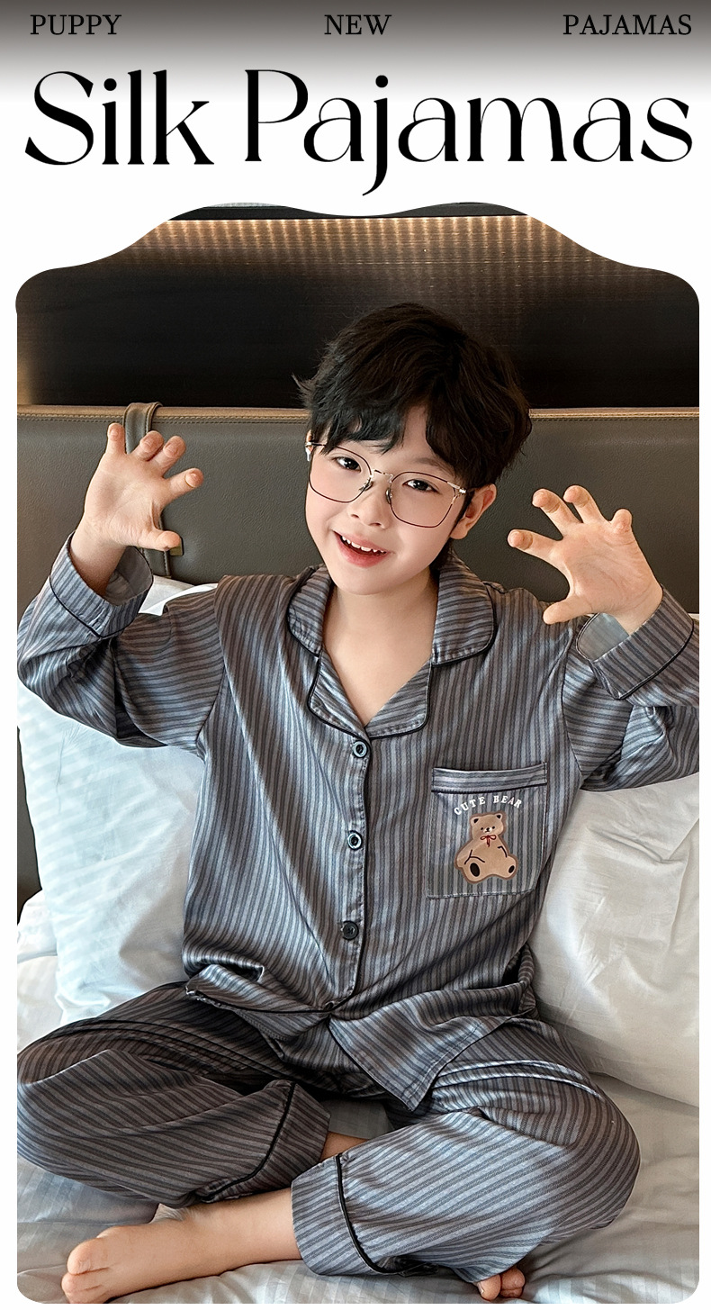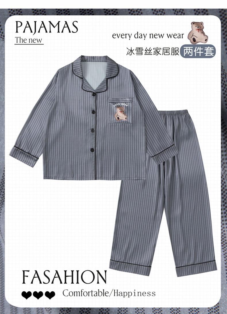 【丝滑凉感❗️柔光高级】儿童春夏季冰丝睡衣男童青少年初中生长袖仿真丝衬衫领家居服套装。jd