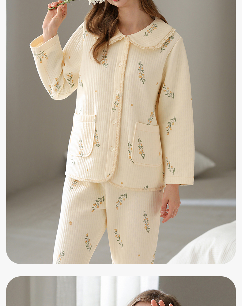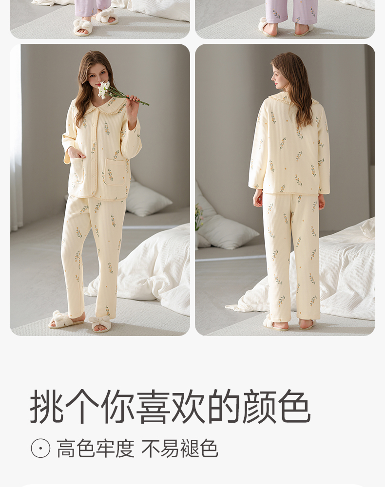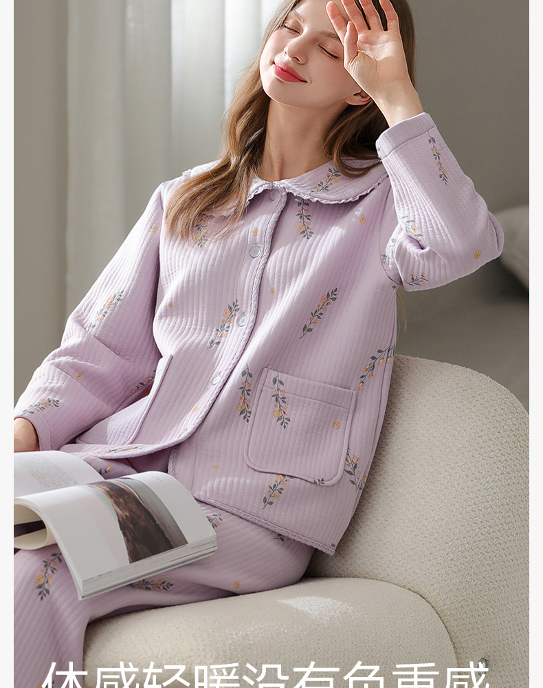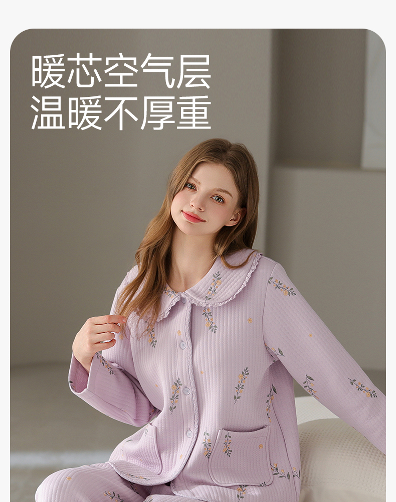 芬腾睡衣女秋冬纯棉空气棉夹层长袖抗菌春秋套装宽松加大码家居服