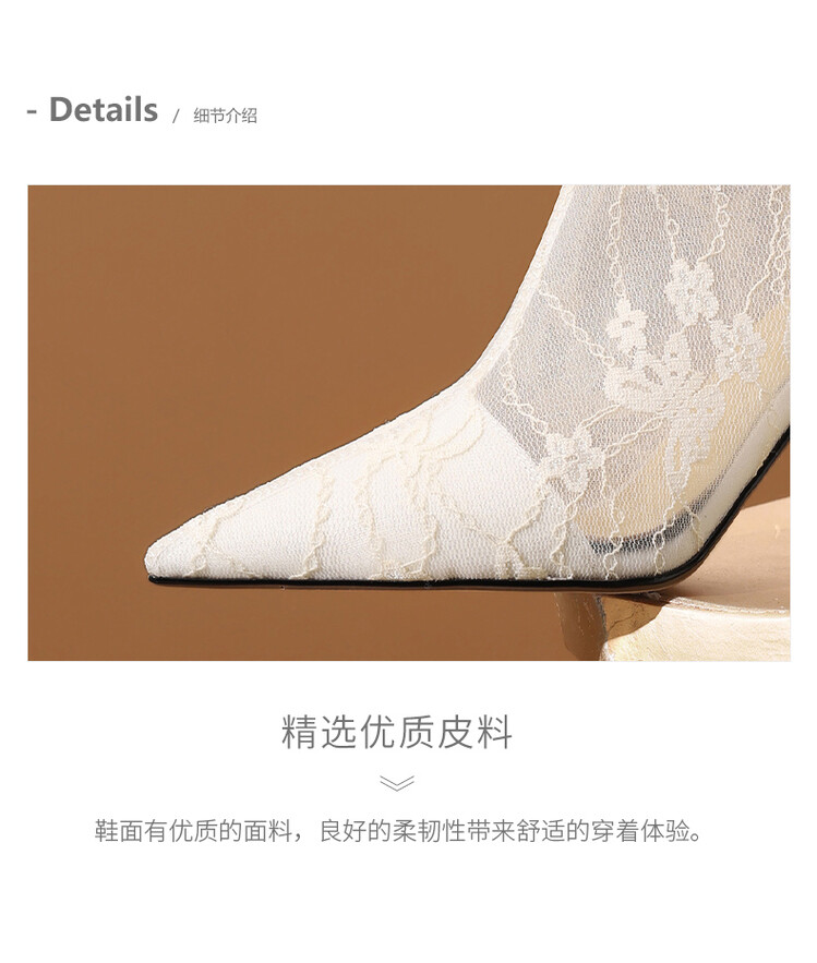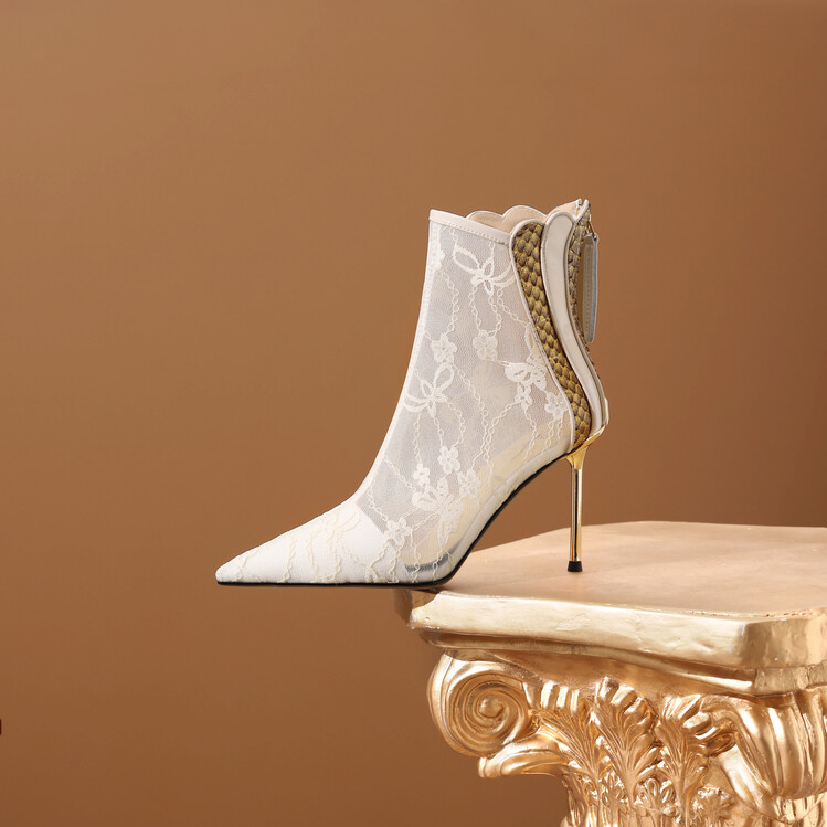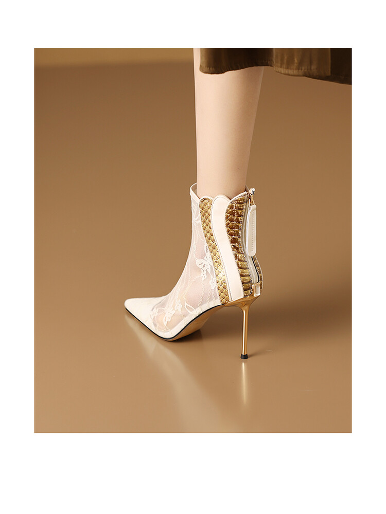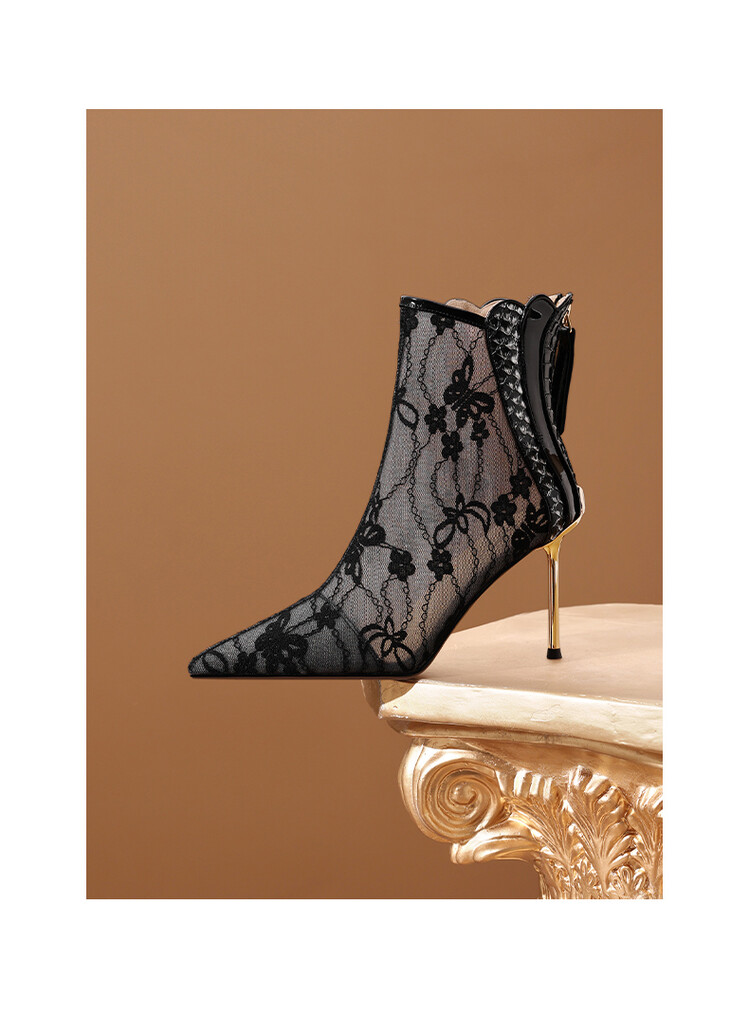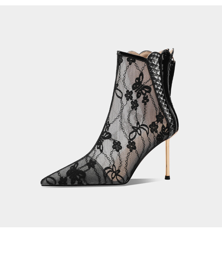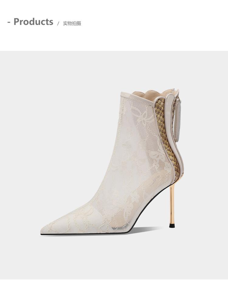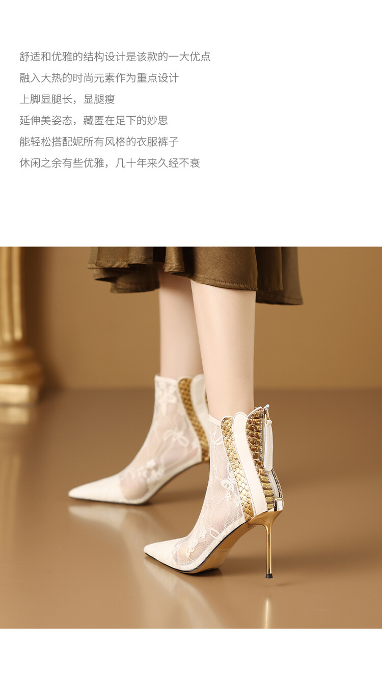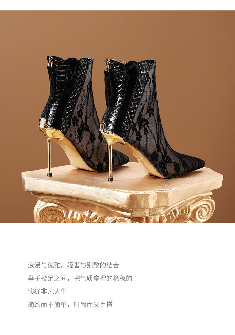 【预售5天】春秋靴高跟网靴,轻熟风气质细跟尖头蕾丝镂空网纱靴蛇皮短筒靴SJS&2301-988