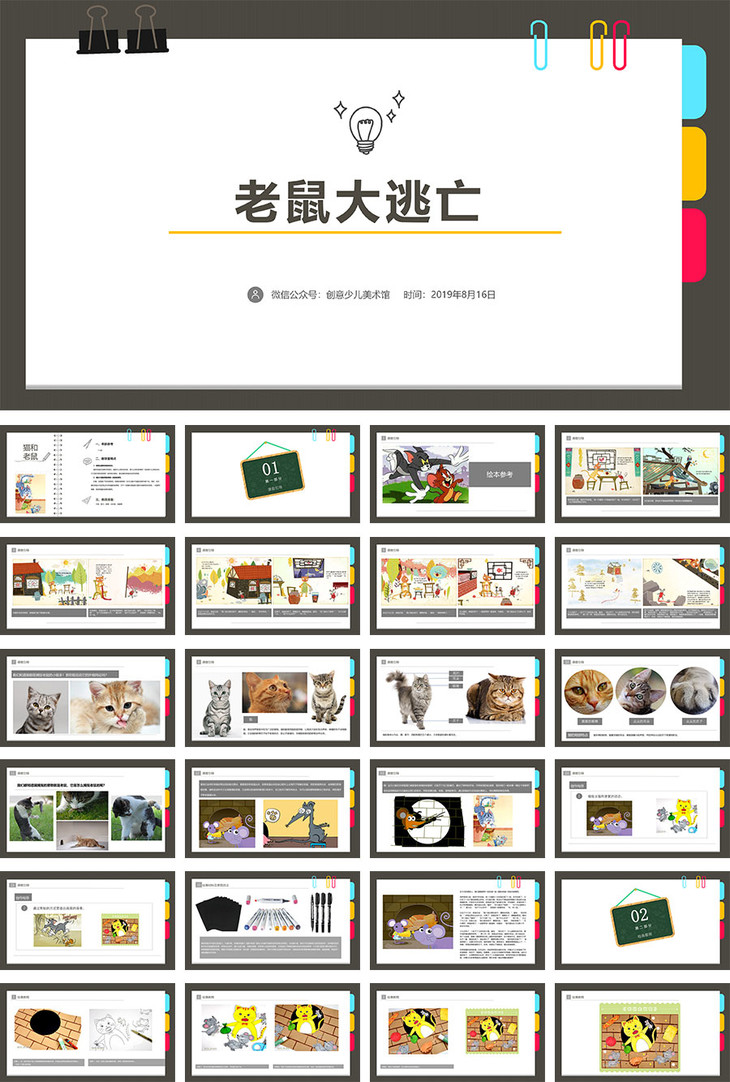 你看,老鼠偷了好多食物呀。有哪些食物呢?你可以展开丰富的创想并画下来。同时,也许猫和老鼠之间还有这许多有趣的故事呢,可不一定猫和老鼠就只是抓与被抓的关系呢。一起展开想象,表现有趣的故事场景吧。