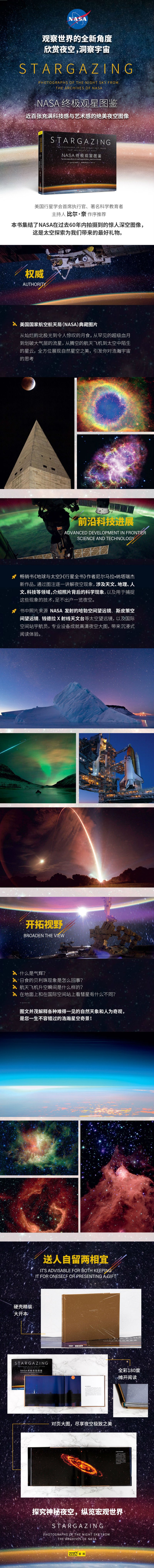 就像许多高质量的书籍那样,本书使用高品质纸张印刷,文字使用了黑色油墨,与其他书籍不同的是,本书还有超大的开本和精致的外观,印刻着我们地球、夜空令人敬畏的细节。希望本书能激发你欣赏每一页的兴趣,令你想亲自看看地球的夜空。