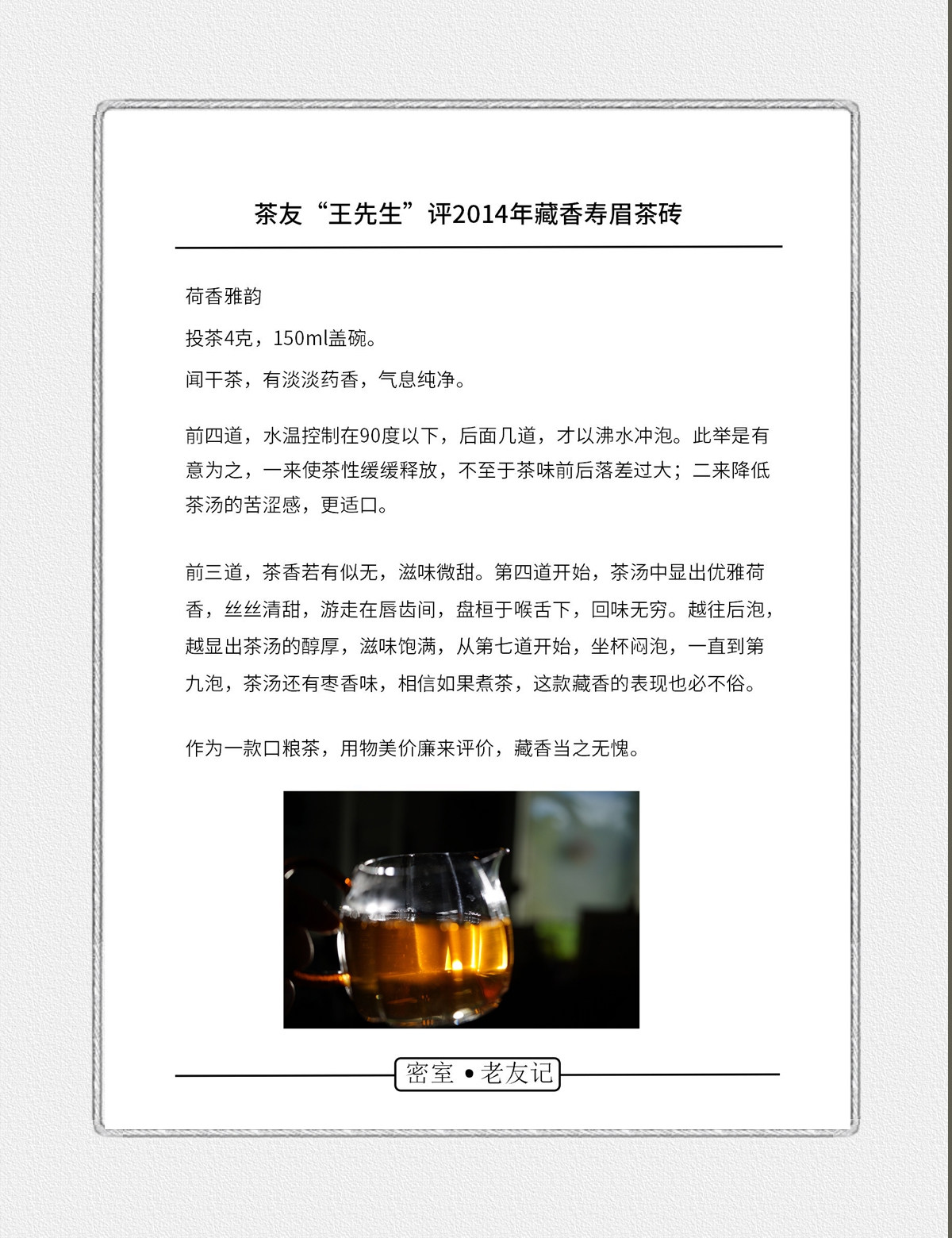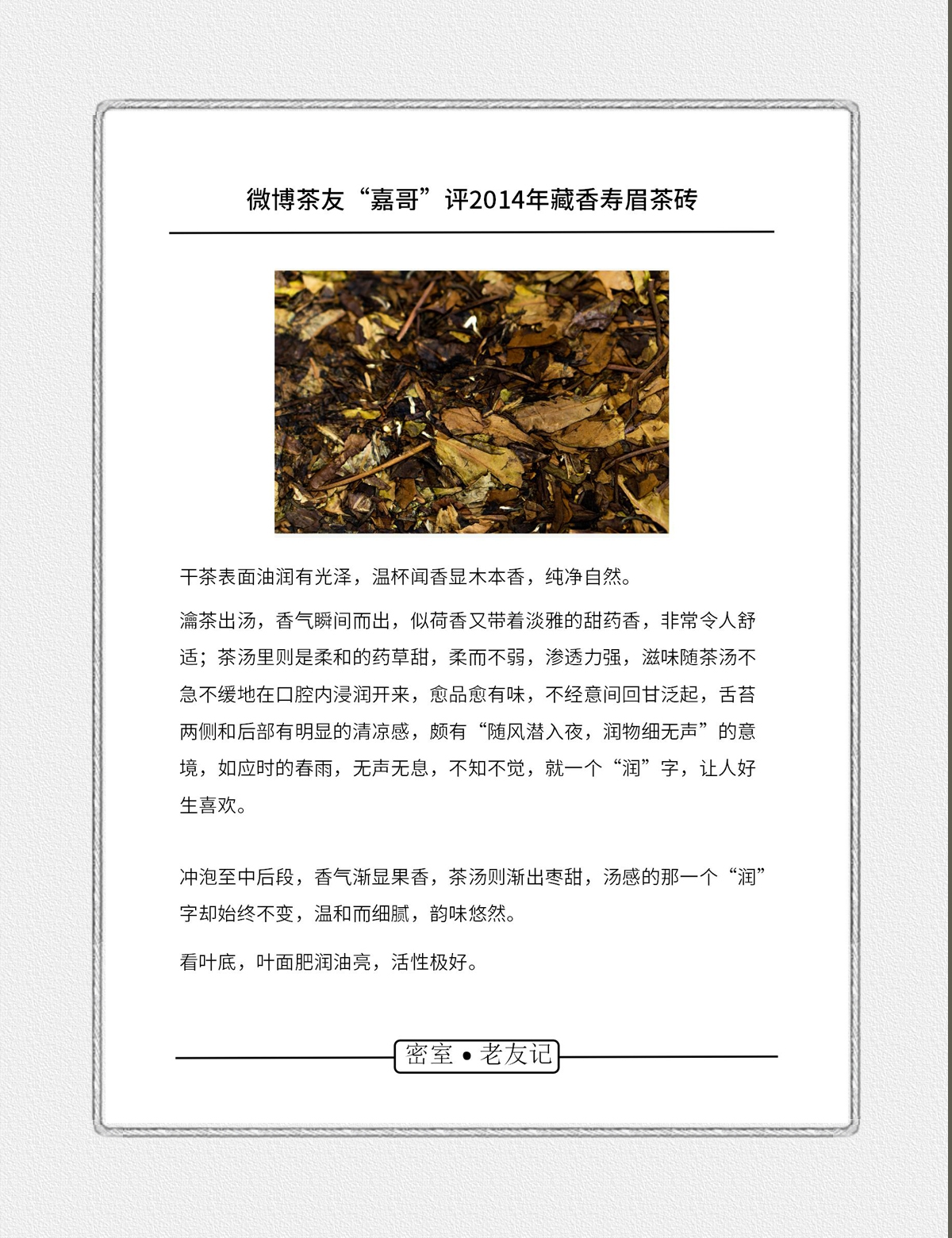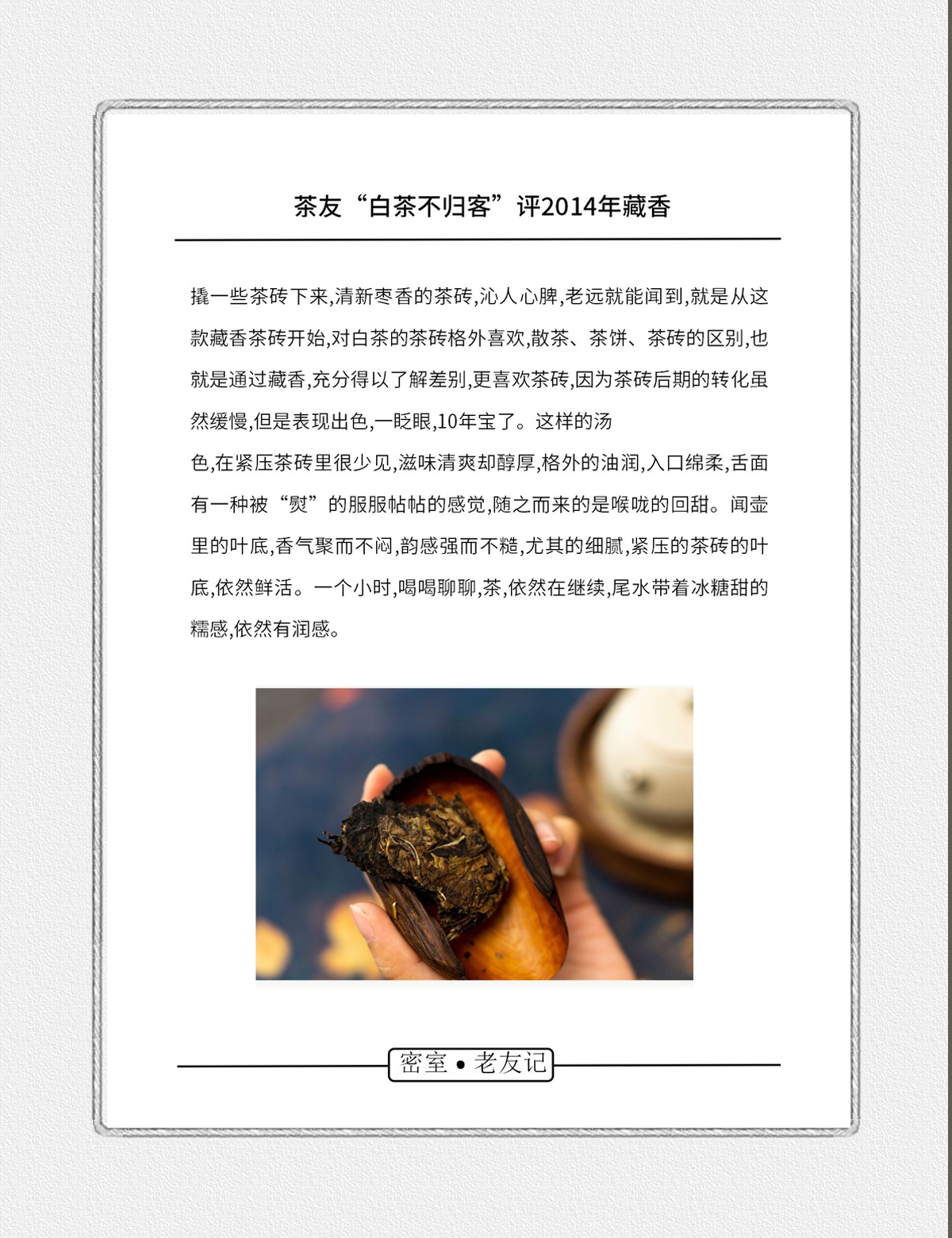 - 2021年,嘉木会创办了“藏茶密室”,开启了全新的藏茶模式,秉持“不将就,不迎合”的理念,通过“选、藏、养、醒”的方式,再度诠释藏茶的深意,沉醉杯汤,苦乐自知,茗透于心,迷之不悔!