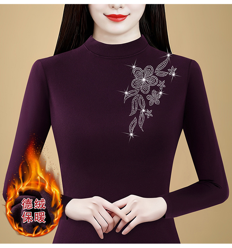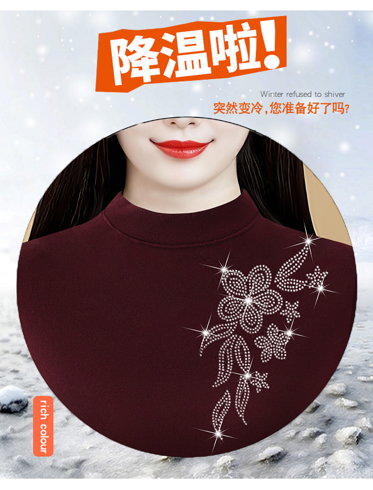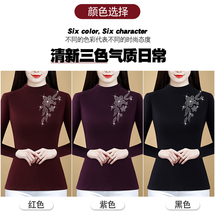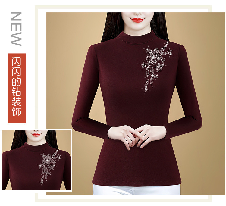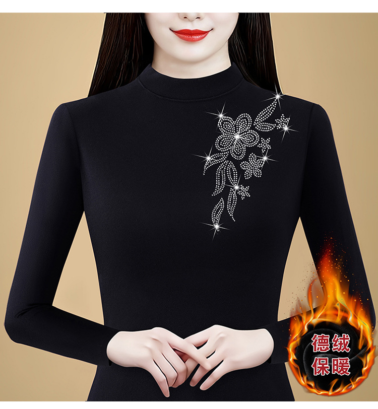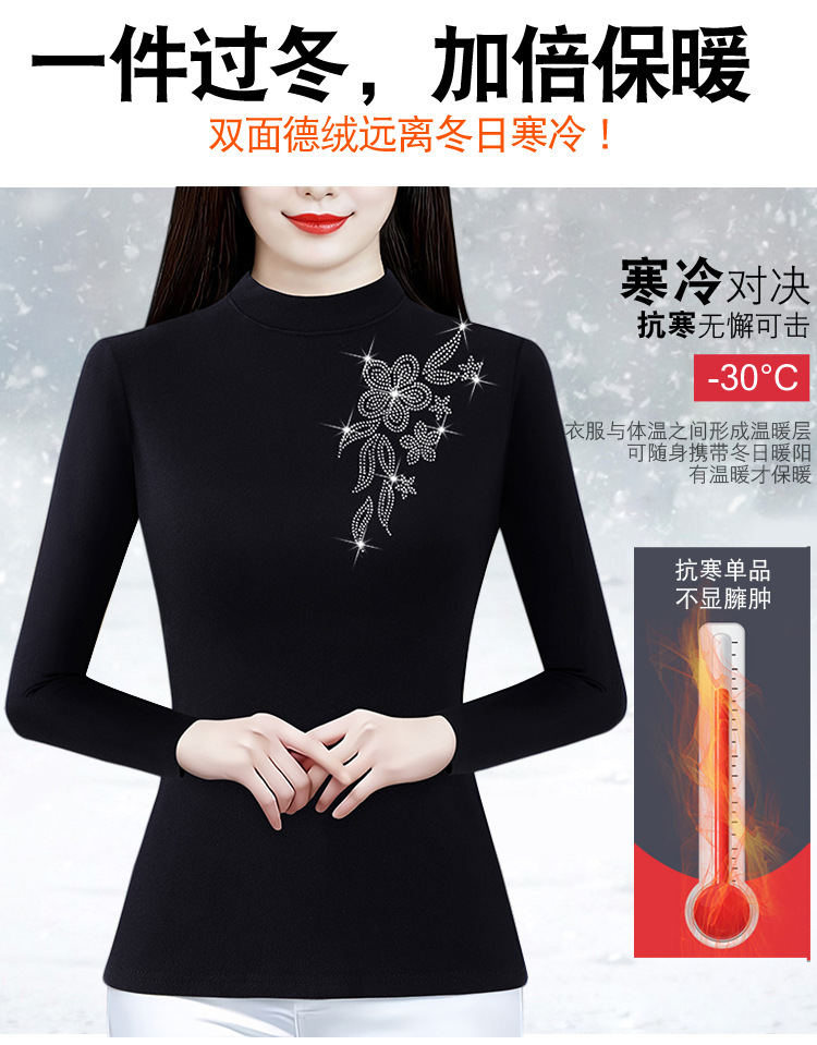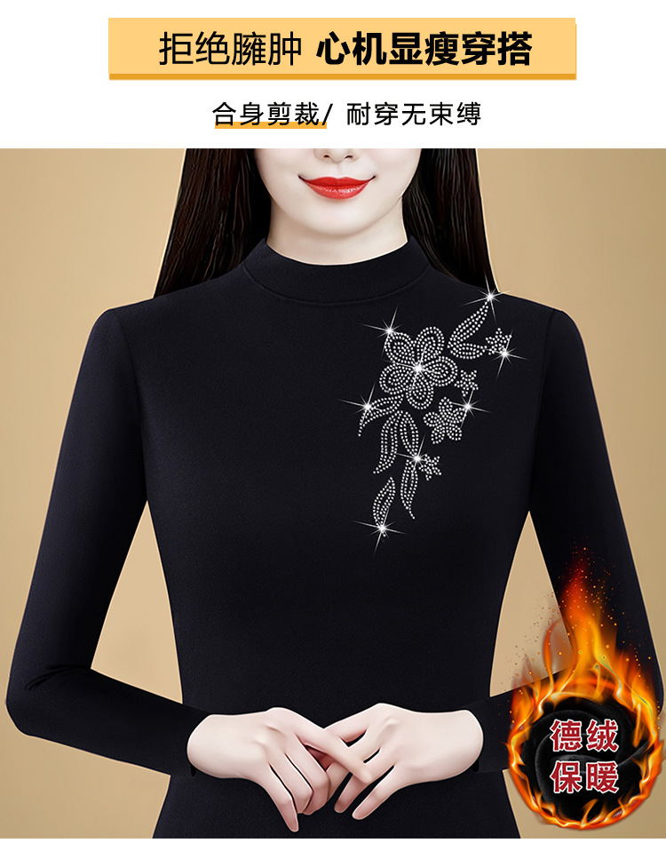 KQL 720G6728时尚加绒加厚烫钻T恤洋气半高领上衣打底衫