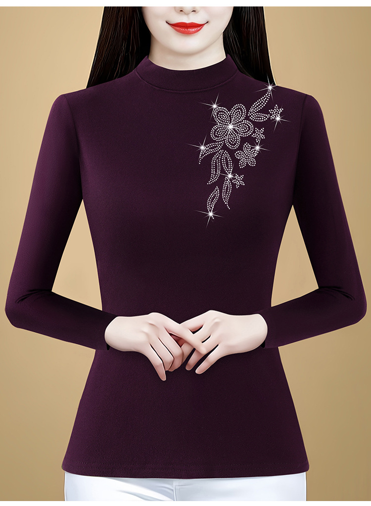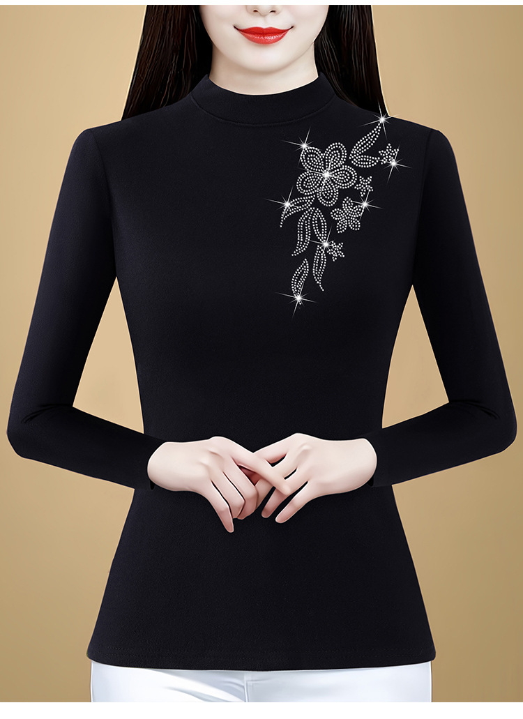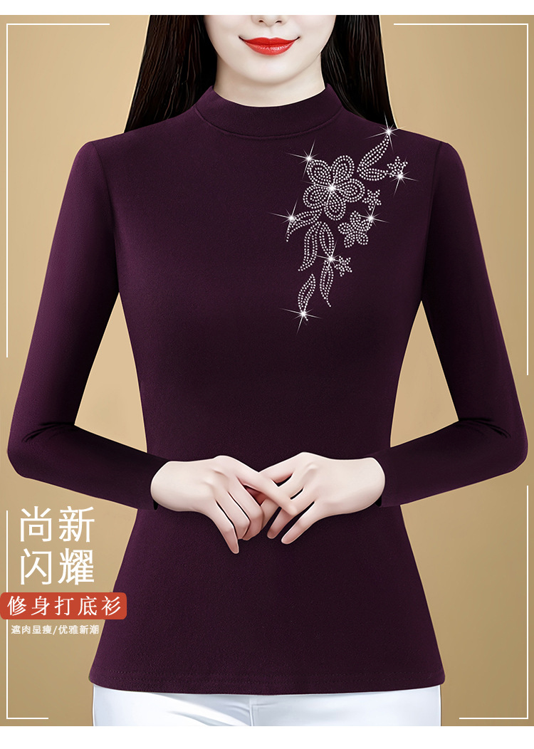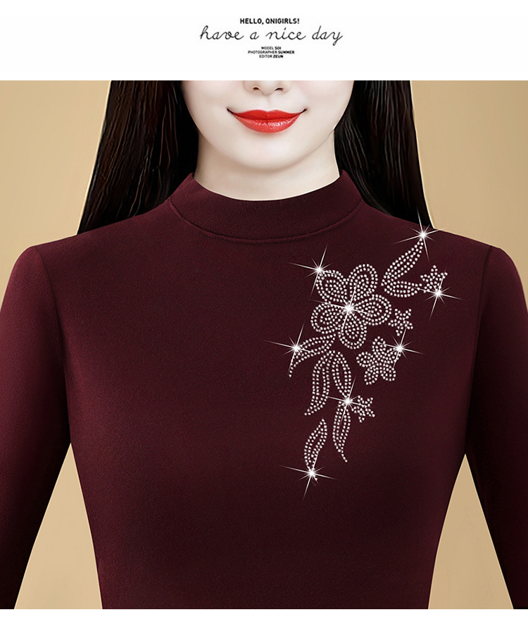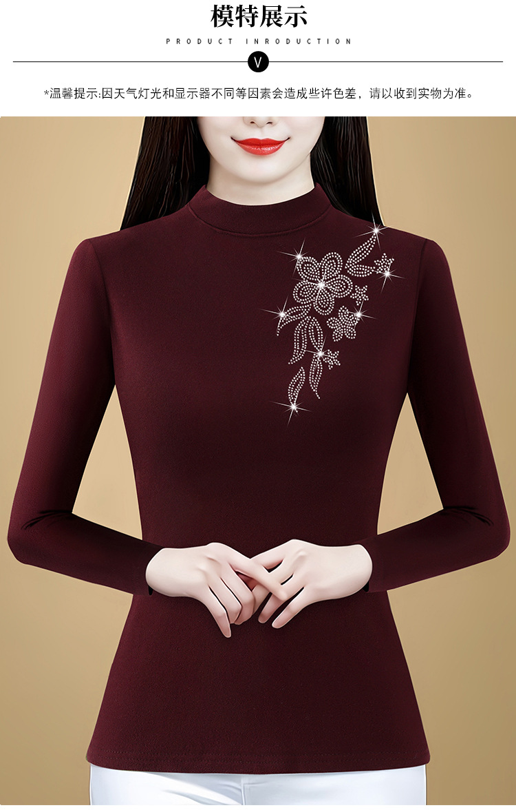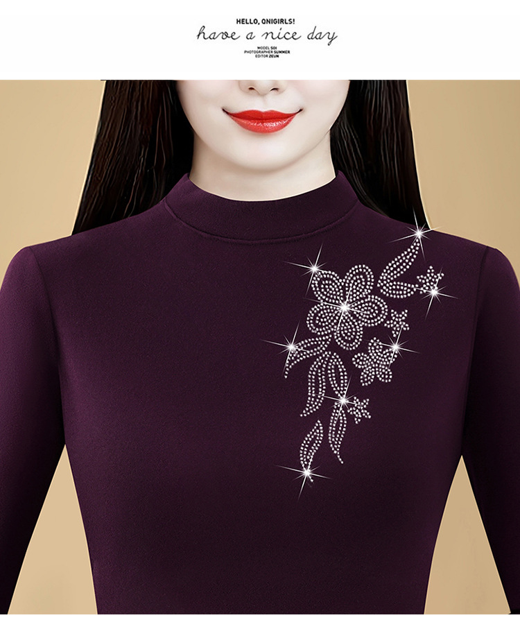 KQL 720G6728时尚加绒加厚烫钻T恤洋气半高领上衣打底衫