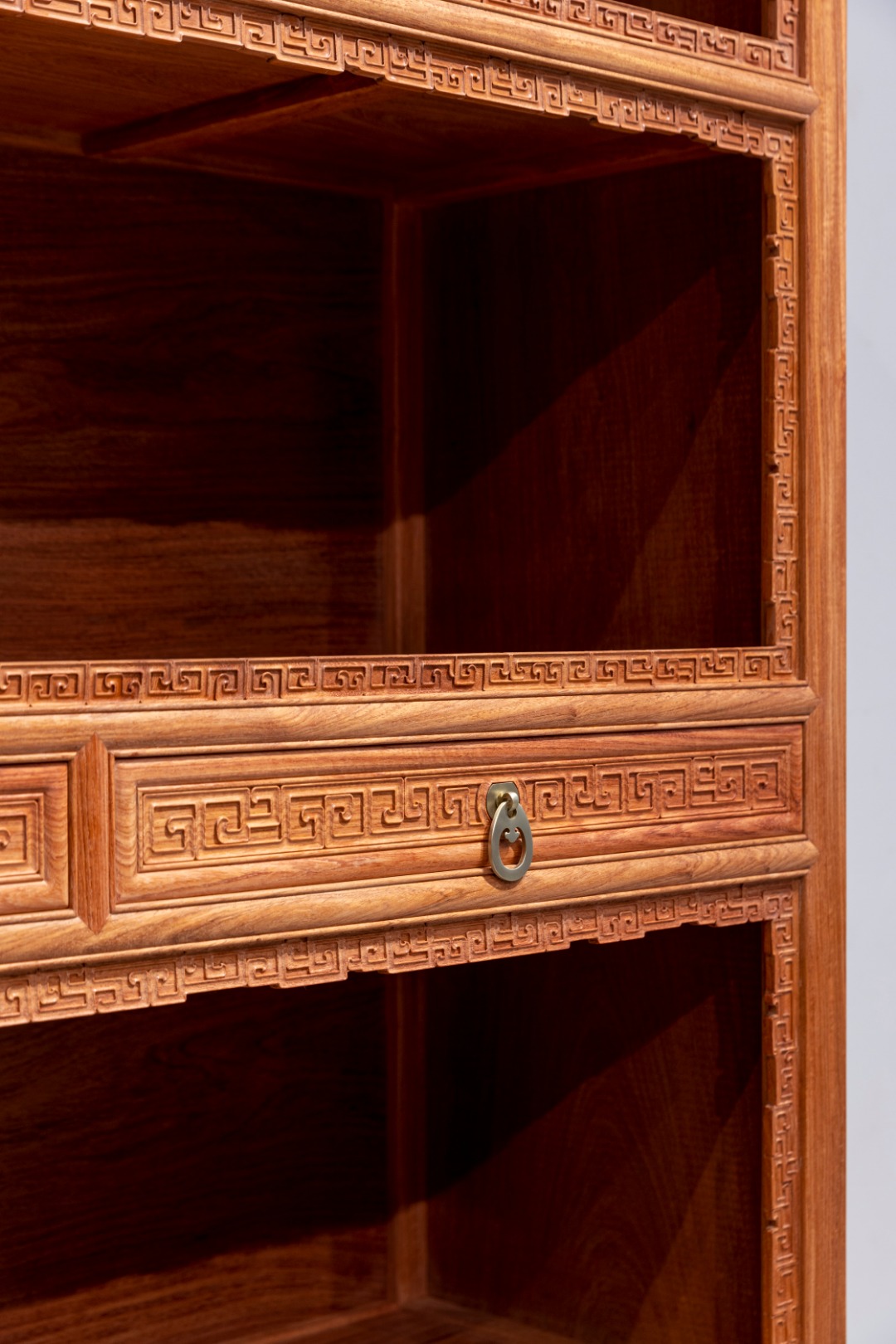 上格三层亮格,正面圈口上雕拐子纹。第二、三层亮格间置两具窄长的抽屉,下部为柜,对开柜门,面板上打洼一委角方框,内铲地浮雕夔龙捧磬纹,夔龙的身躯布满纹饰框。柜格正面纹饰线条均打洼双线。柜格侧板分两层,每层侧板上起鼓委角方框,内露地浅浮雕流云百蝠纹。背板也分两层,落堂镶板,中部起圆角方框。底部四圈安洼堂肚宽牙条,正面及侧面牙条铲地浮雕拐子纹,背面牙条起卷云纹。面页、合页、护脚等铜构件,采用定制级铜活儿,纹理錾刻提精聚神,起画龙点睛之笔。