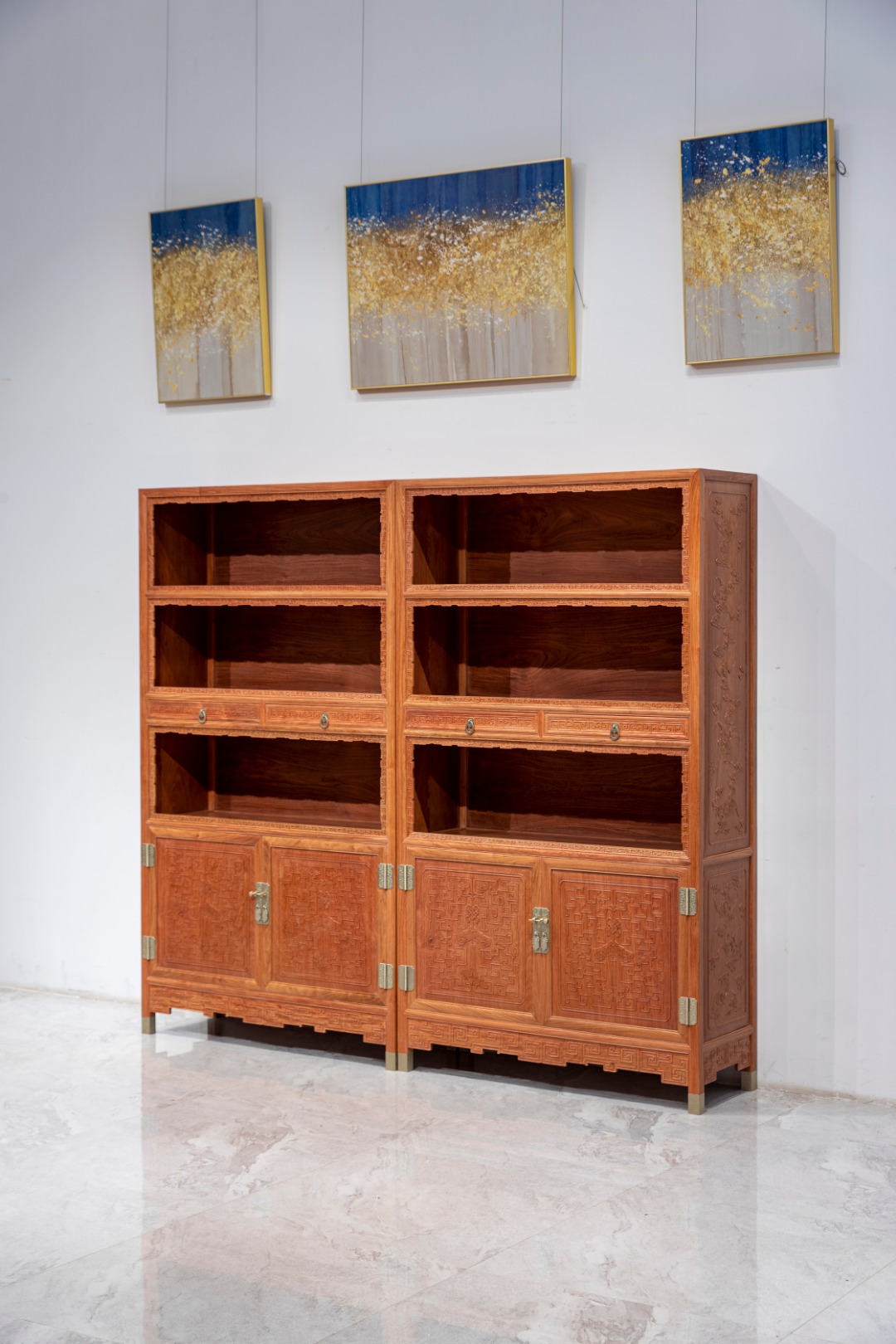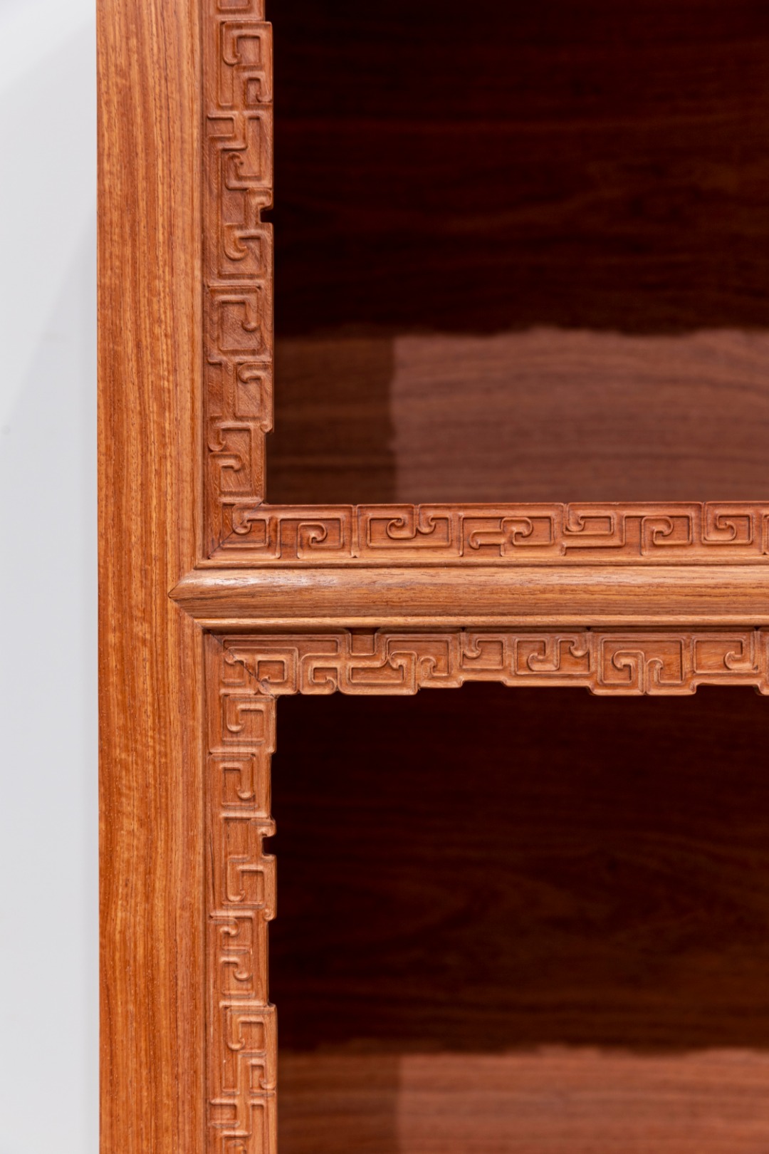 此款福庆有余书架,原型见于北京匡时国际拍卖“2011春季艺术品拍卖会”,御制紫檀云蝠纹书橱。此器流传有序,上世纪80年代曾轰动上海,是业内认知程度最高、认可度最高的宫廷家具精品。