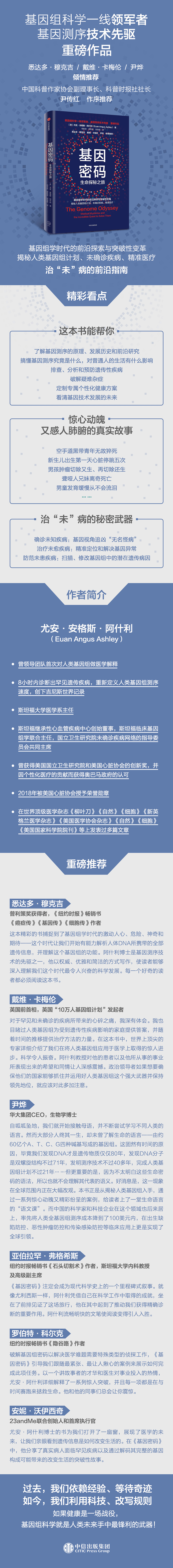 1、基因组科学一线军者次著书作者曾领导团队次对人类基因组做出医学解释的科学家、基因测序技术先驱尤安·安格斯·阿什利处女作,带读者理解我们这个时代令人兴奋的前沿科学。