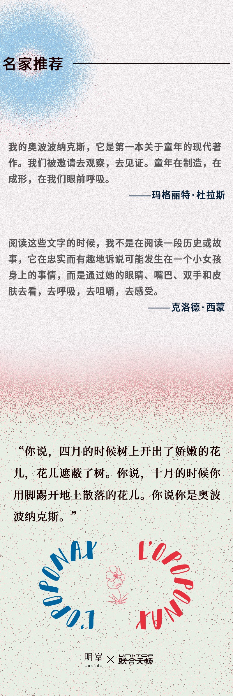 《奥波波纳克斯》是法国作家莫尼克·威蒂格的长篇小说代表作,也是她的自传性写作,从孩童的视角呈现了一个女孩的成长经历。本书颠覆了语言和叙事的规范,还原了未被性别和社会秩序约束的孩子对世界的感知。以纯粹、细腻、介乎诗与散文间的书写,邀请每个人重返童年的涌流。