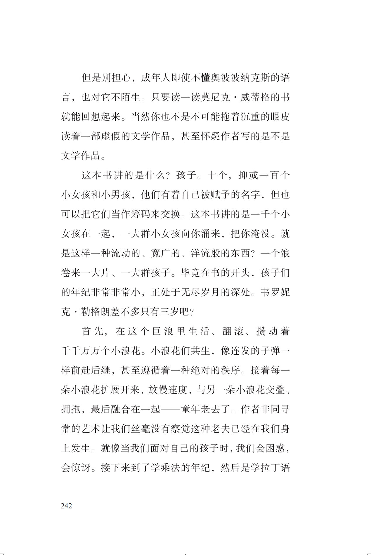 摈弃分段,精简标点, 以介于散文和诗歌之间的文体,还原童年接踵而至的事件与不间断的印象,混乱中充满活力与节奏。
