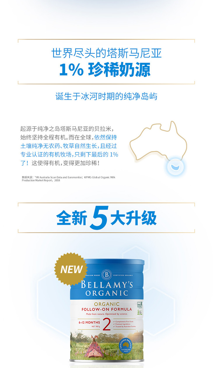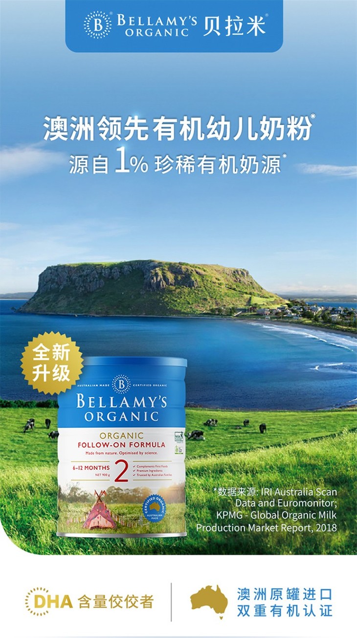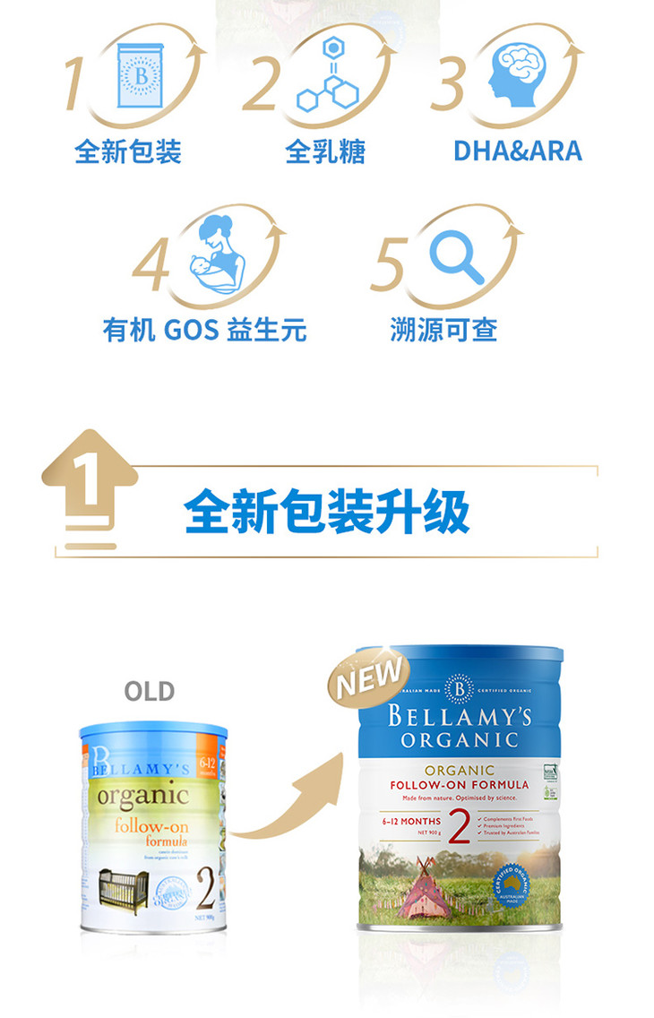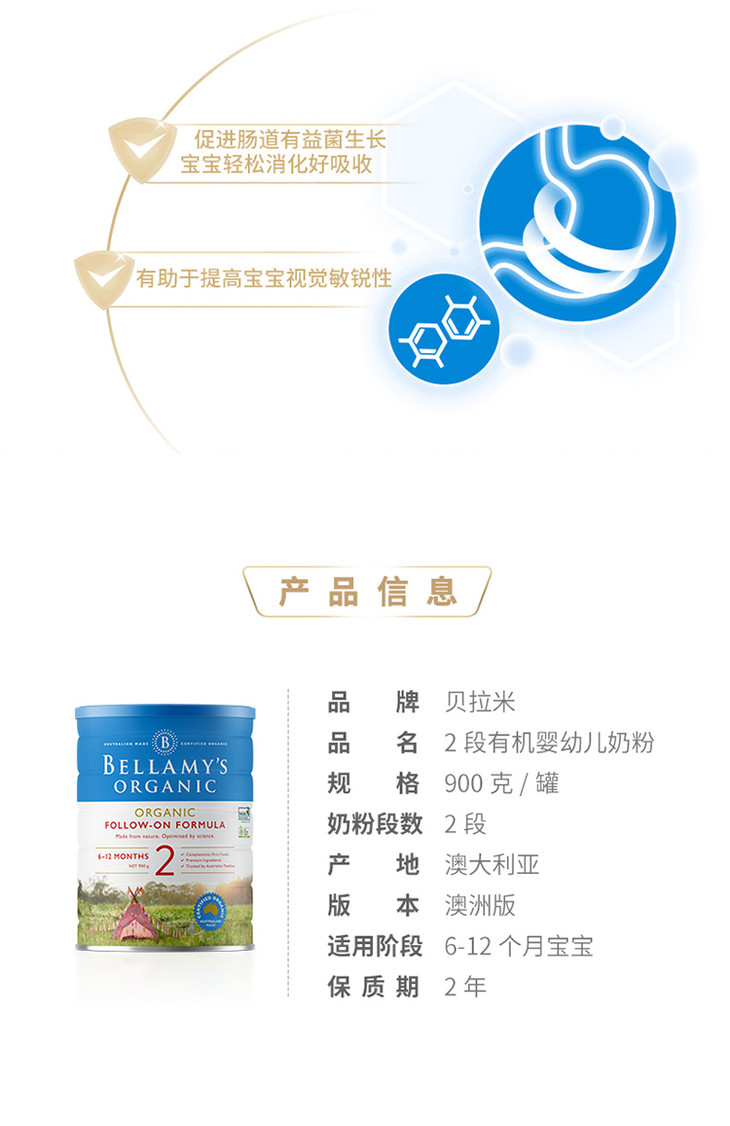【海外直邮】贝拉米 Bellamy’s 婴幼儿有机奶粉2段 (6-12月) 900克 六罐装