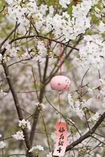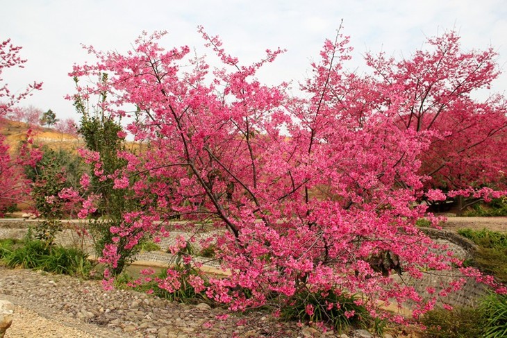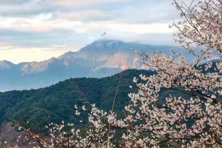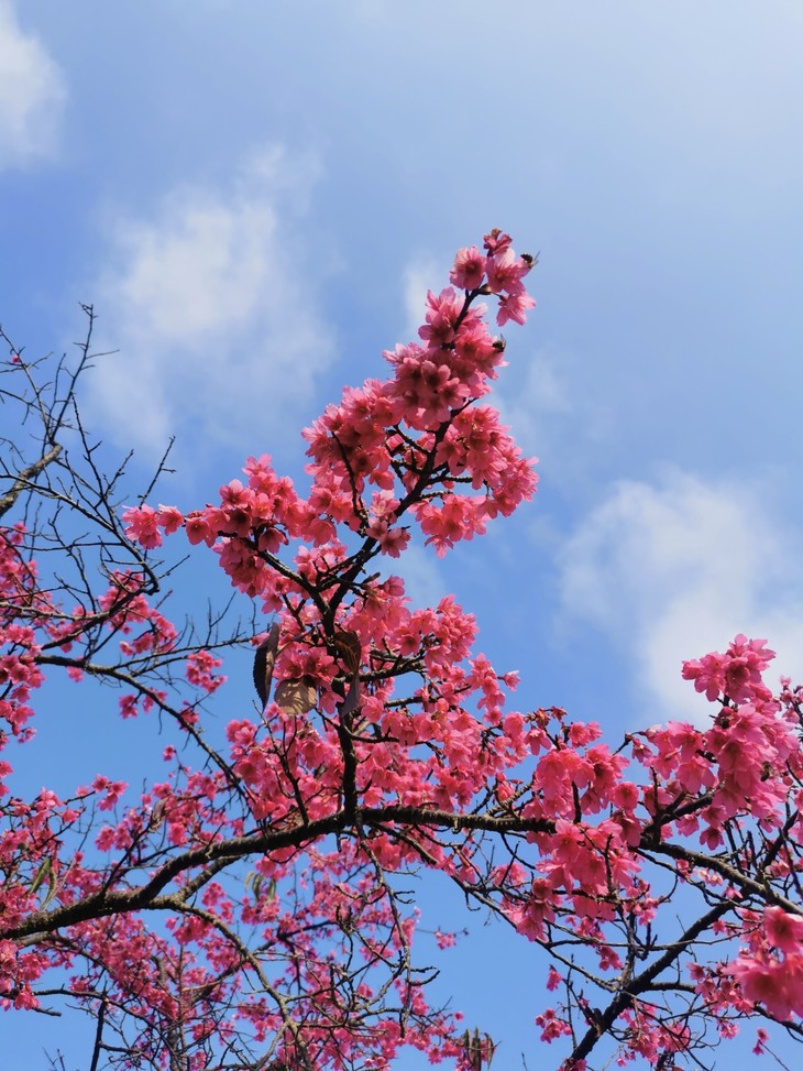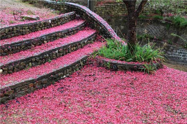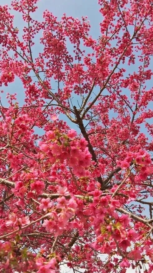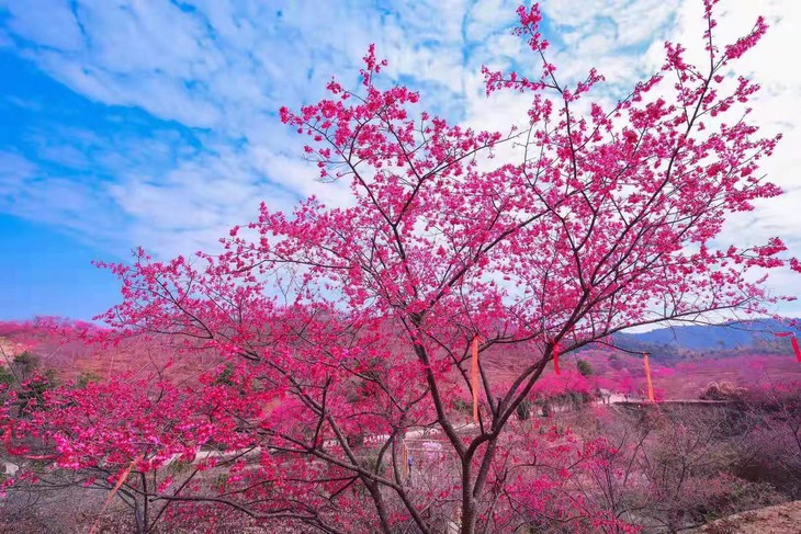 花朵呈粉红色,一串串的犹如铃铛悬于枝头。两边的山坡上,一树树怒放的樱花,似一团绯云。走近细看,那最多的是八重樱,花梗细长而下垂,又像一盏盏红灯。簇簇花朵以蓝天白云为背景,在微风中轻轻摇曳。
