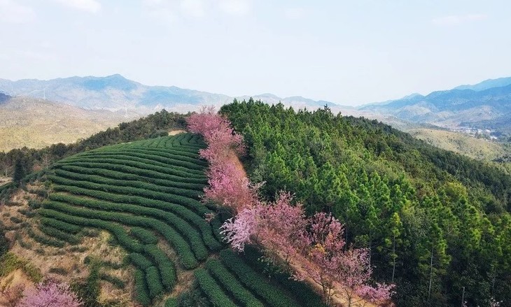 雪峒村是革命老区,辖内海拔较高,生态优良,气候宜人,风光秀丽。村子周围种满了茶树,茶园中间又有粉红的樱花开满园区,高处望去,颇有几分广东小“无量山”的姿态。