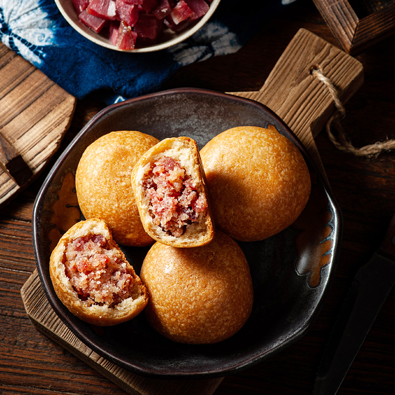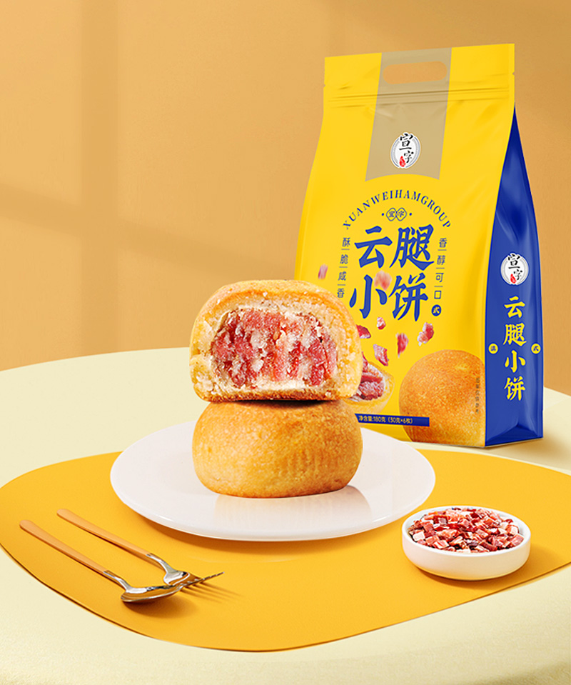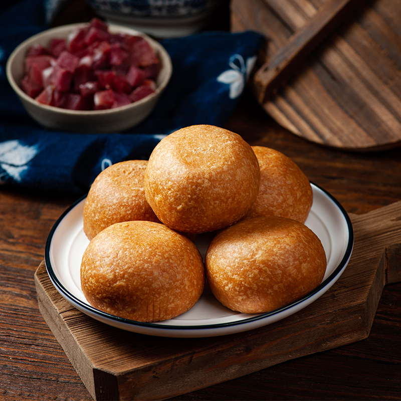 高原小麦遇上传统新宣威火腿馅料,鲜香的火腿香,渗透着麦香,舌尖时不时触碰到一粒一粒饱满的火腿粒,让人忍不住好好吃上一口。