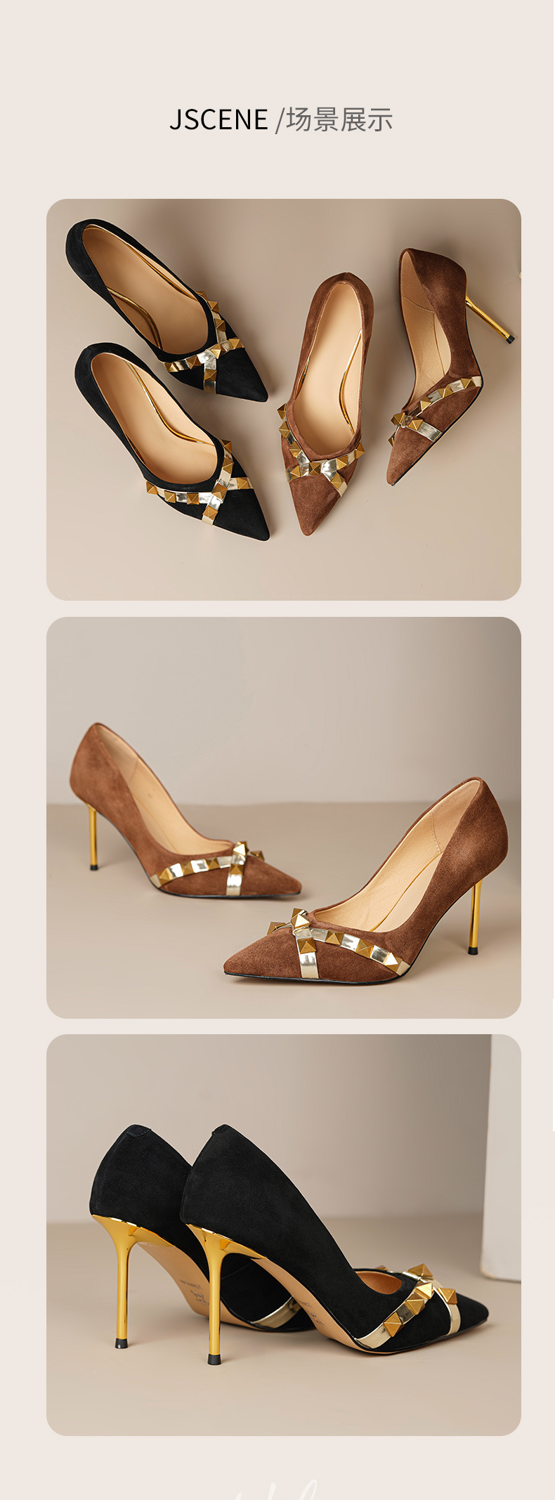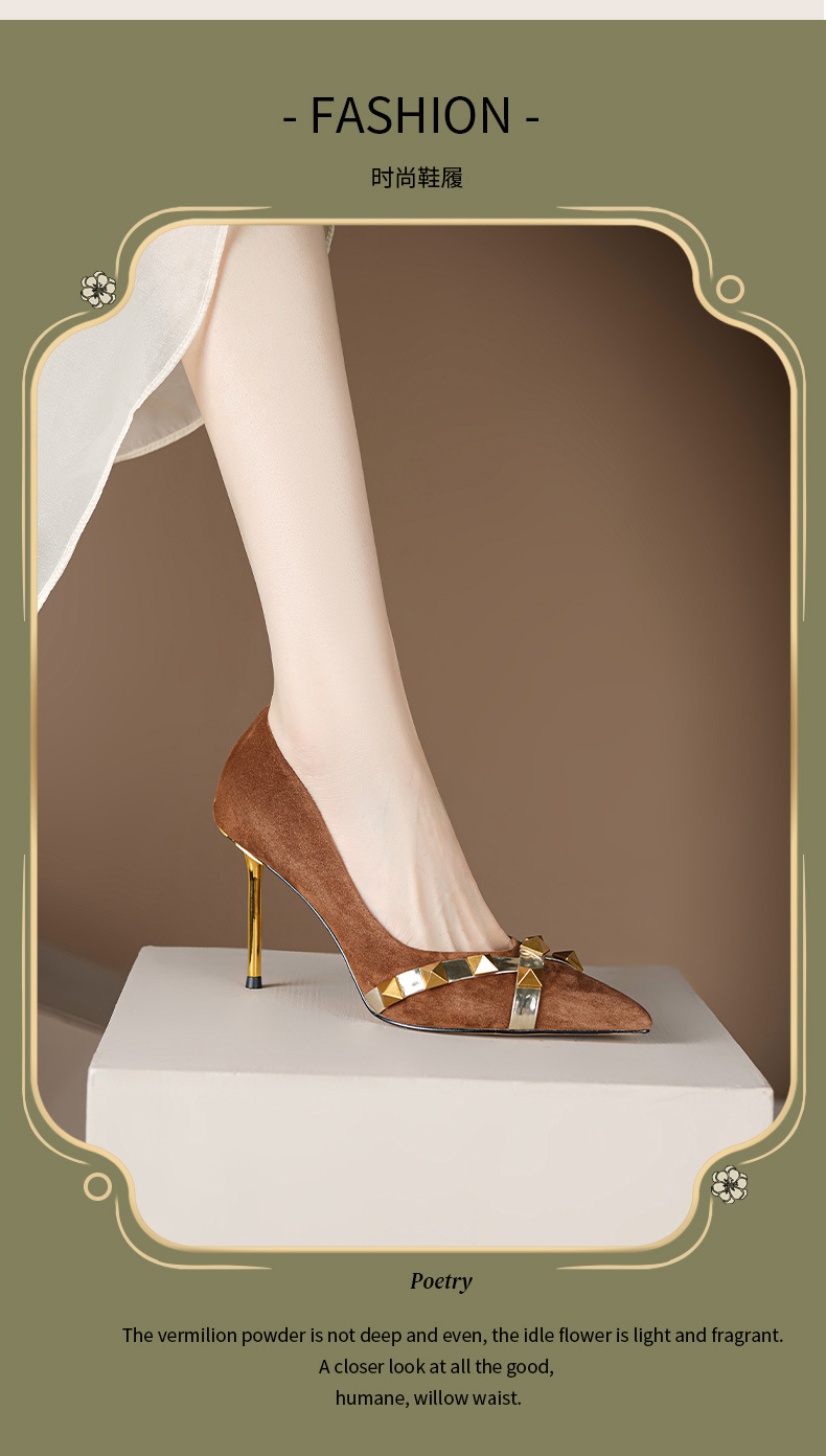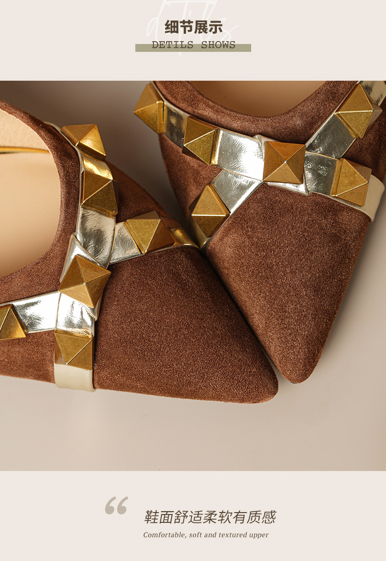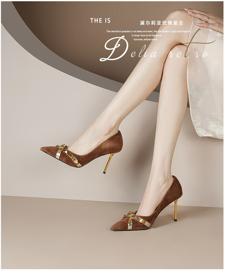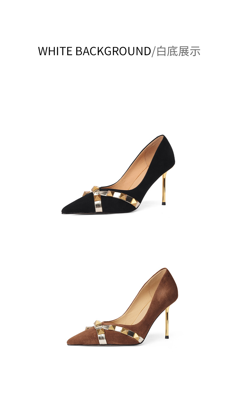 OLD-A1707新款尖头柳钉翻皮棕色细跟高跟鞋浅口黑色铆钉女单鞋
