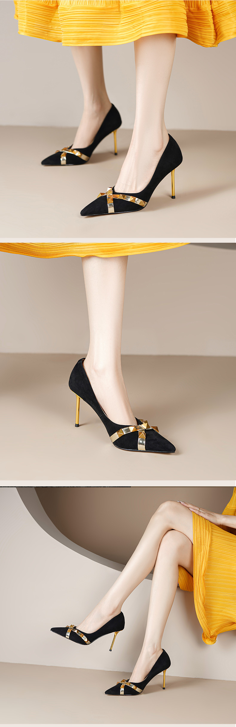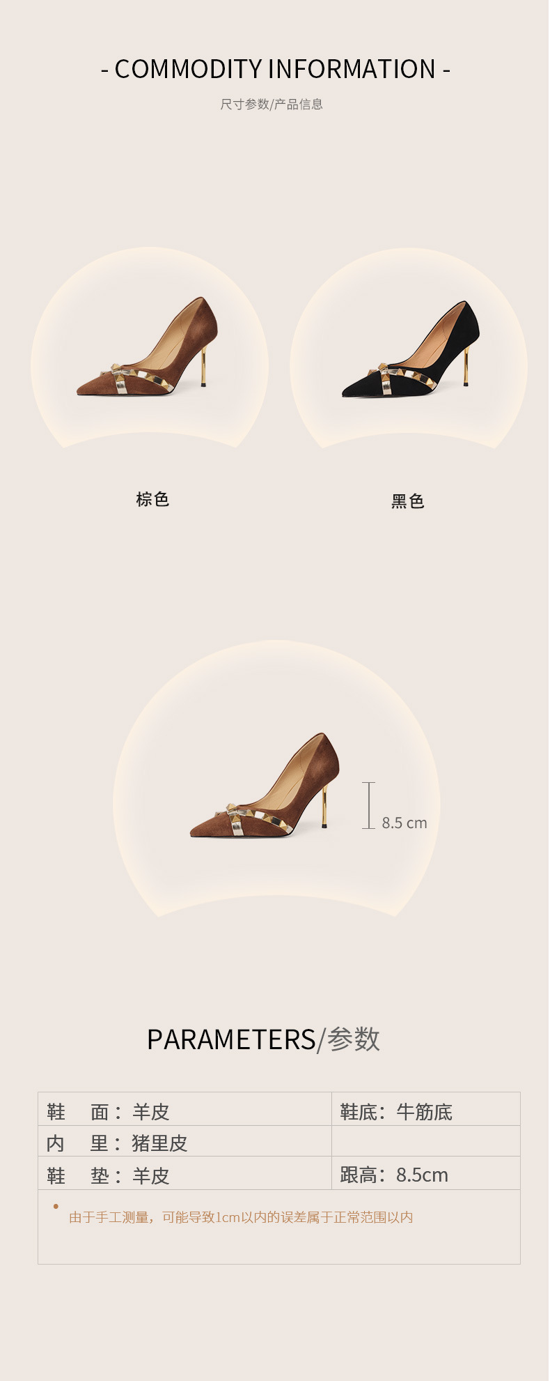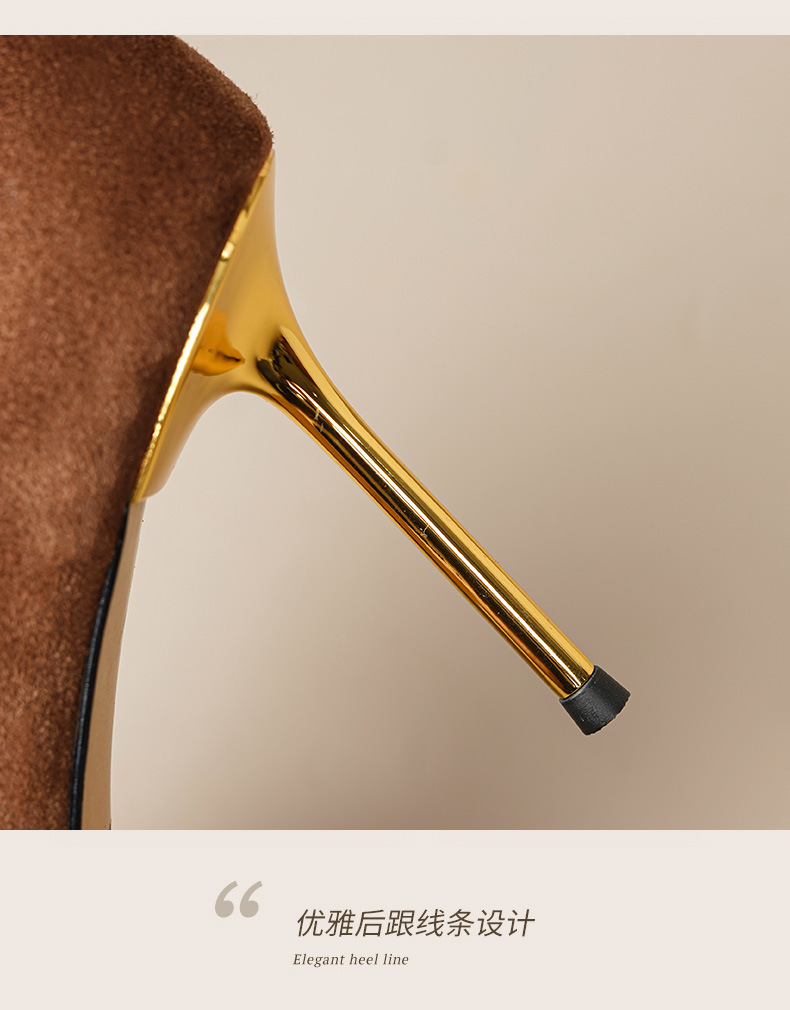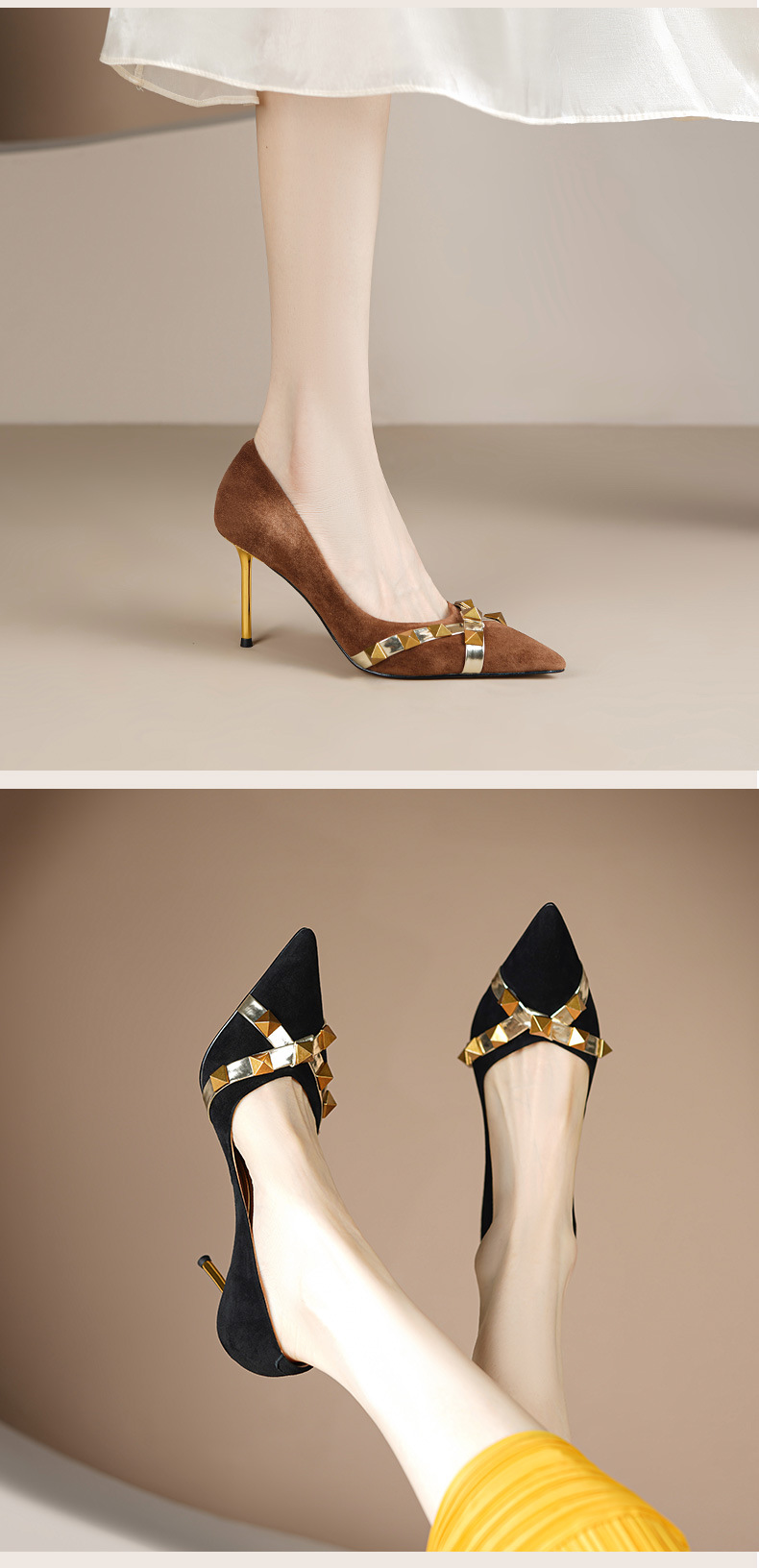 OLD-A1707新款尖头柳钉翻皮棕色细跟高跟鞋浅口黑色铆钉女单鞋
