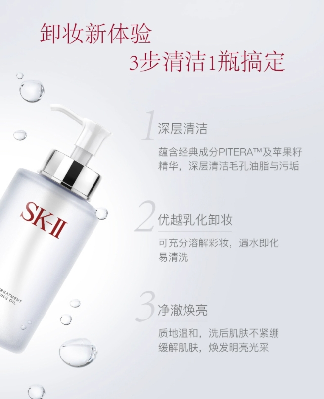 👑SK2护肤卸妆油 250ml 👍卸妆+洁面二合一,还原净透美肌✨ 💥SK-II独家成分及苹果籽精华,深层清洁毛孔油脂与污垢 💎优越的乳化能力,可充分溶解彩妆,遇水即化容易清洗 💦质地温和,洗后不紧绷,能够缓解肌肤,焕发光彩 ✅有效:温和清洁✔️,清爽不油腻✔️,滋润保湿✔️