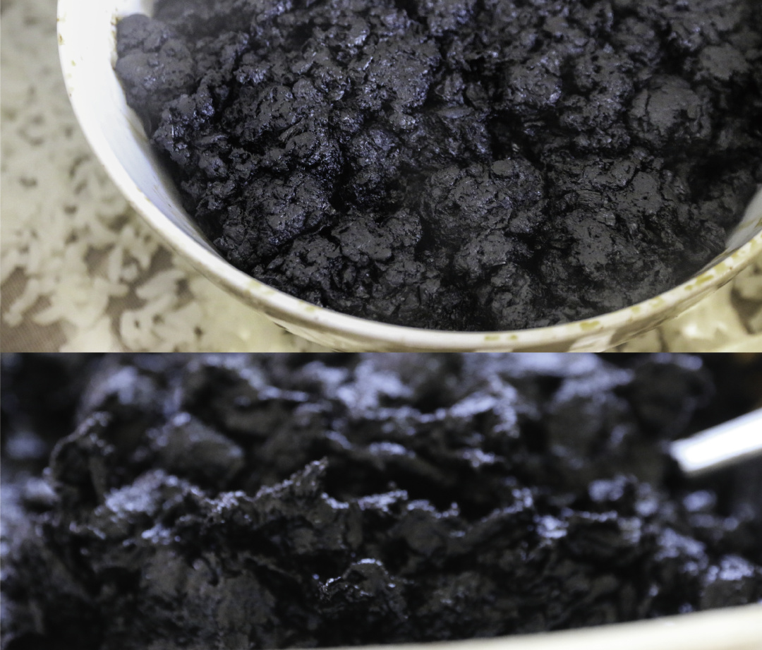 将剁碎的桂圆肉、酸枣仁粉、薏仁粉搅拌均匀后装碗,把泡好的老品种大米铺满笼屉蒸制,让米汽充分浸润食材。隔水蒸一段时间后熄火,冷切后更换大米,并搅拌碗里的原料,让原料蒸透,反复多次,柴火蒸足120小时,整个过程历时15天,制作出来的玉灵膏亮如黑炭。