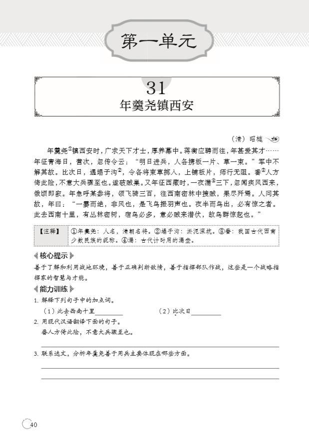阅读训练首先要重视整体感知能力的训练。对于文本的阅读,任何人都是从感知开始,并由此获取相关的阅读初始信息。这些信息在相当程度上会影响后续的阅读行为开展,因而能否有一个合理的整体感知,既是有效阅读文本的需要,也是提高整体阅读能力的需要。为了让学生在阅读时抓住阅读要点,提高整体感知水平,我们在编写时特别注重核心提示的编写,对文本的核心思想、核心内容、核心方法等进行相关提示,这样,学生能在阅读中快速抓住要点,并通过培养整体感知能力不断提升文言文阅读理解的能力。