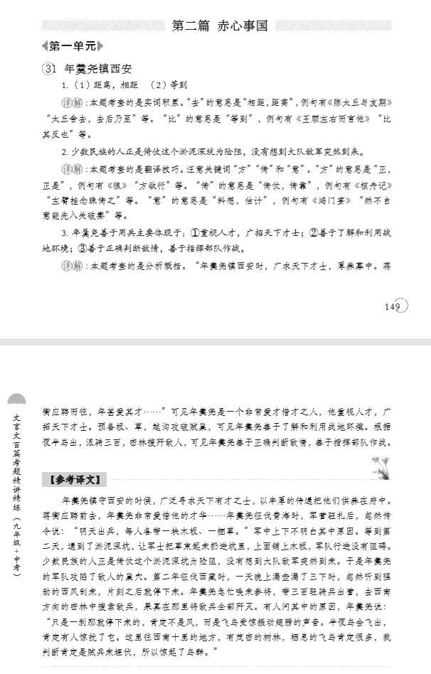 编者从海量的中考真题中筛选出优秀的文章,所选的文章兼顾人文性、科学性和趣味性等特点。同时,根据各年级学生的文言文阅读水平和理解能力,编者对所选文章作了适当的删改和调整,以便更好地贴近生活、贴近学生。同时编者对每一道能力训练题严格把关,注重针对性和实效性。特别是实词和虚词的相关考题,都以《全日制义务教育语文课程标准》中有关文言文教学基本要求的实词、虚词为参照,进行相应的训练,并适当拓展。