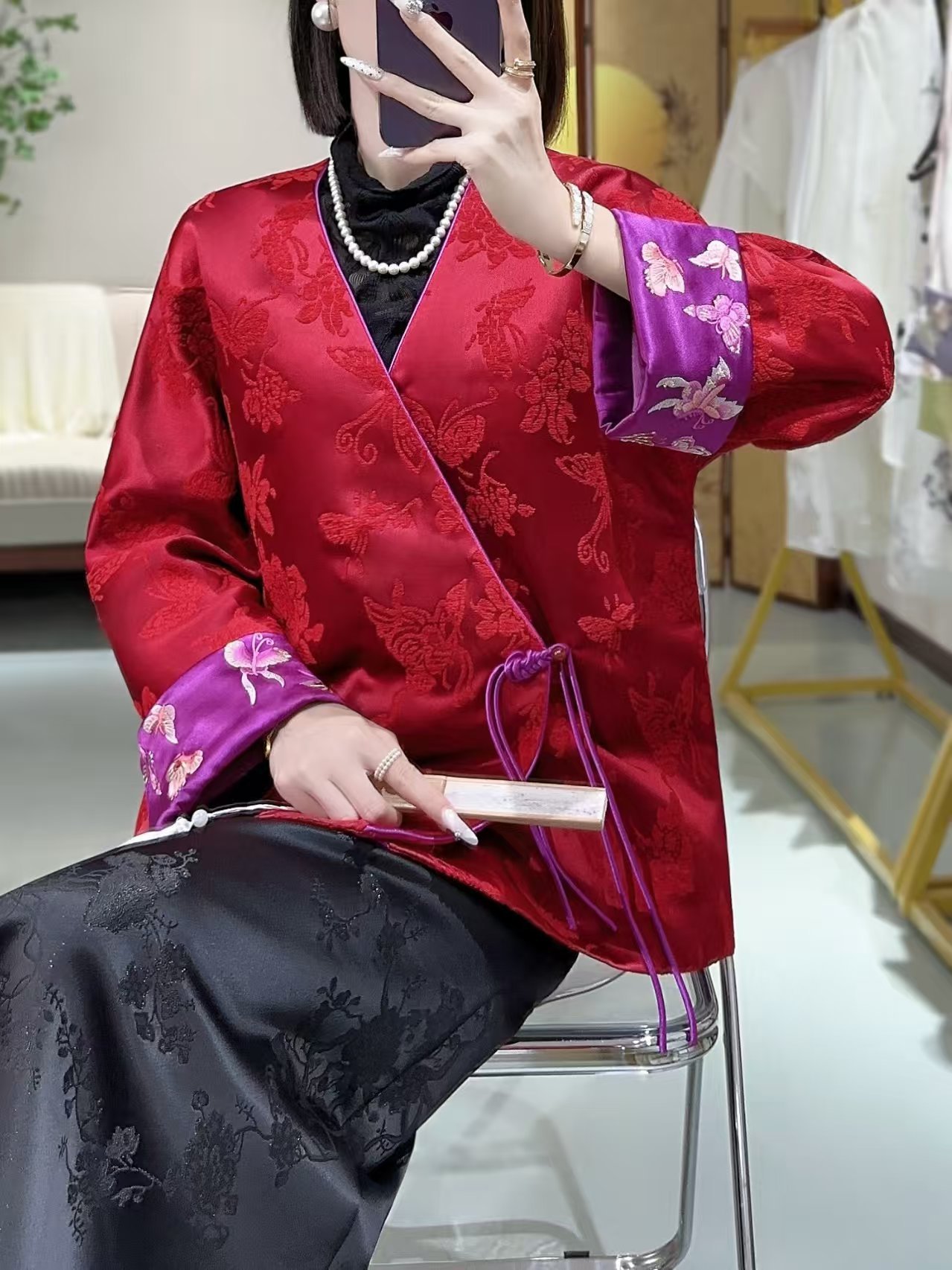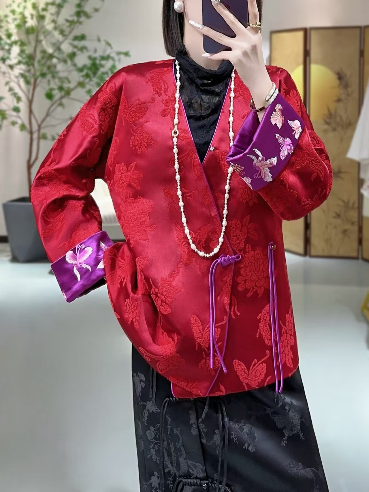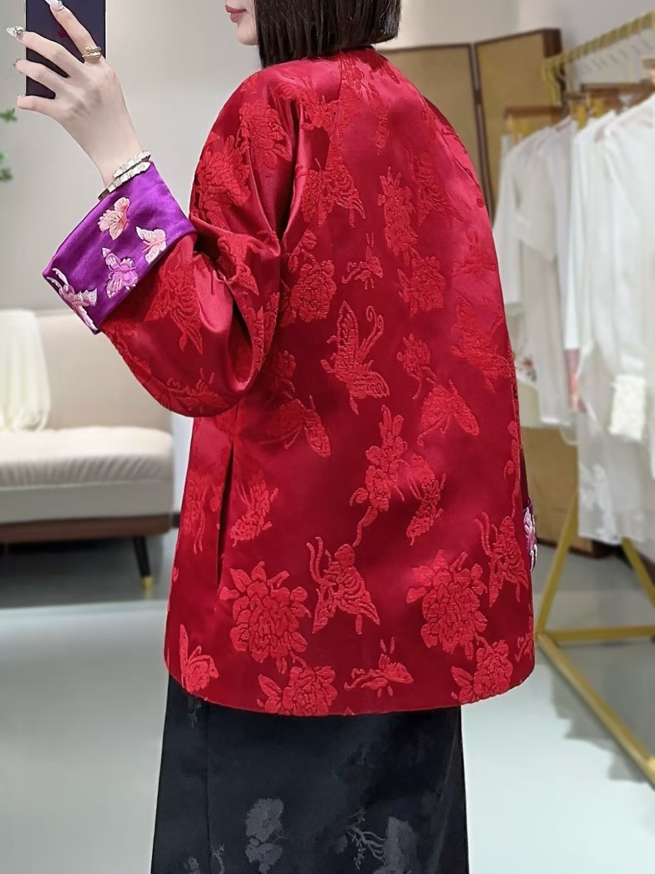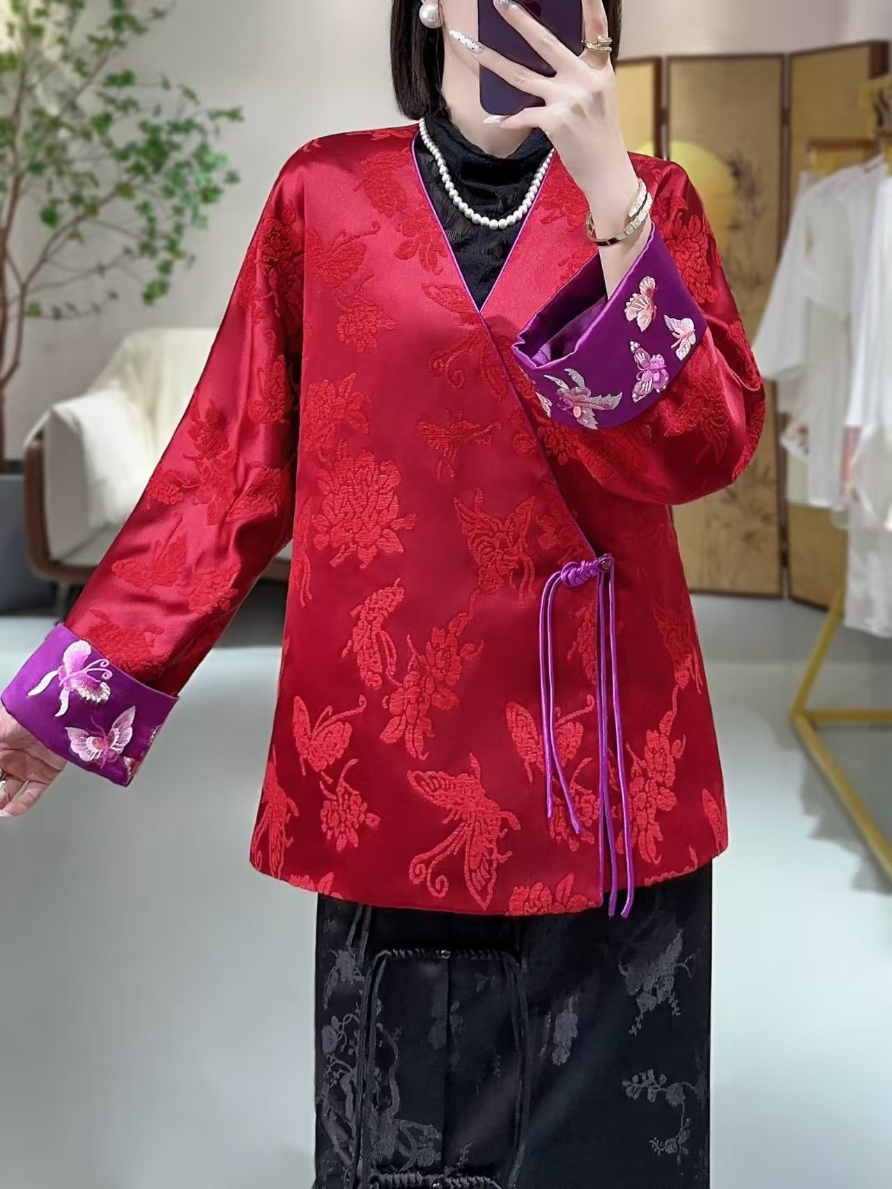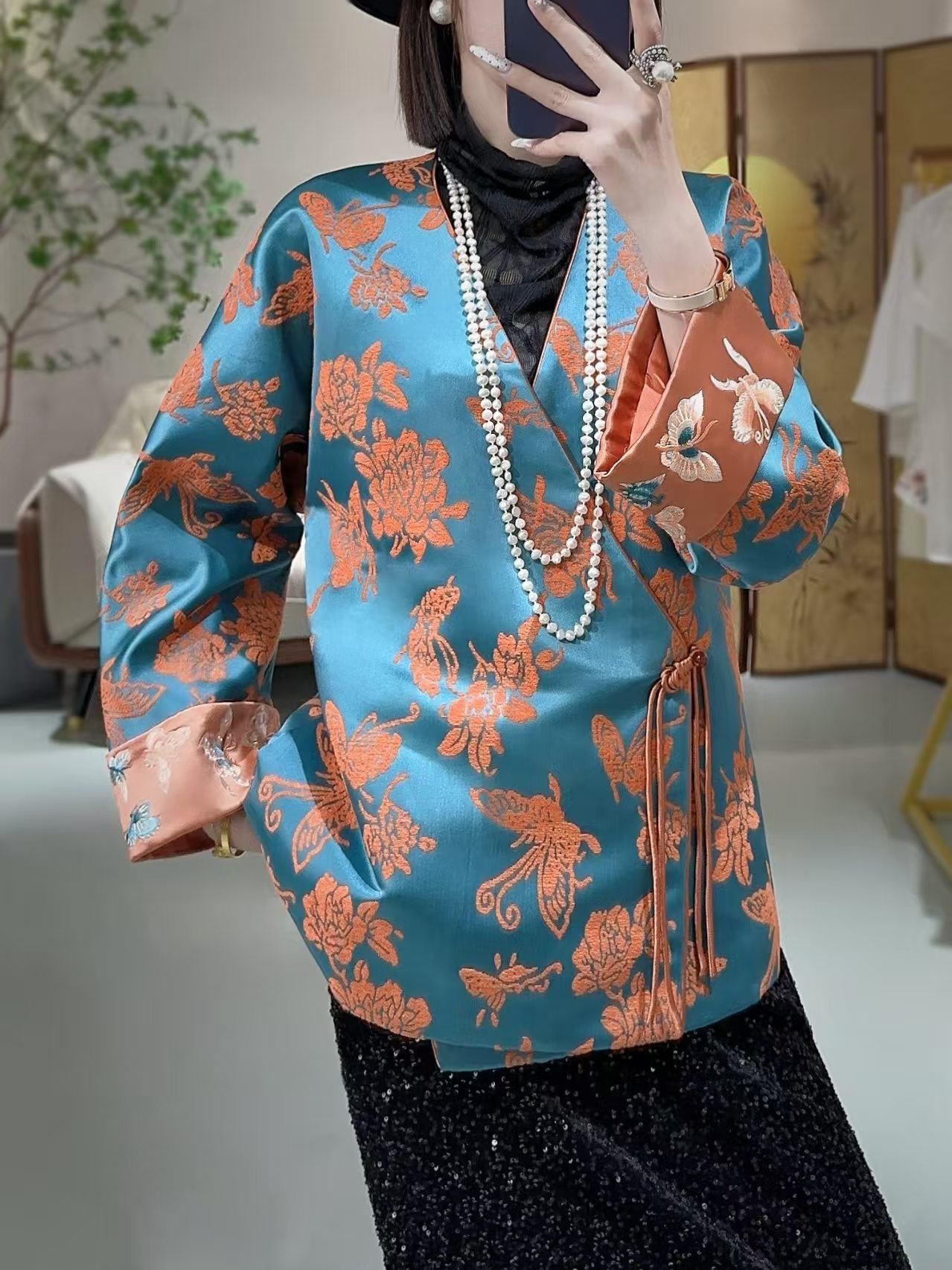 春新款漳绒缎蝶恋花提花百搭新中式斜襟外套KDS-2610
