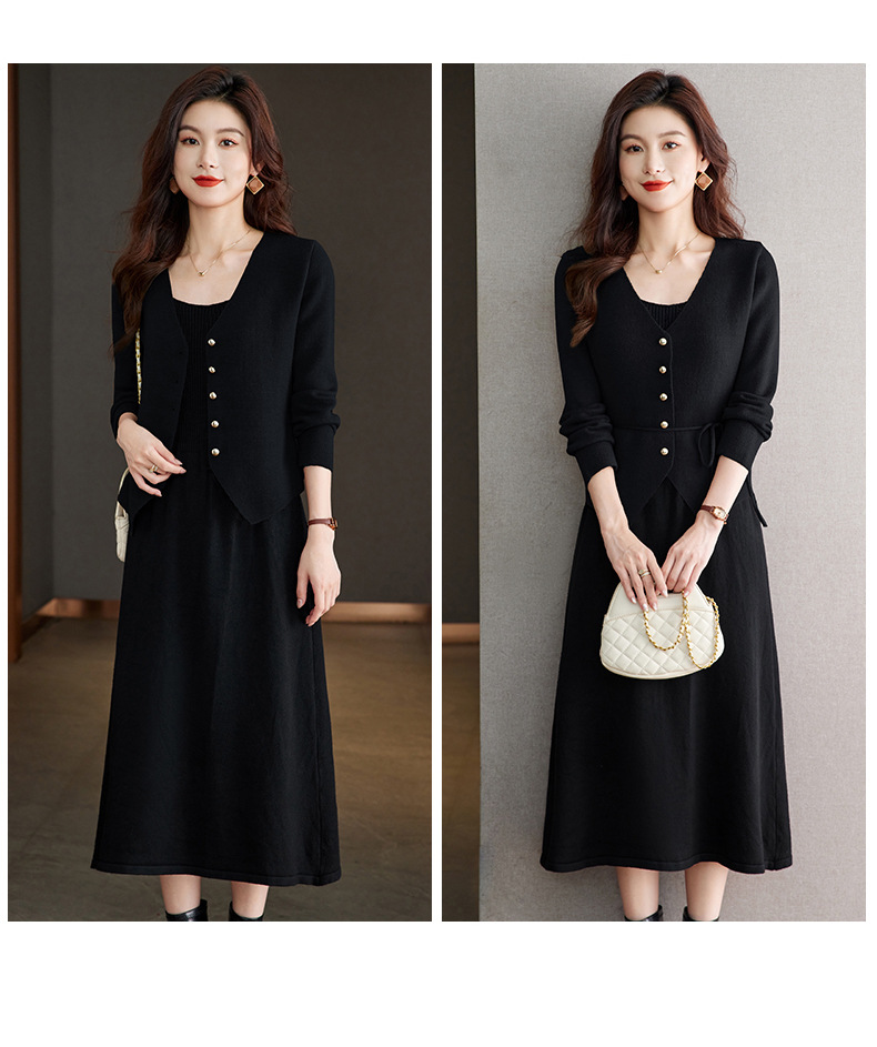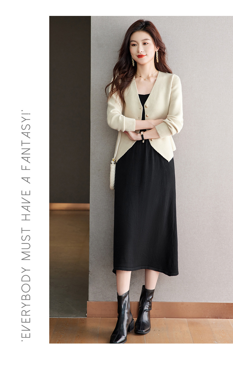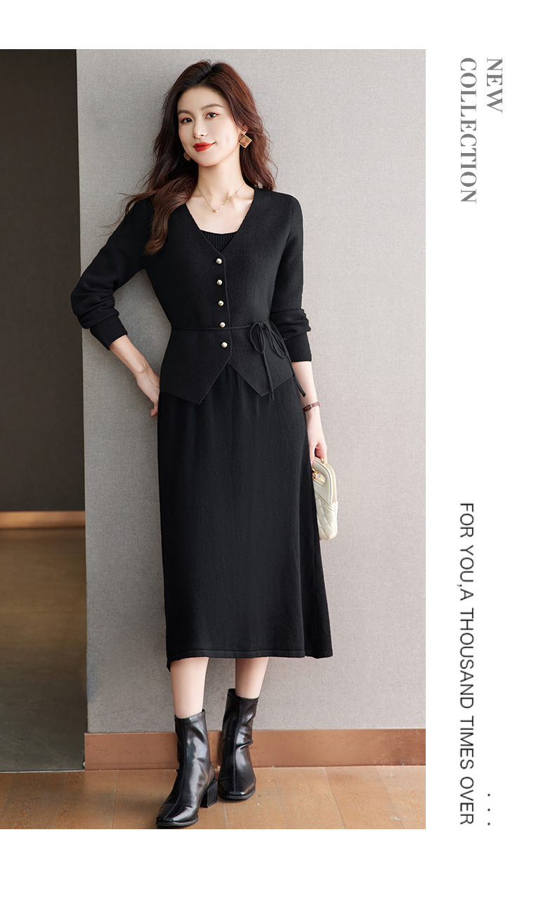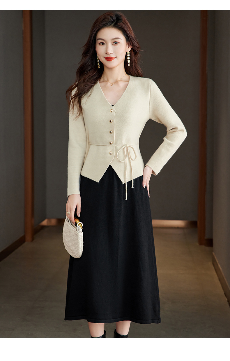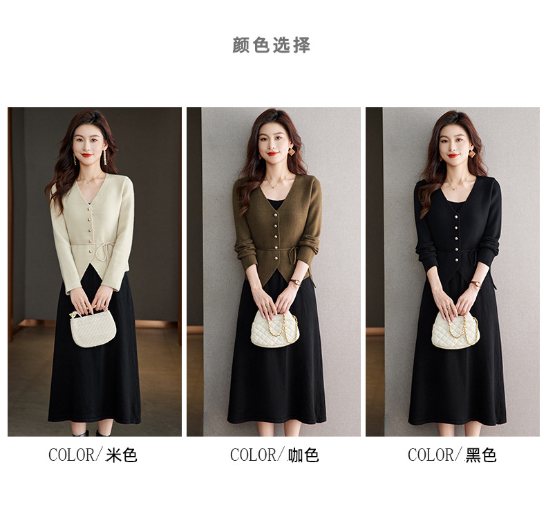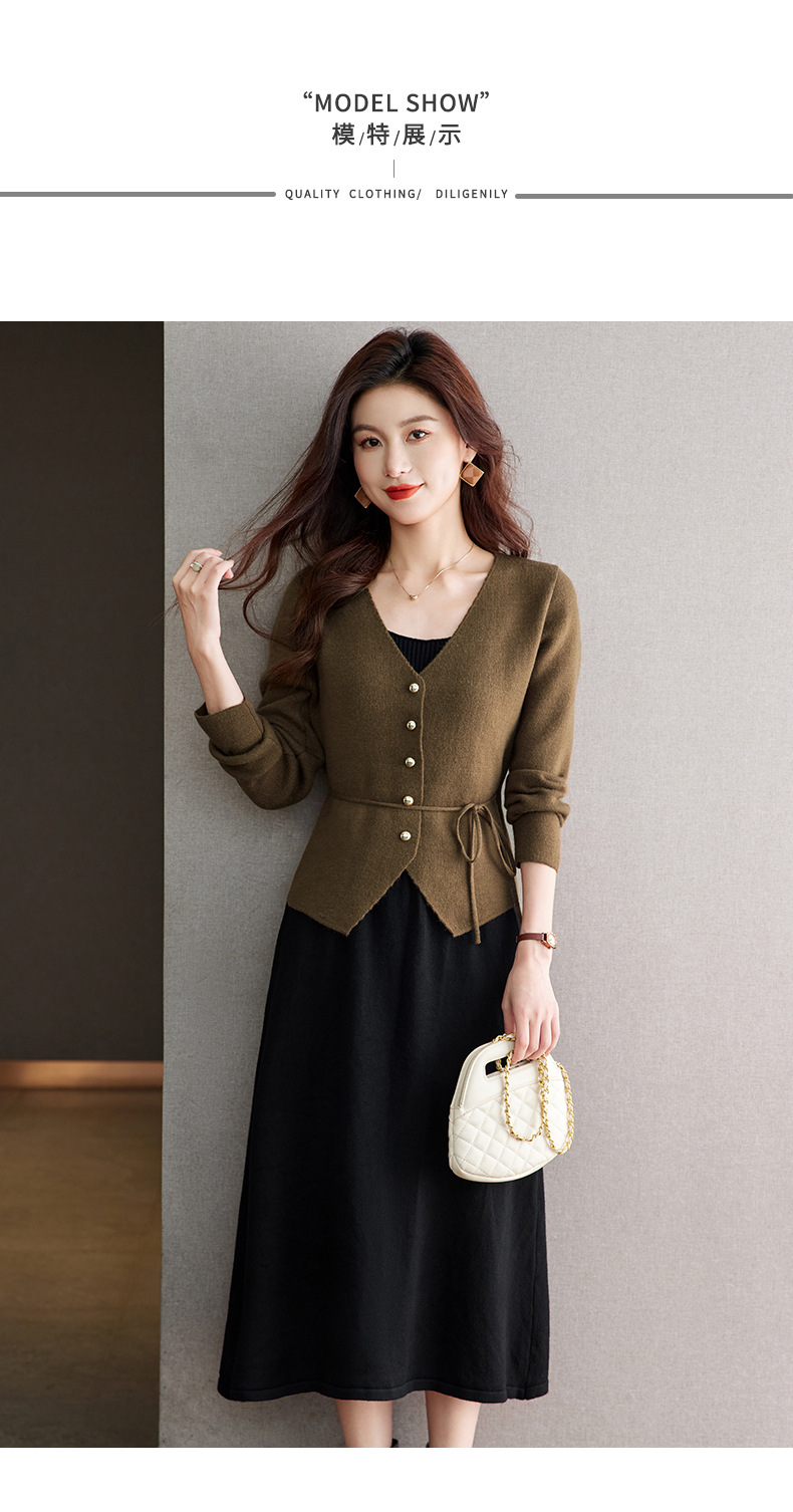 时尚套装V领针织开衫搭配修身收腰连衣裙两件套CC&22-1307