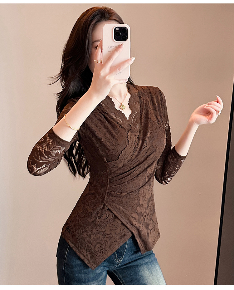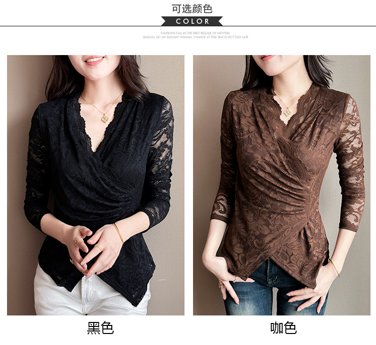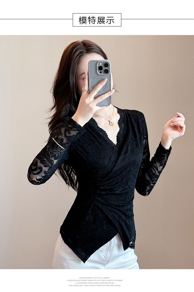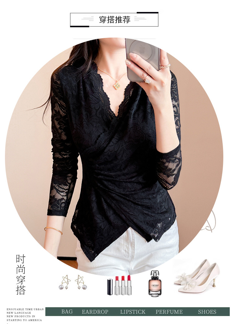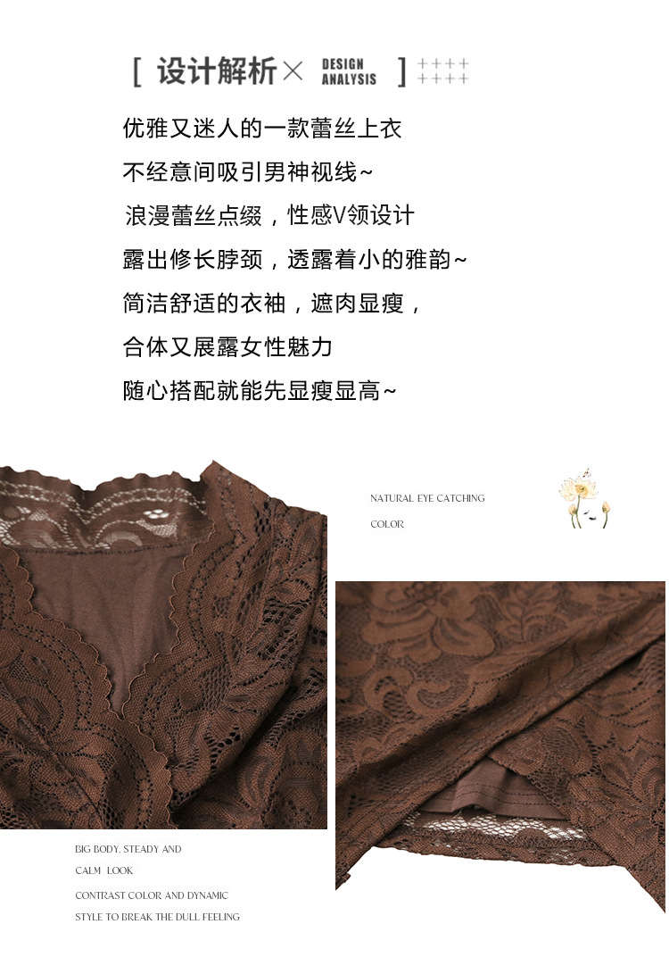 KQL 311H9176新款V领蕾丝打底衫遮肚显瘦蕾丝衫纯色