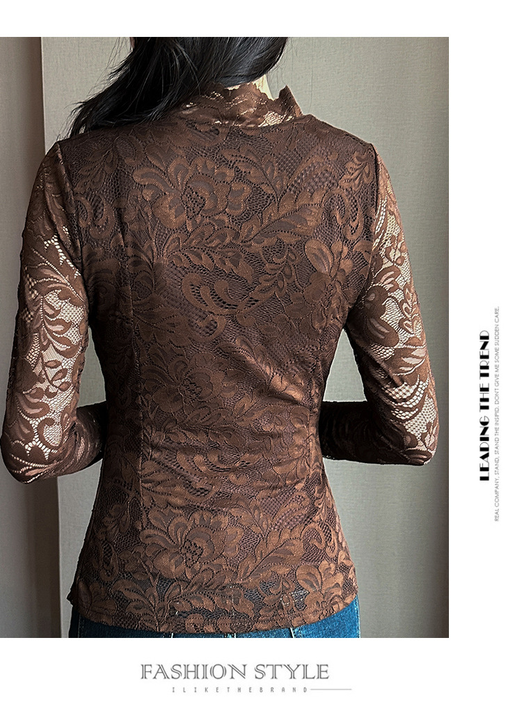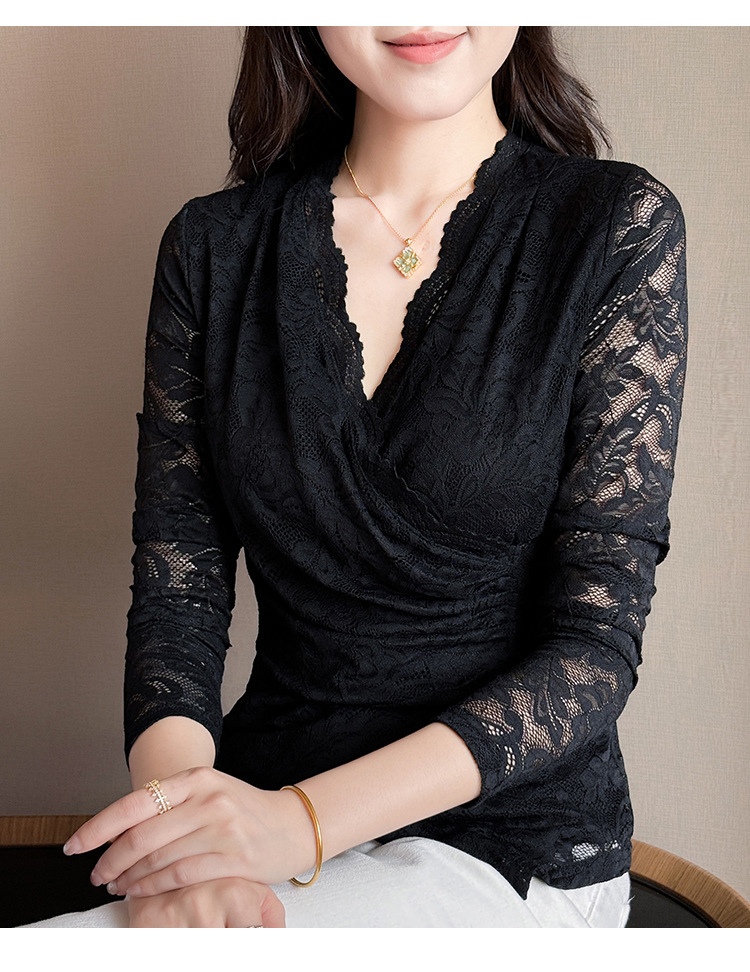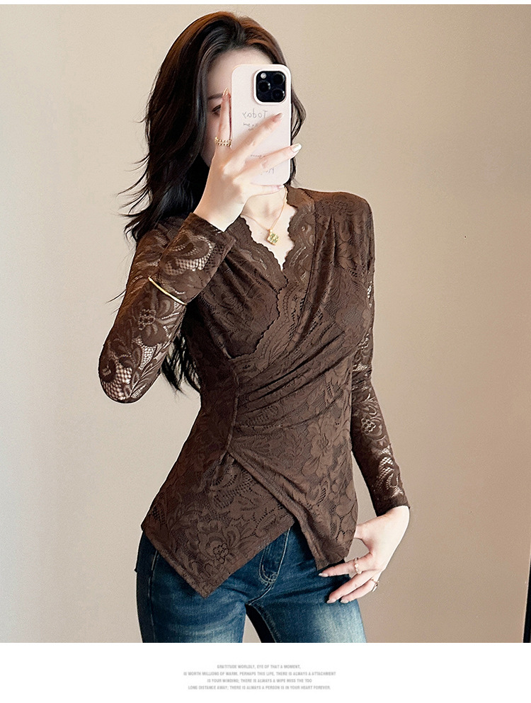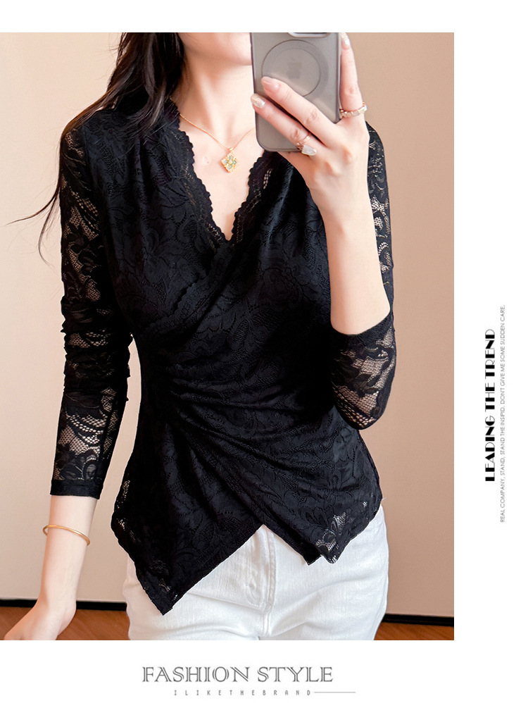 KQL 311H9176新款V领蕾丝打底衫遮肚显瘦蕾丝衫纯色