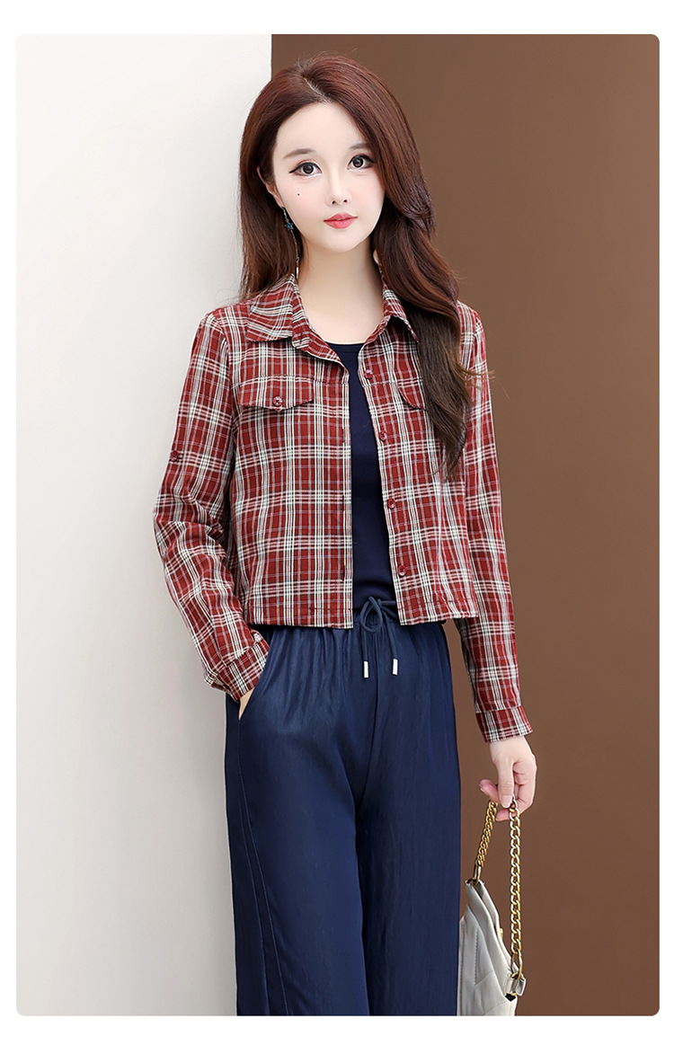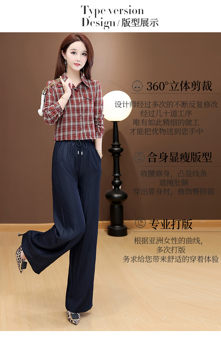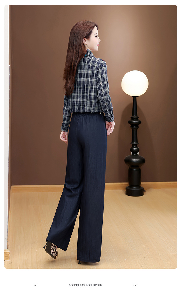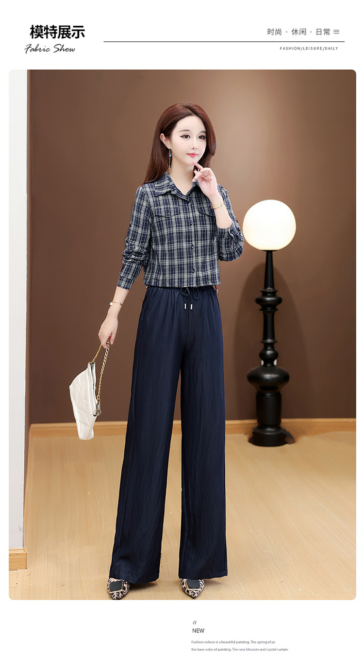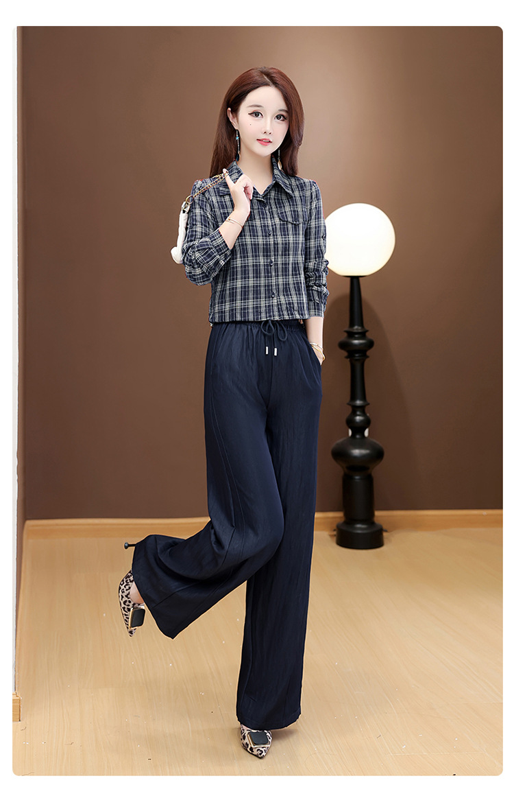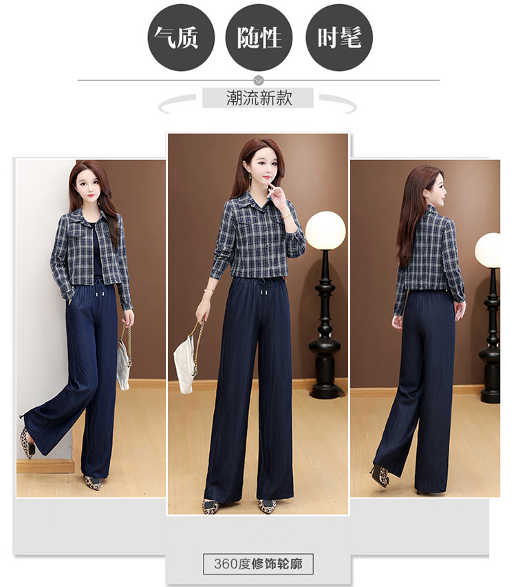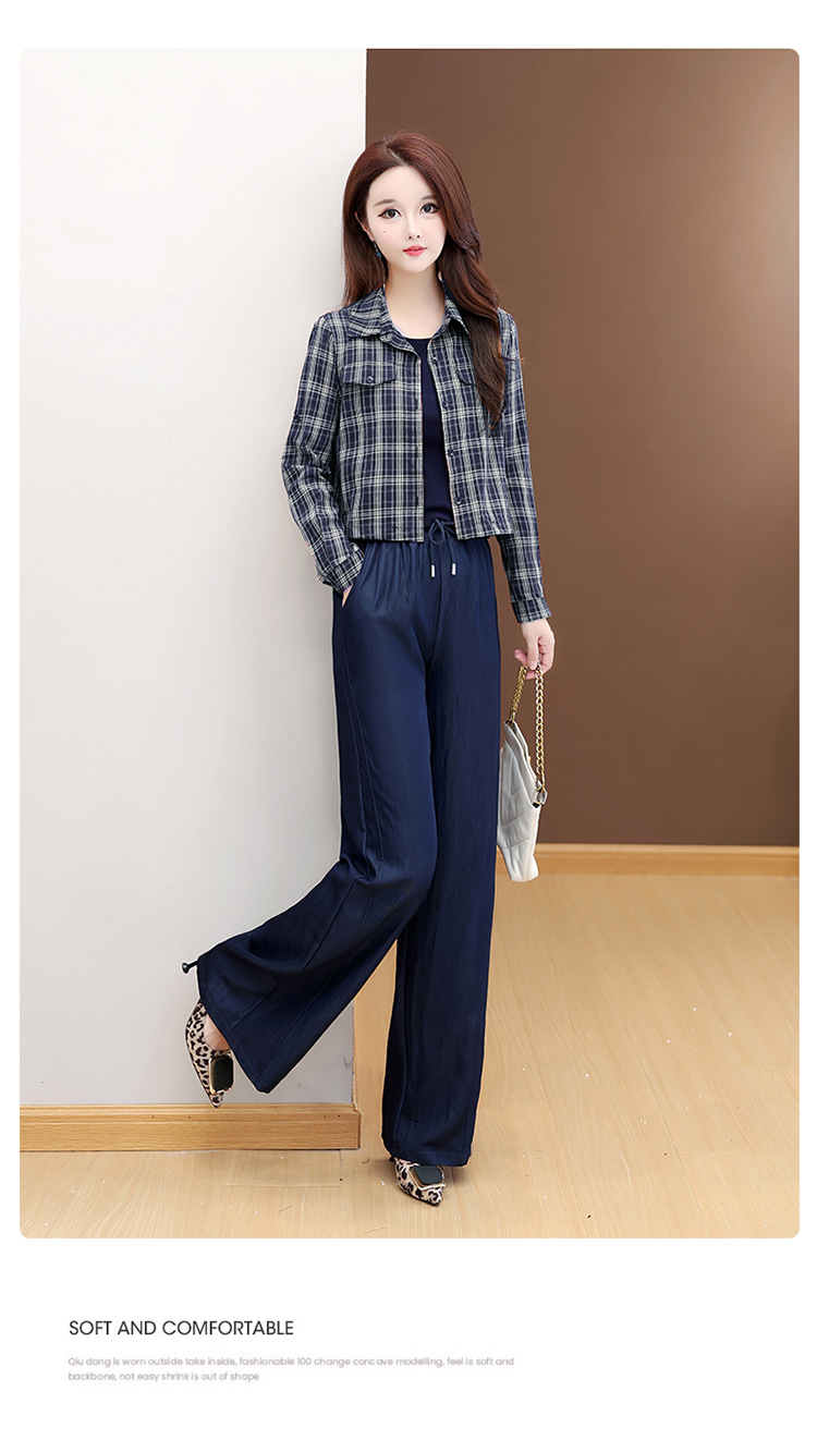 QYM 53B254-Y优雅三件套背心+格纹短款衬衫+高腰直筒阔腿裤套装