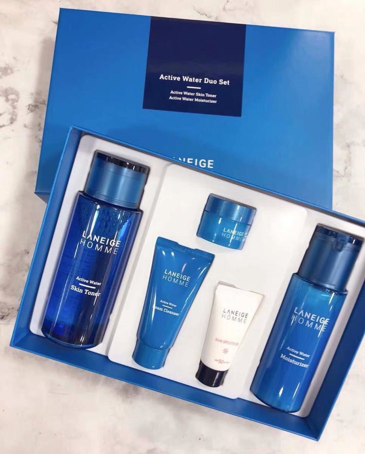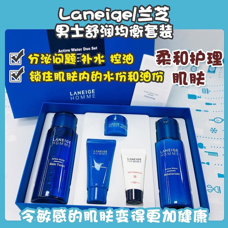 兰芝男士舒润均衡套装👍送男友送老公的套盒👨,清爽轻盈的使用感🍃, 在干燥的肌肤表面形成水份膜💦, 锁住肌肤内的水份和油份✔,柔和护理肌肤〰赐予因都市有害环境而疲惫的肌肤以镇静修护效果💆,令敏感的肌肤变得更加健康,赐予肌肤轻盈润泽感🙇。这套水乳主要针对👉男士水油分泌问题,补水、控油,使皮肤达到水油平衡的完美状态〽。套盒包括:水180ml➕乳125ml➕面霜15ml➕洗面奶30ml➕防晒霜15ml。