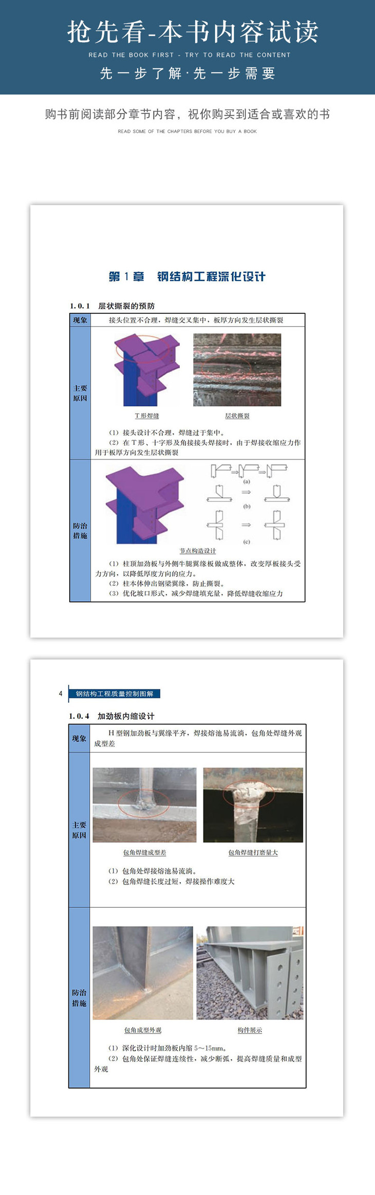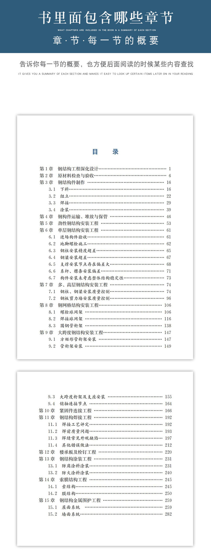 本书基于已建、在建且有代表性的钢结构项目施工实例,结合国内钢结构施工的最新成果和现行相关规范规程及标准进行编写,由钢结构工程深化设计,原材料检查与验收,钢结构件制作,钢构件运输、堆放与保管,单层钢结构安装工程,多、高层钢结构安装工程,劲性钢结构安装工程,网格结构,大跨度钢结构安装工程,紧固件连接工程,钢结构焊接工程,楼承板及栓钉工程,钢结构涂装工程,索膜结构工程,钢结构金属围护工程十五章组成,基本涵盖了钢结构工程从制造厂到现场施工关键工艺做法