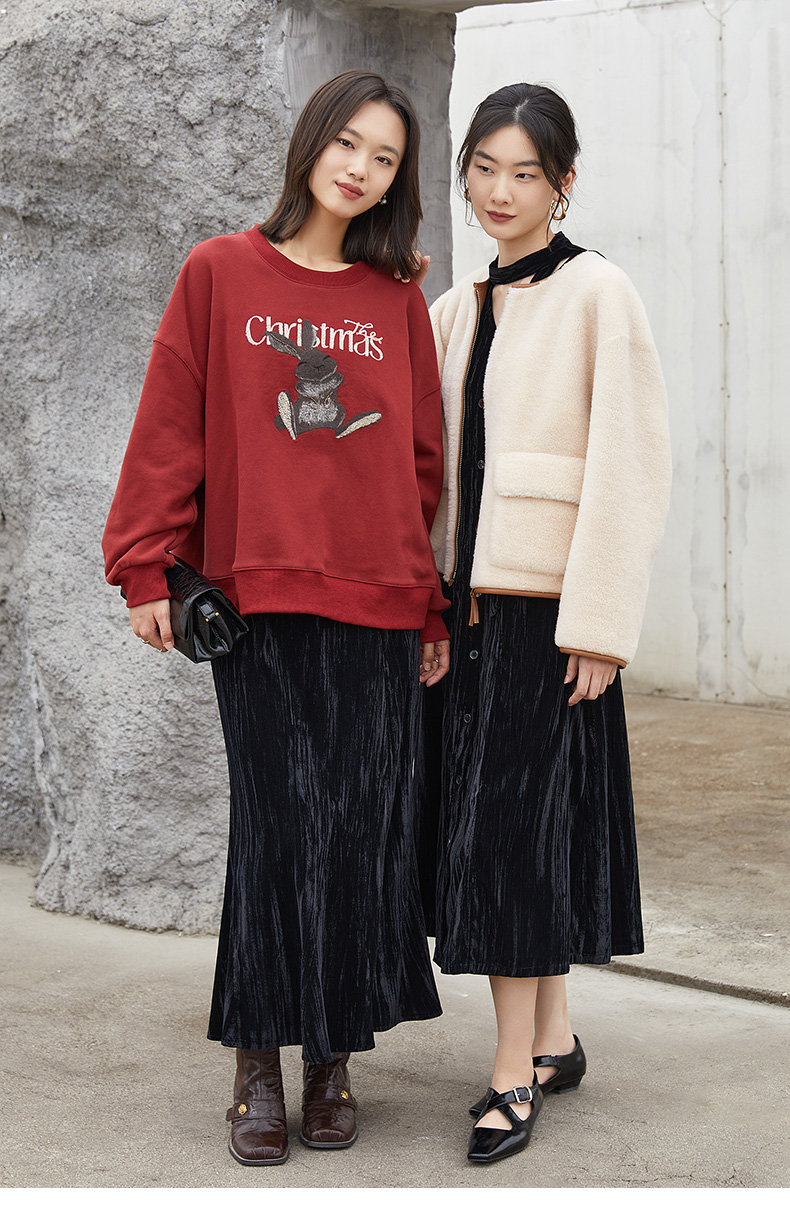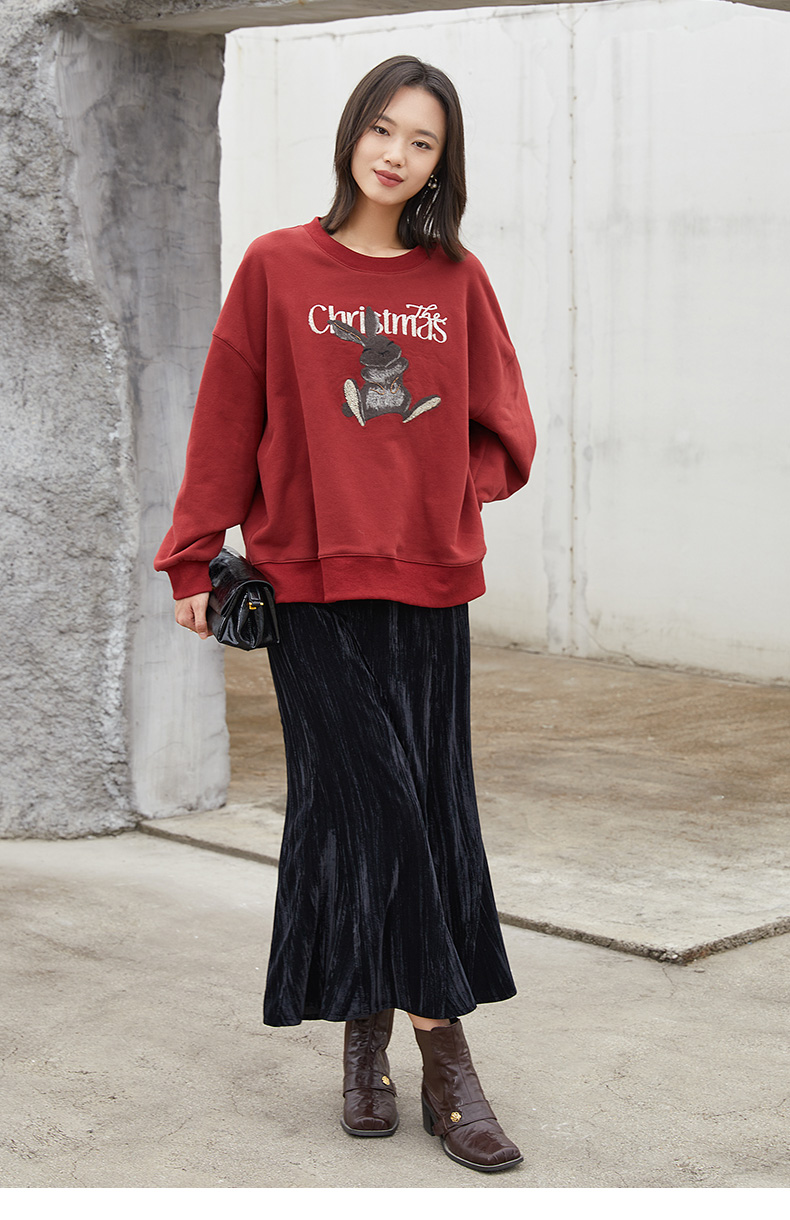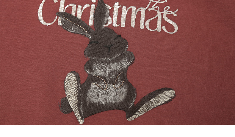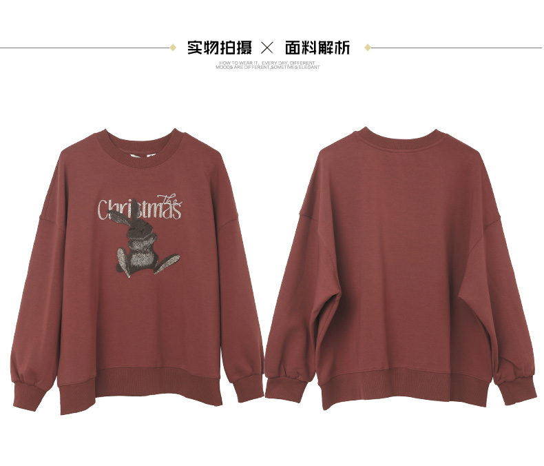 酒红色圣诞主题圆领卫衣 亮片兔子字母印花宽松落肩袖休闲显瘦秋冬节日氛围百搭上衣
